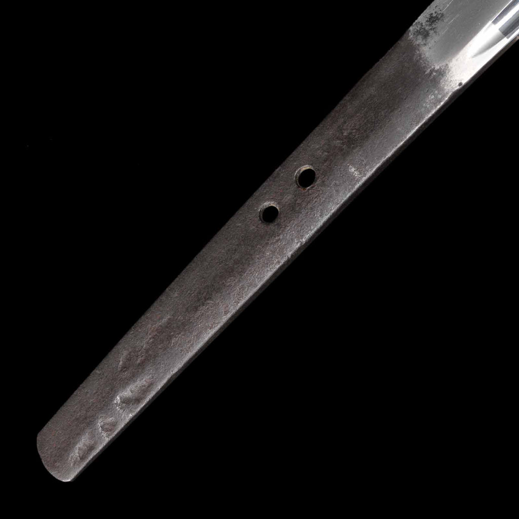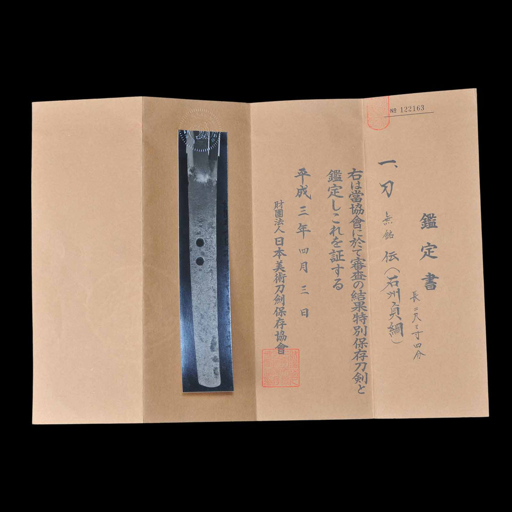 Although the Nakago has two holes for mekugi and is unsigned, the Society for Preservation of Japanese Art Swords has authenticated this piece as a genuine Sadatsuna katana and certified it as tokubetsu kicho, meaning it is worthy of special preservation for future generations, and issued a certificate of recognition in April 1991.