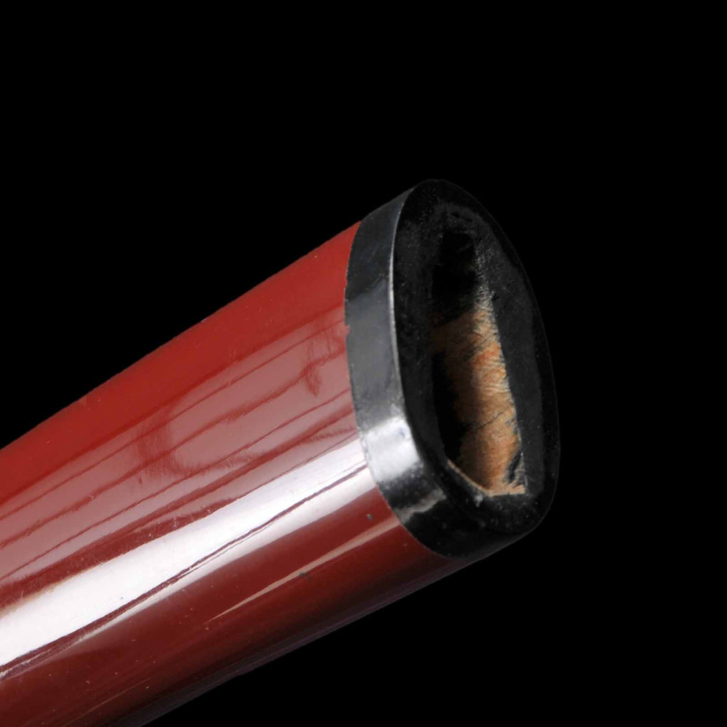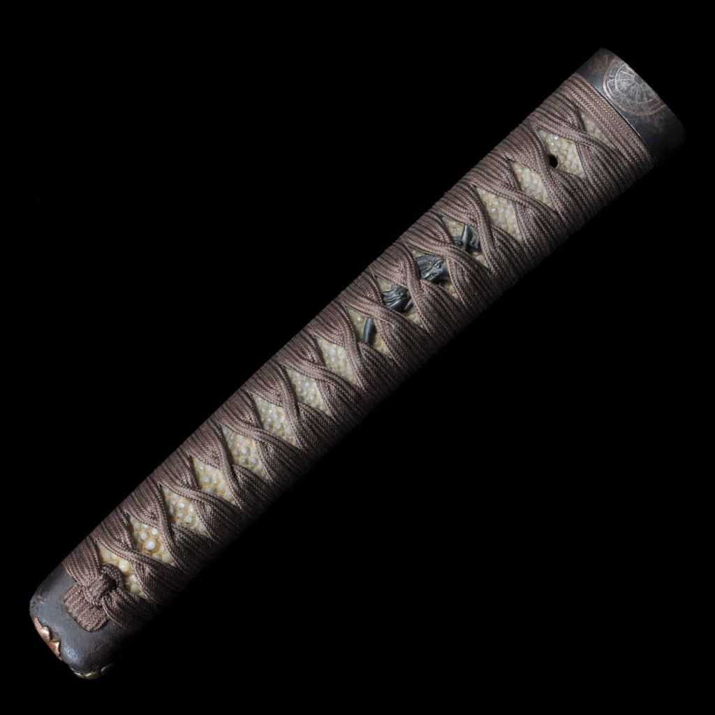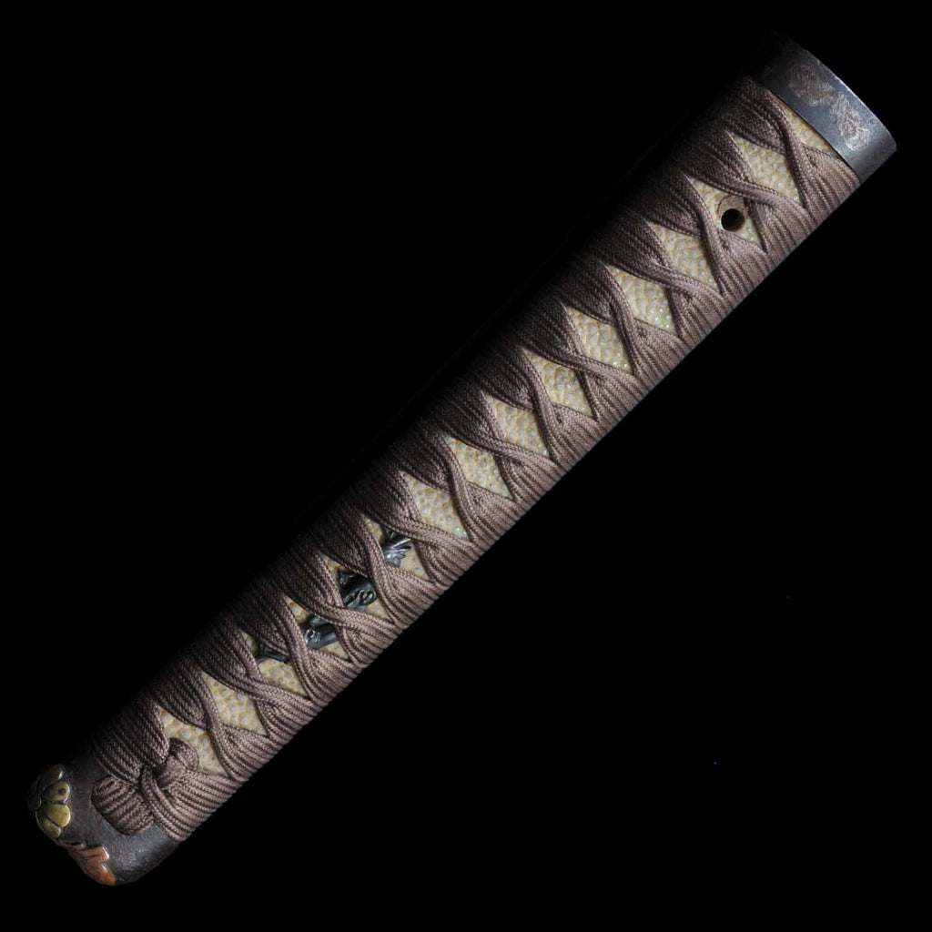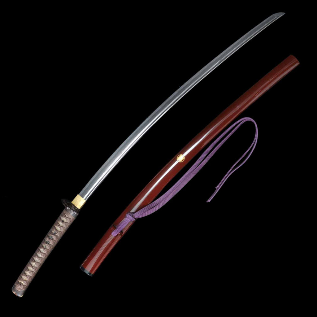 - Koshirae: Brown silk Tsuka with crimson Tamenuri-lacquered Saya, Shirasaya