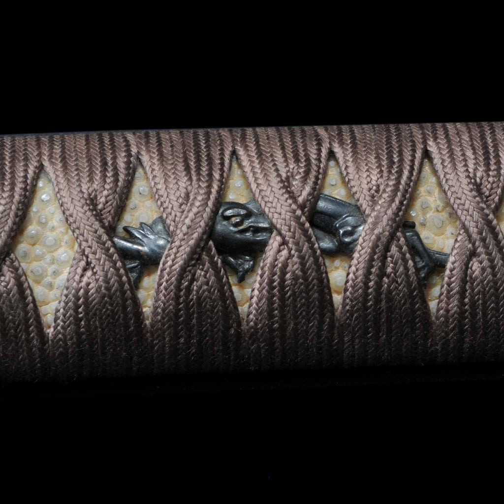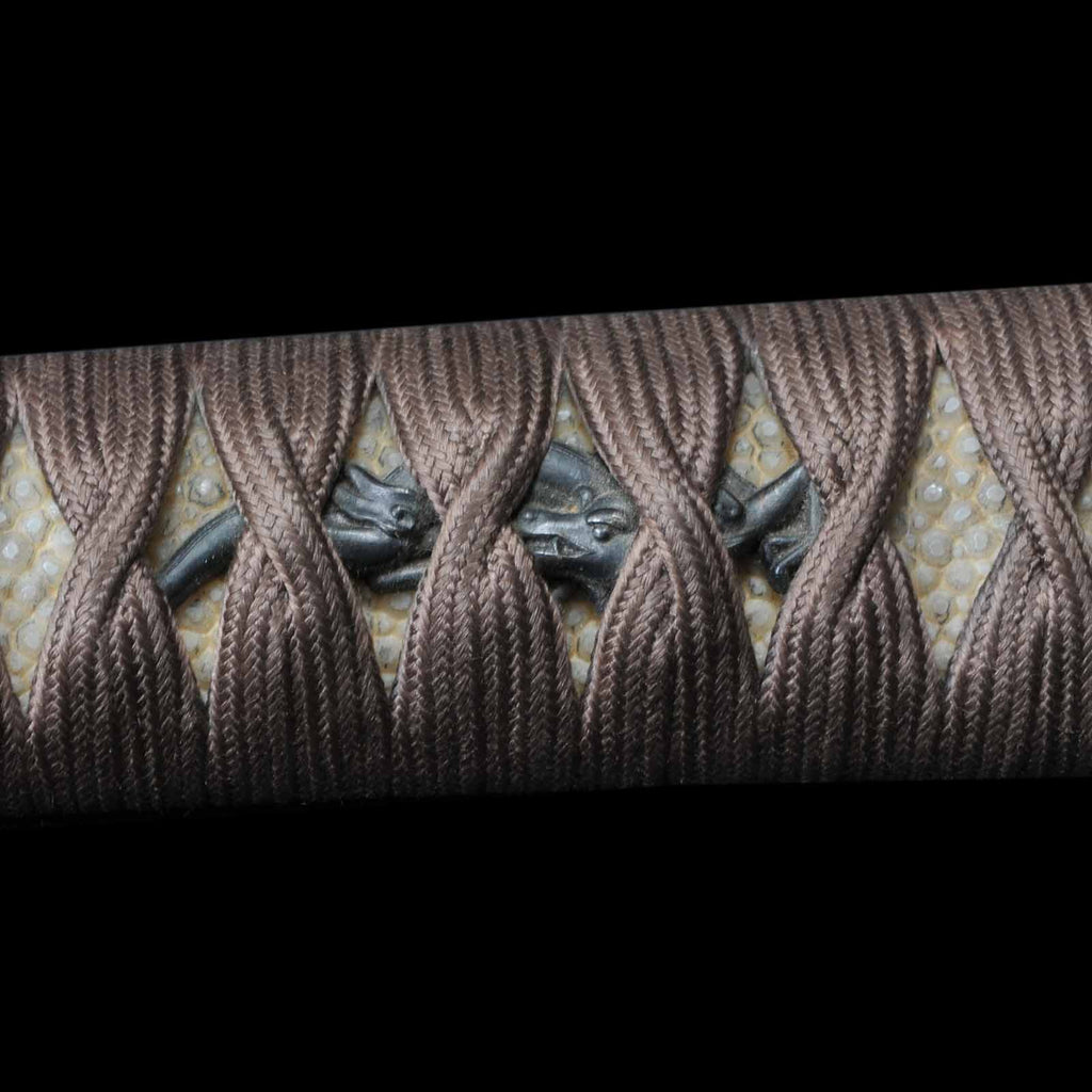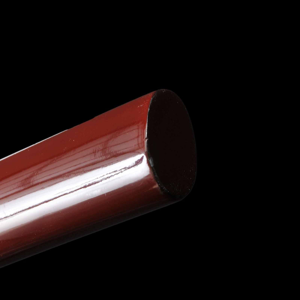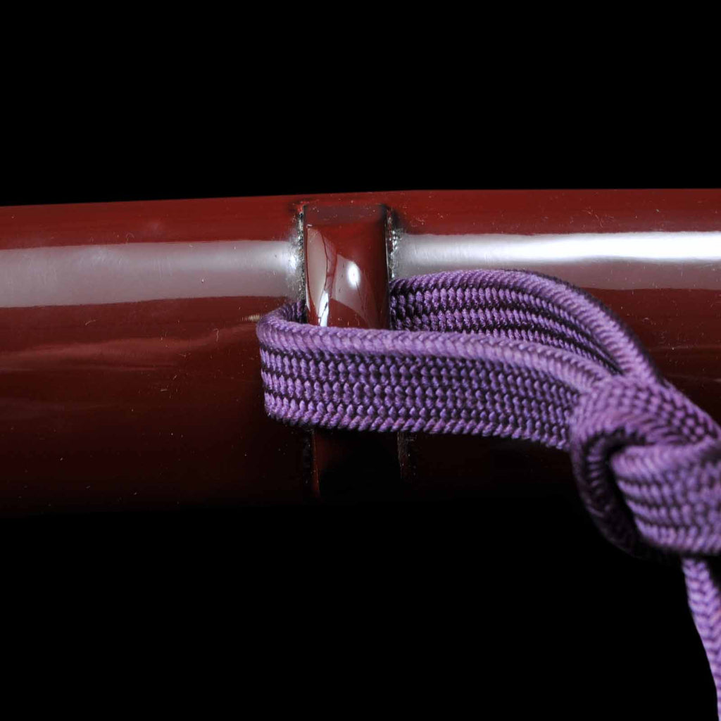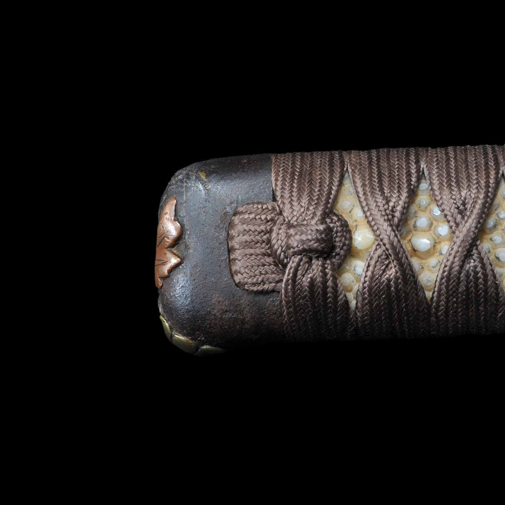 - Koshirae: Brown silk Tsuka with crimson Tamenuri-lacquered Saya, Shirasaya