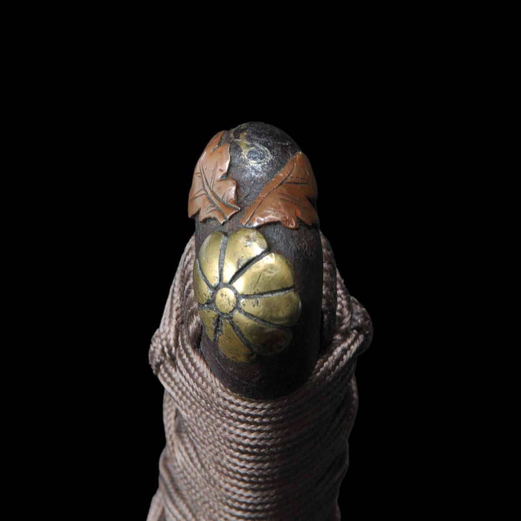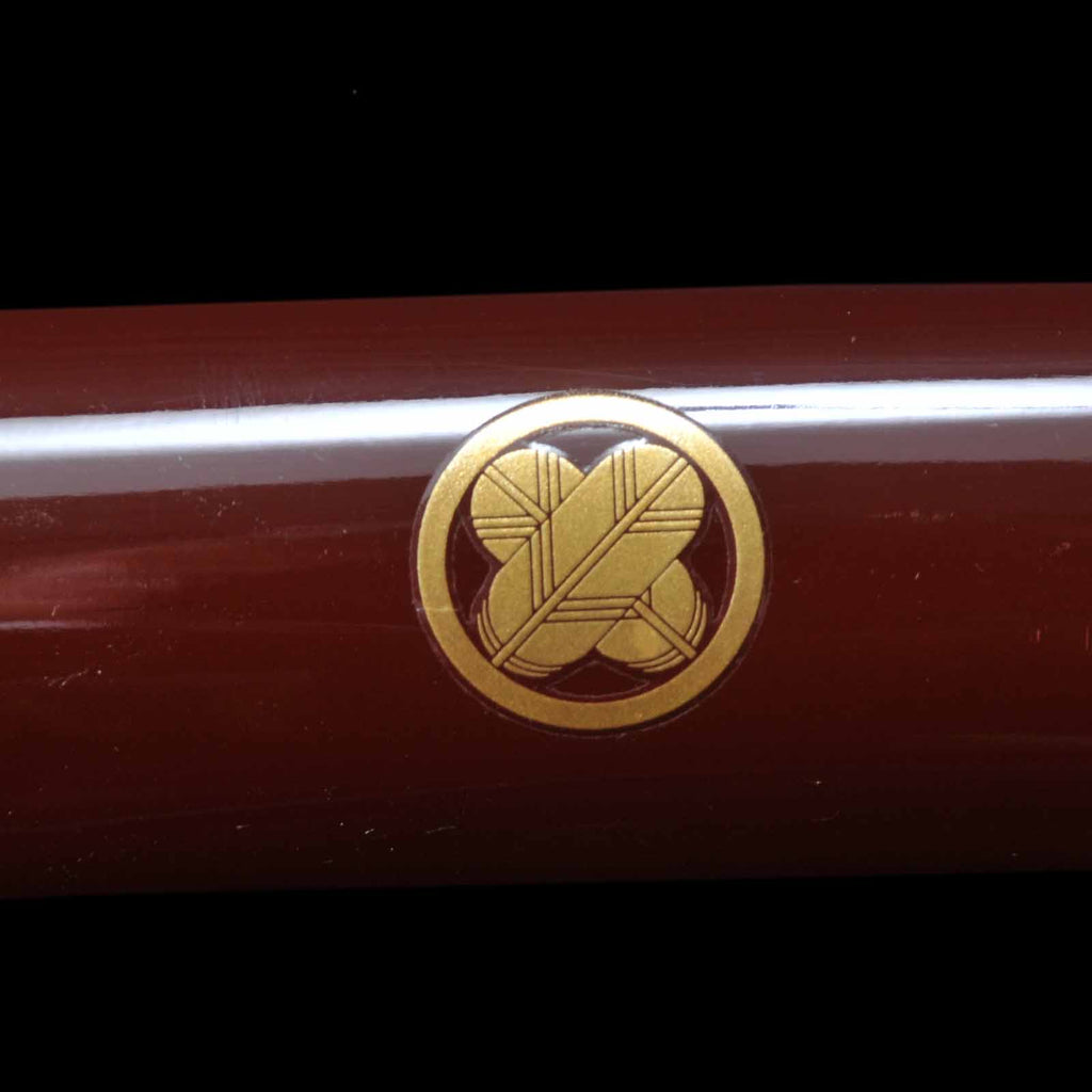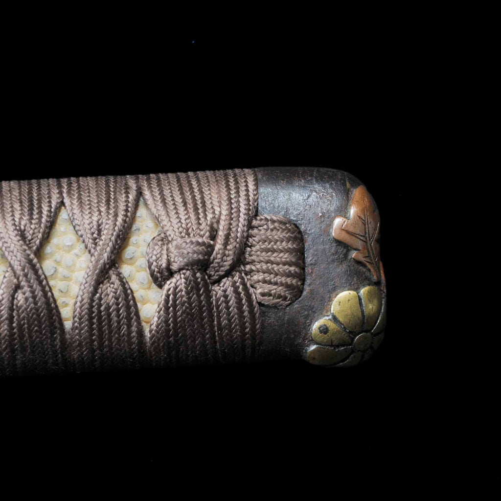 The koshirae is in the style of uchigatana, with a very bright and distinctive crimson tamenuri. The center of the scabbard is decorated with the family crests of Maruni Chigai Takanoha, which were used by many feudal lords in the Edo period. The tsukamaki is a light brown silk cord wrapped in the style of a tsuma-maki. The fuchikashira, menuki, and tsuba metal fittings are unified by a theme of pine trees, chrysanthemums, and other plants.