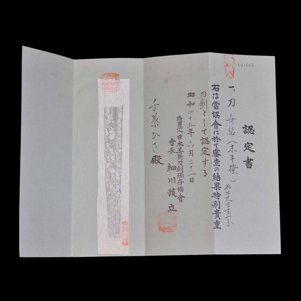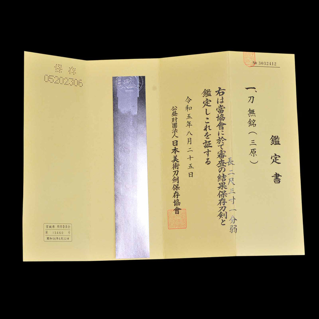 In 1970, the Society for Preservation of Japanese Art Swords appraised this work as a specially valuable sword from the late Tegai school and issued a certificate for it. In 2023, a new appraisal was conducted, and this time, it was given a different rating than the previous appraisal, stating that the sword is a work of the Mihara school and worthy of preservation for future generations.