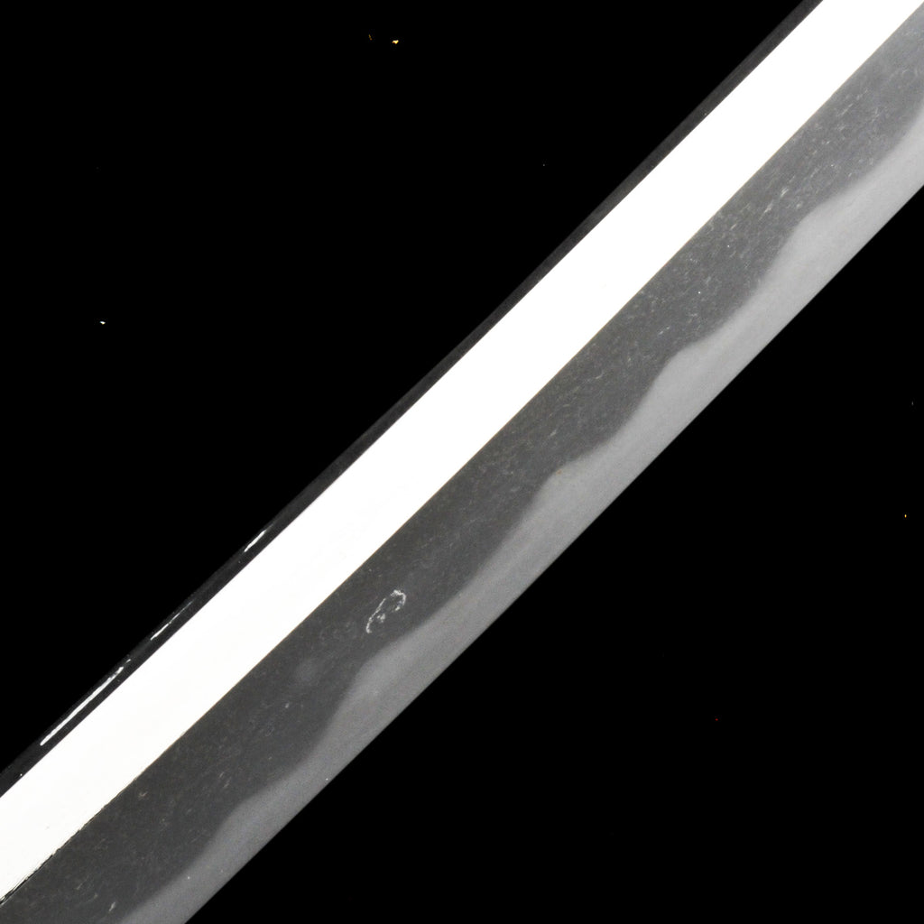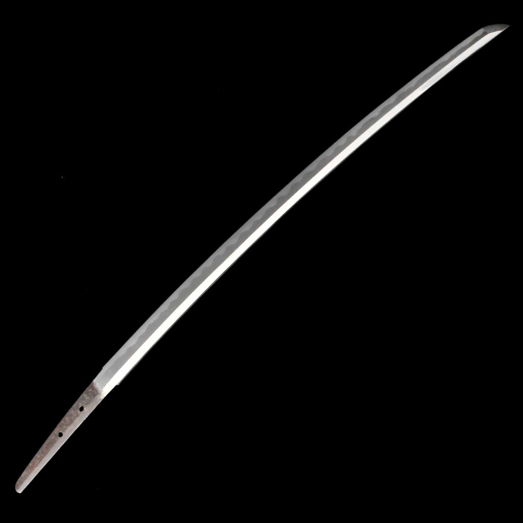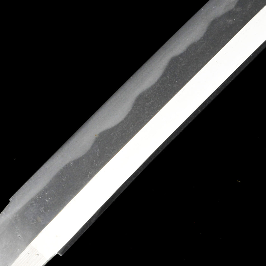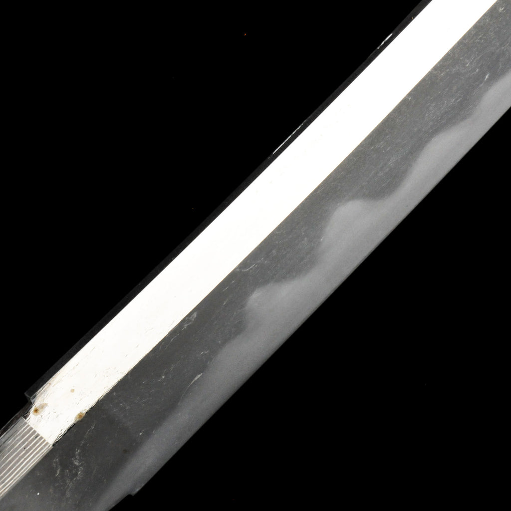 The blade is relatively well preserved, with no rust, chips, or other defects, but there is a spot on the sashiomote side about 10 cm from the habaki that is fukure-like. There are also some fukure marks about 18 cm from the habaki on the sashiura side as well as two cloudy white dots at a point about 30 cm from the habaki on the sashiura side.