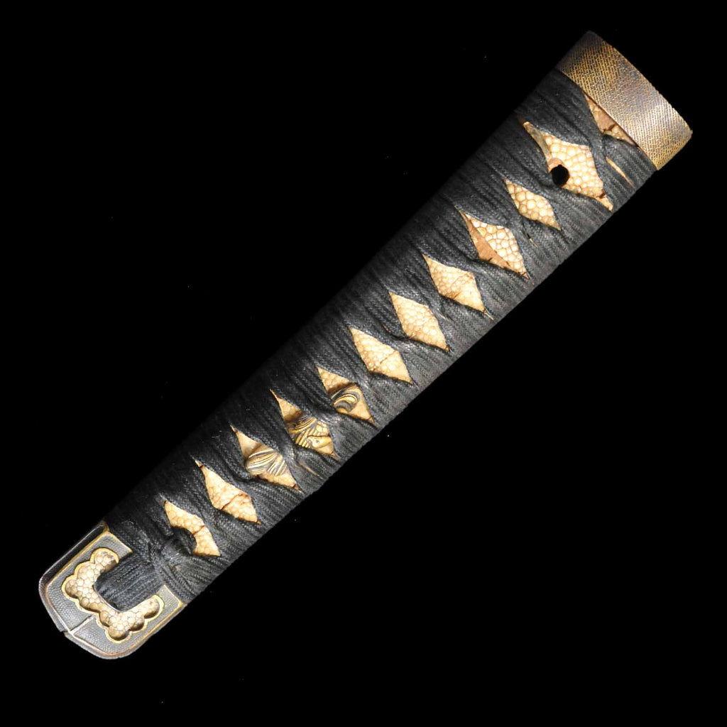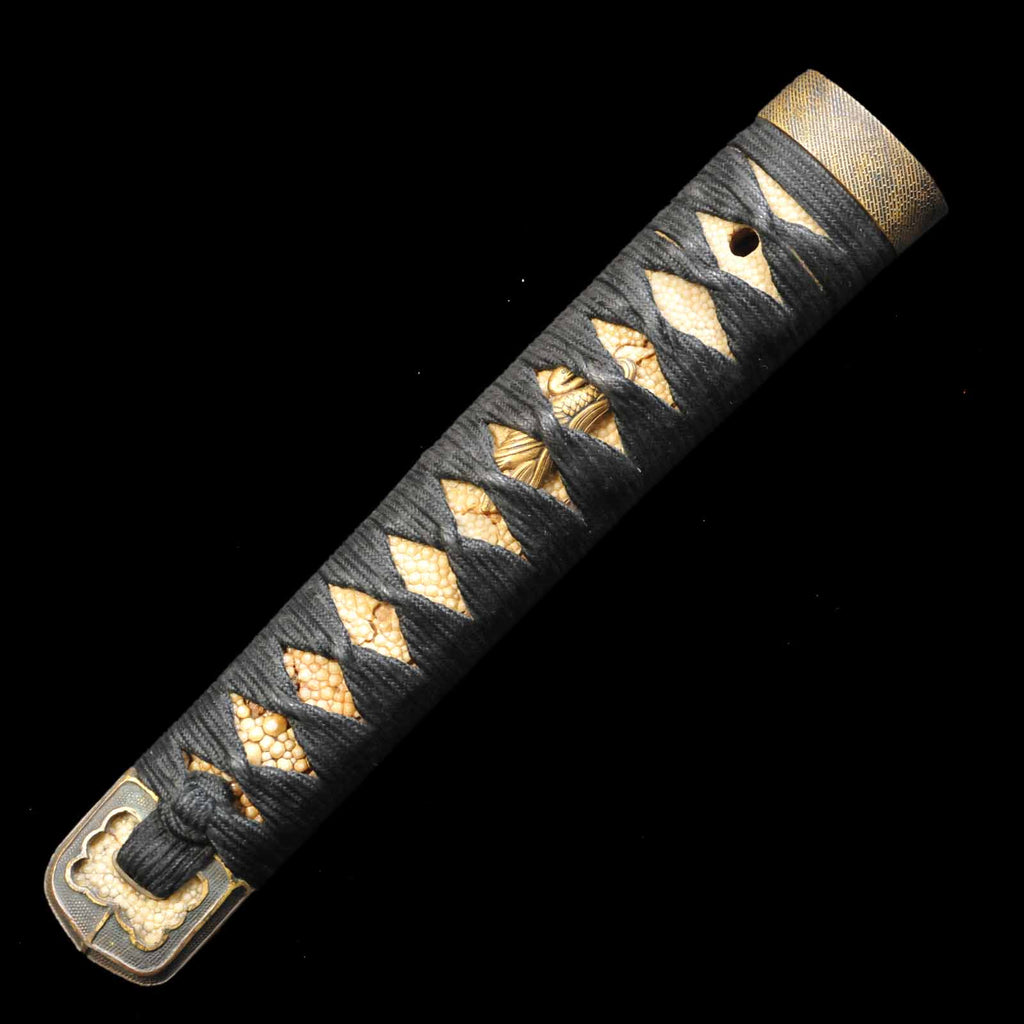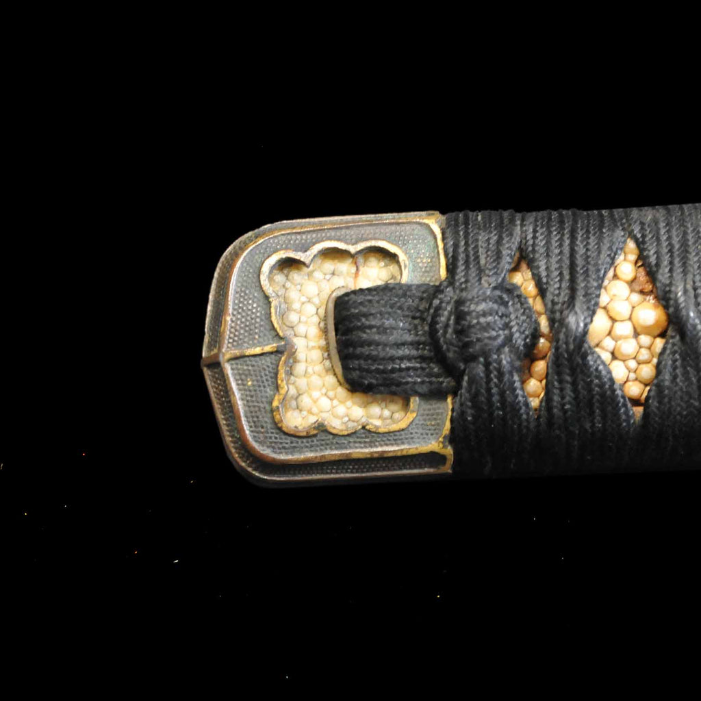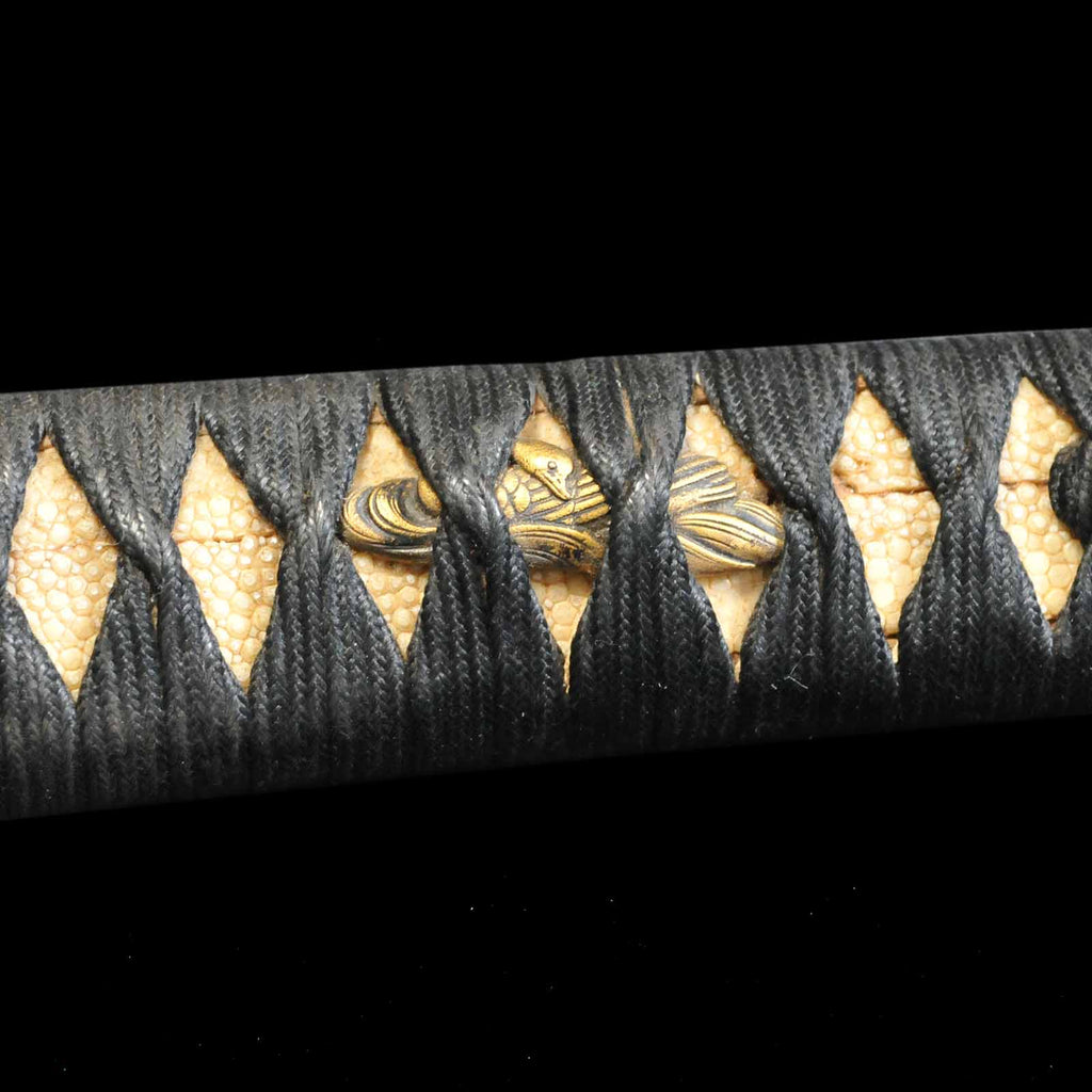 The fuchi kashira is in the style of handachi, and the tsuka has repair marks from tsukasame when it was rewrapped. It comes with a black scabbard, which has been fitted with a ready-made scabbard in recent years, but there is a crack in the Koiguchi on the mune side, so a spare scabbard will be provided free of charge.
