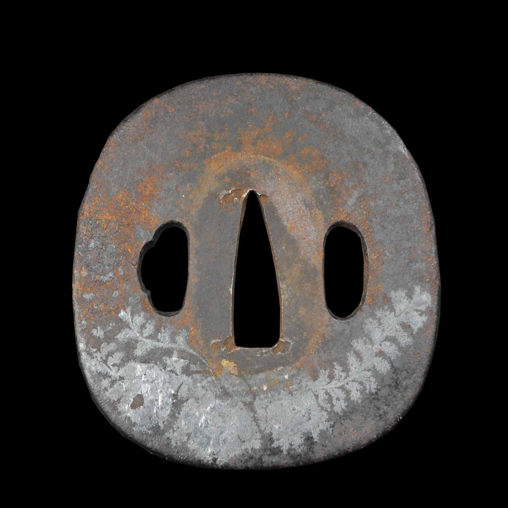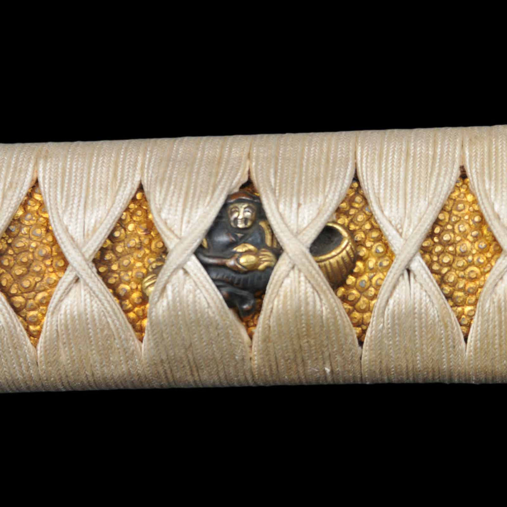 This unsigned sword was made in the Koto period and is in good condition considering its age. There are no flaws or dents, and the surface is not clouded. Originally about 74 cm long, it is assumed that it was shortened in later years. Chikei is visible on the hada of the itame. The hamon is notare mixed with midare. With kakinagashi grooves engraved, this sword ideal for iai. The tsuka handle is wrapped with beige-colored silk cord, and the tsukasame is colored gold for a fashionable finish. The tsuba, menuki, and fuchikashira are original, and the menuki and fuchikashira feature rice crops and Daikokuten, the god of wealth, symbolizing a rich harvest. The tsuba, made of iron, originally had three paulownia crests painted on it, but they have been worn away over time and are no longer easily distinguishable. The three paulownia crests are also applied to the brownish black Ishime-nuri scabbard. Considering its overall condition, it is being offered at a very reasonable price. This is a highly recommended piece that can be used not only to enjoy the aesthetics of a koto-era sword, but also as a sword for iai and batto.