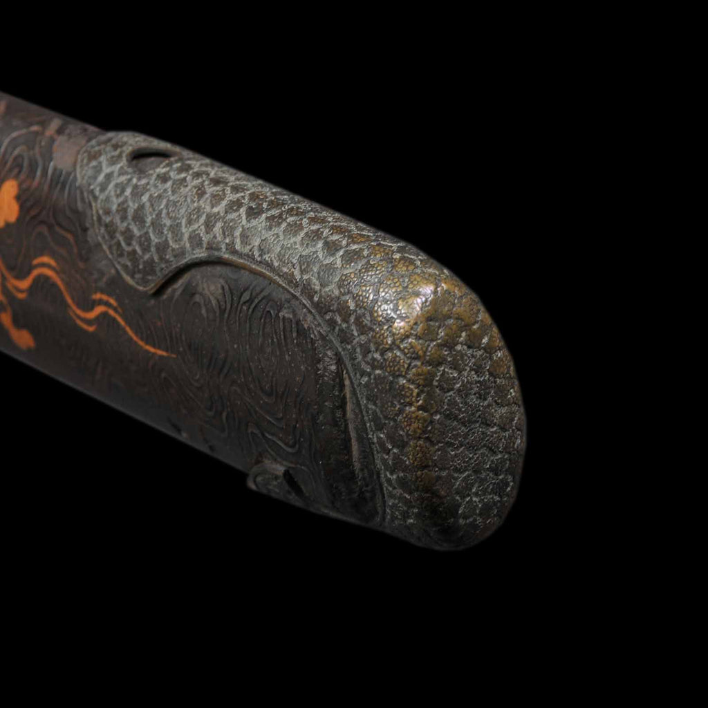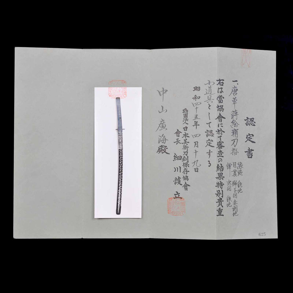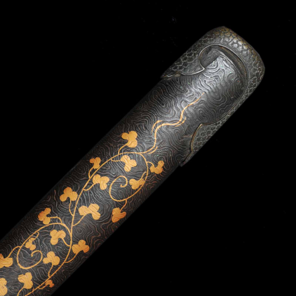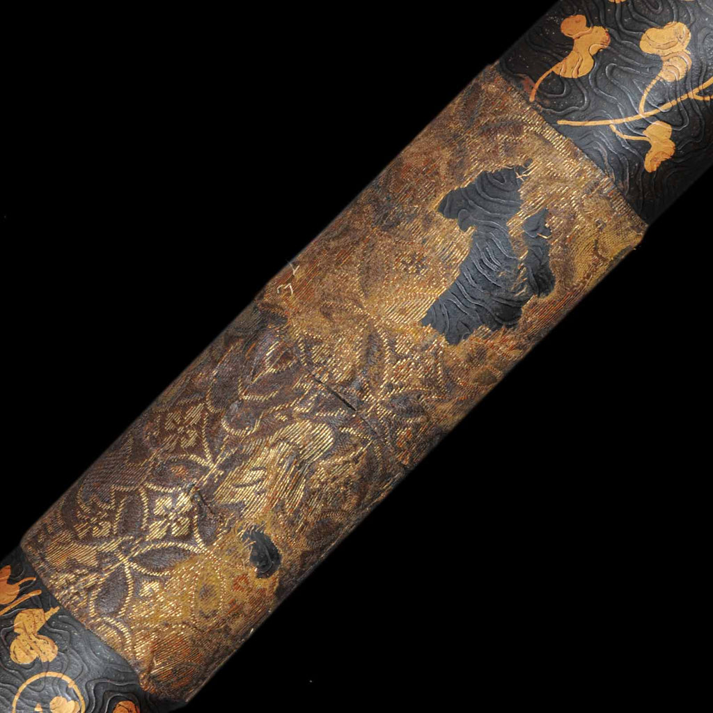This sword was made by Nobufusa in the Land of Yamashiro, and one of its major features is that not only the blade but also the tsuba, fuchi-gashira, and menuki have the NBTHK's certificate of authenticity as Tokubetsu-kicho . From 1948 to 1982, the NBTHK recognized valuable swords under the name Kicho and further swords in better condition were certified as Tokubetsu-kicho. Currently, the new appraisal system is called Hozon and Tokubetsu Hozon, but in any case, both the blade and the fitting ornaments have been evaluated as being exceptionally valuable. The blade is in relatively good condition considering its age, sufficient to enjoy the appreciation, but there are some small black rusts on the mune and blade. The koshirae are complete with both shirasaya and uchigatana. The highlight of the uchigatana koshirae is the elegant scabbard with fine and detailed engraving all over and maki-e-like patterns drawn on it, in addition to the tasteful and valuable fitting ornaments. The kurigata has been removed, and gold brocade fabric from Nishijin has been wrapped around the area where the kurigata was removed. This fabric also has a unique texture due to its age. The kuwagata-shaped Ojiri, further enhances the elegance of this koshirae.
