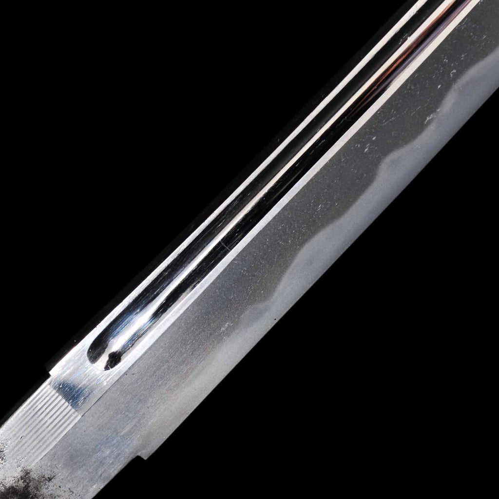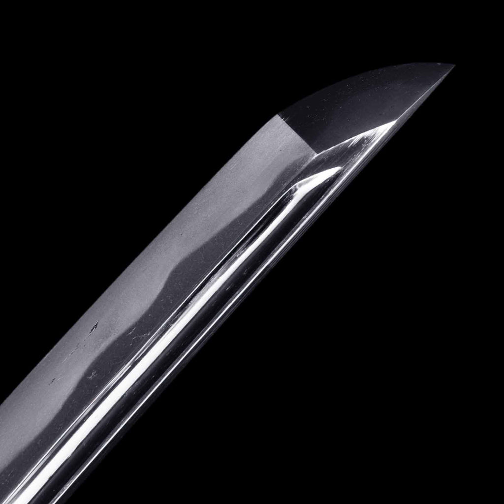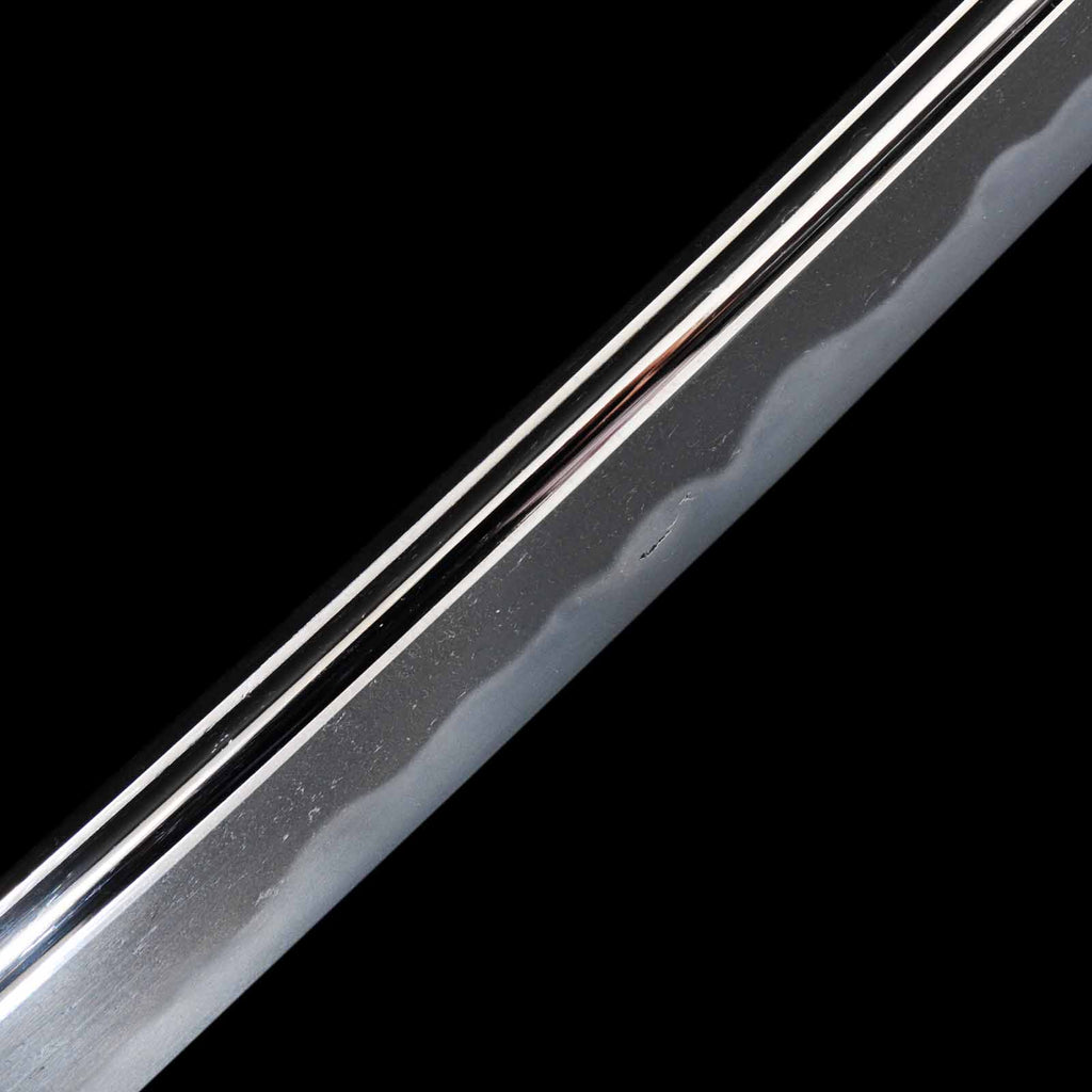 The sword blade is very sound and polished neatly throughout. On the sashiura side, there are shallow cracks in the forging on the habuchi about 19 cm from the kissaki and 16 cm from the hamachi, respectively. They do not affect the functionality, but they do spoil the aesthetics a bit. jigane is a well-packed itame hada with yubashiri also visible. Hamon is a wide and tall gunome with a well-packed nie. It is also elegantly made with fine chojiashi. Both sides of the blade are engraved with grooves. The name Washu Ju Tomomitsu is engraved on the Nakago.
