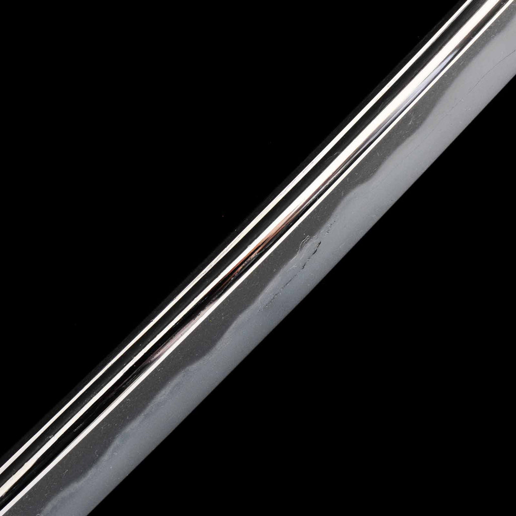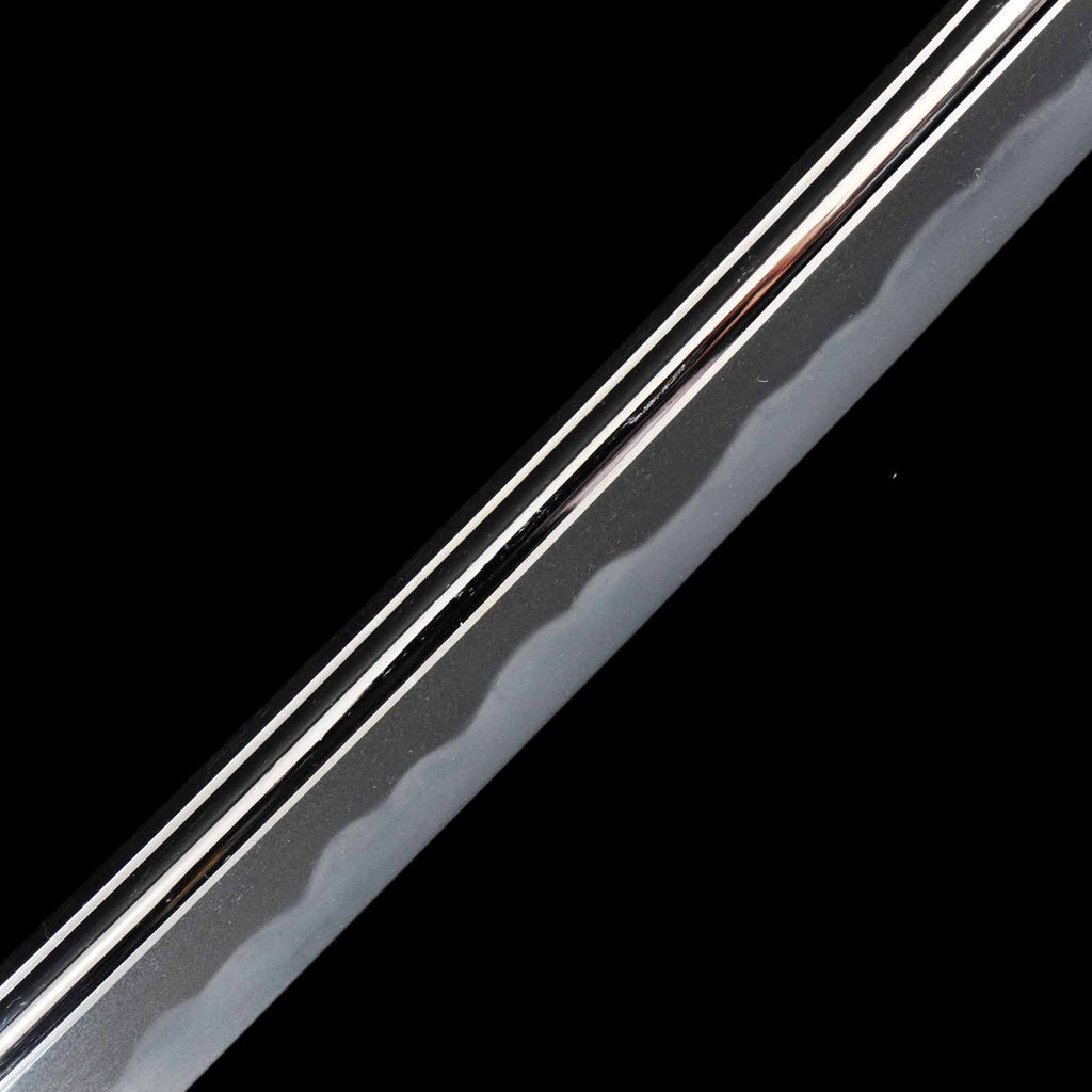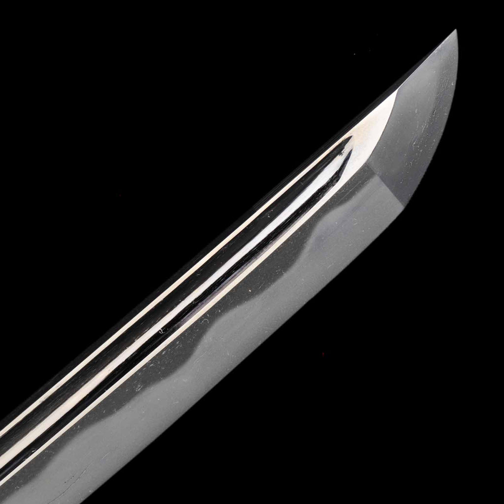 The sword blade is very sound and polished neatly throughout. On the sashiura side, there are shallow cracks in the forging on the habuchi about 19 cm from the kissaki and 16 cm from the hamachi, respectively. They do not affect the functionality, but they do spoil the aesthetics a bit. jigane is a well-packed itame hada with yubashiri also visible. Hamon is a wide and tall gunome with a well-packed nie. It is also elegantly made with fine chojiashi. Both sides of the blade are engraved with grooves. The name Washu Ju Tomomitsu is engraved on the Nakago.