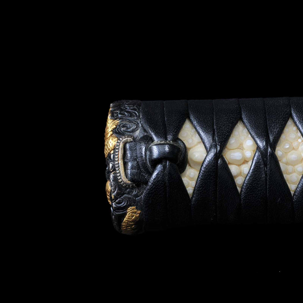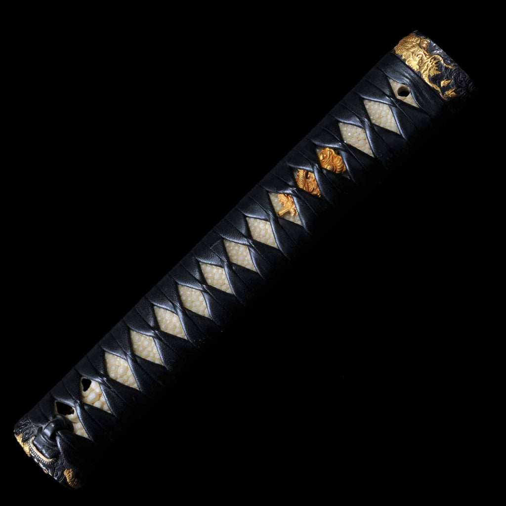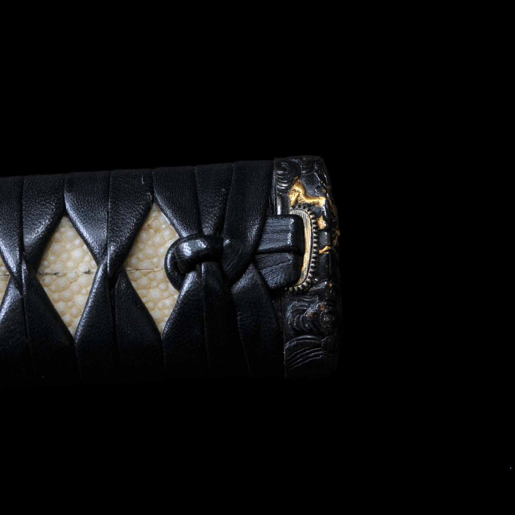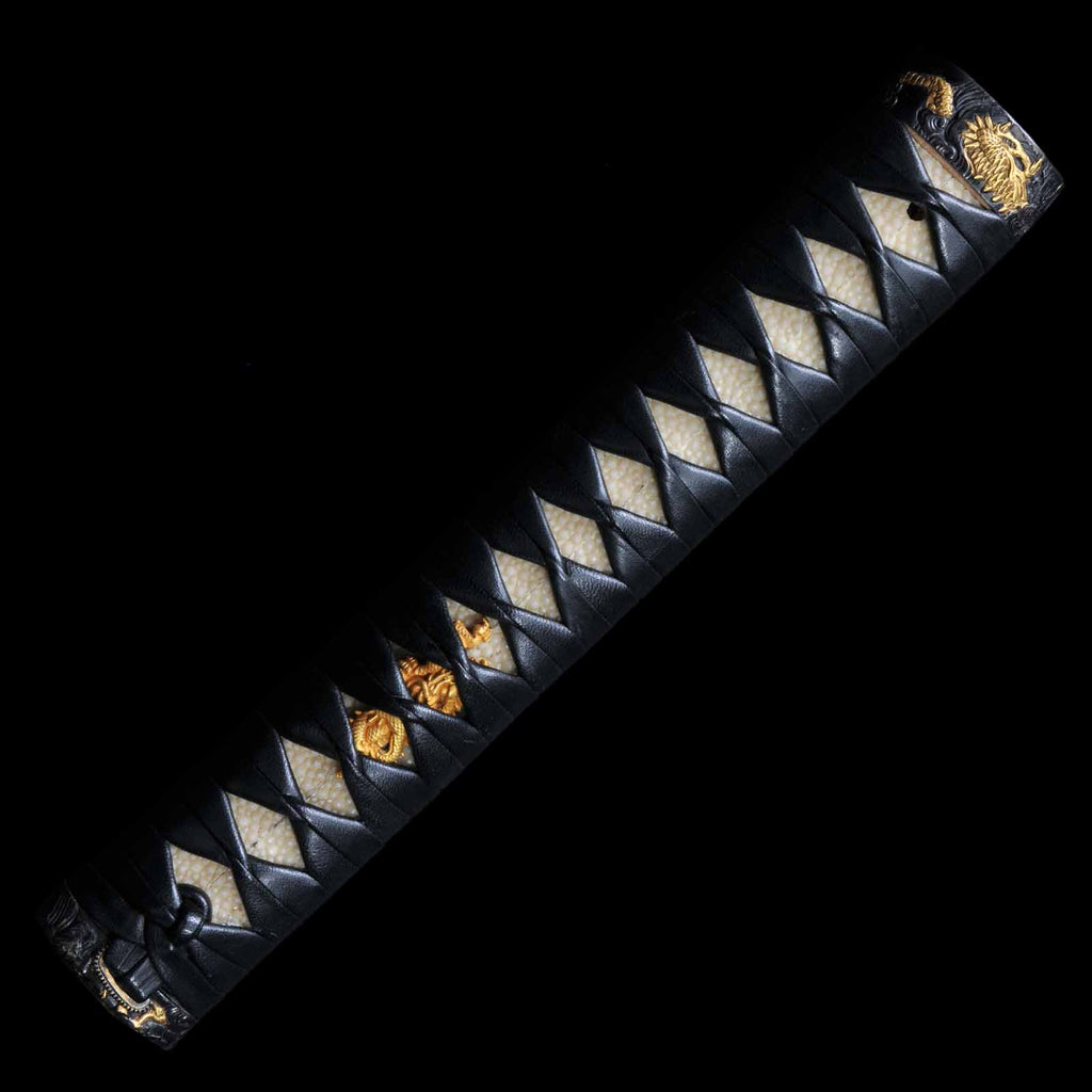 Koshirae was made in modern era and is in very excellent condition. The tsuka is made of black leather and wrapped in the hinerimaki style. The tsuba is from the Edo period, while the fuchi kashira and menuki are modern pieces. The leather-wrapped tsuka with grooves in the blade and its reasonable length make it suitable for use as an iai or batto.