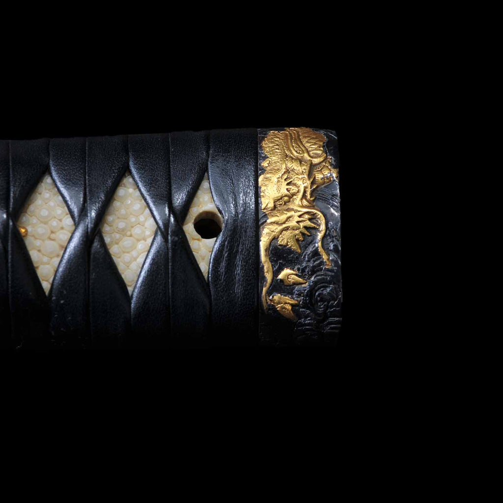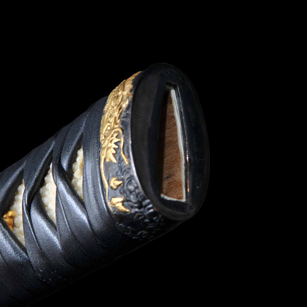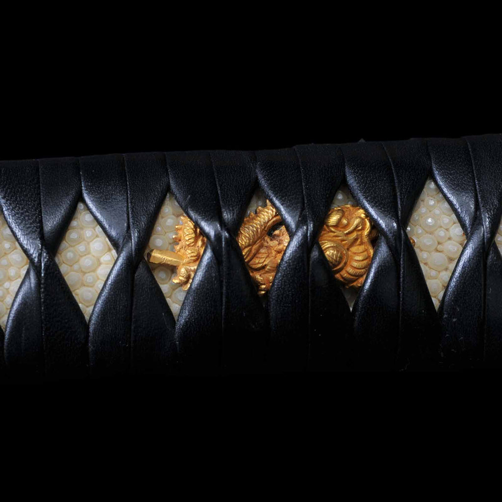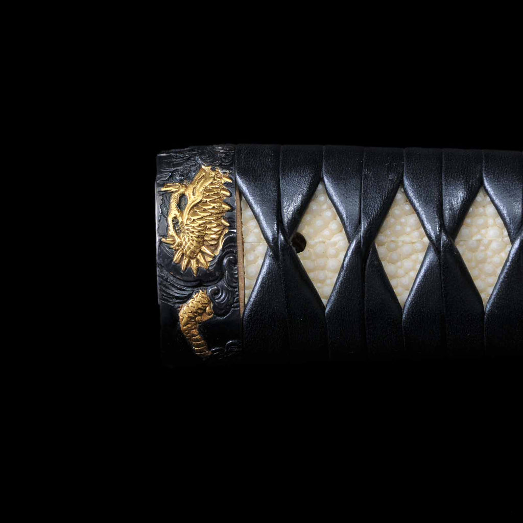 Koshirae was made in modern era and is in very excellent condition. The tsuka is made of black leather and wrapped in the hinerimaki style. The tsuba is from the Edo period, while the fuchi kashira and menuki are modern pieces. The leather-wrapped tsuka with grooves in the blade and its reasonable length make it suitable for use as an iai or batto.