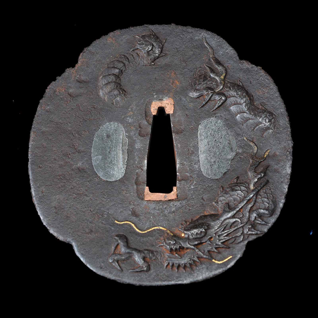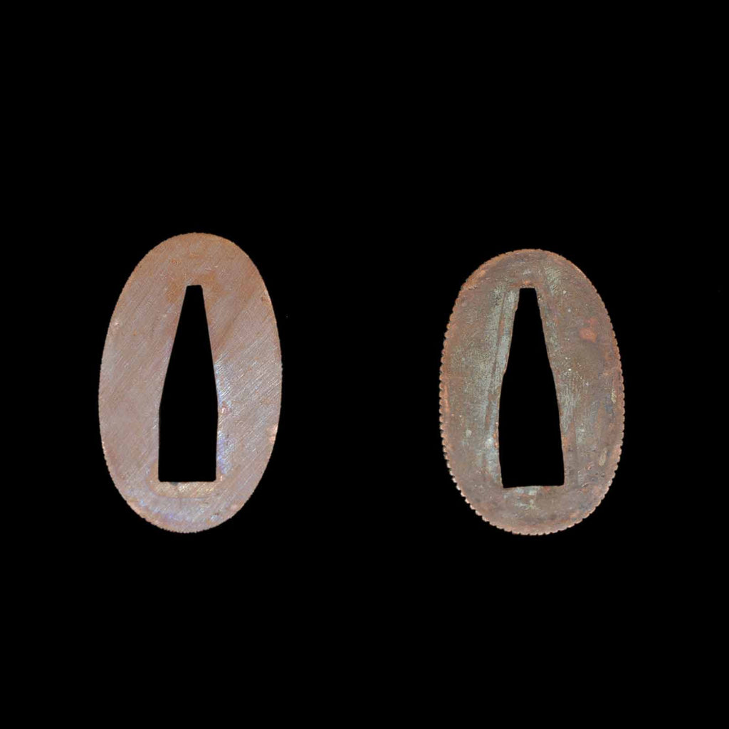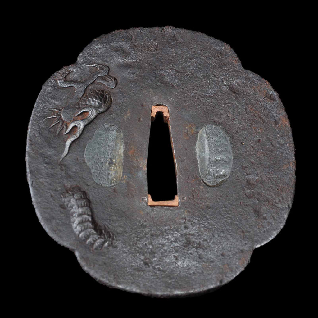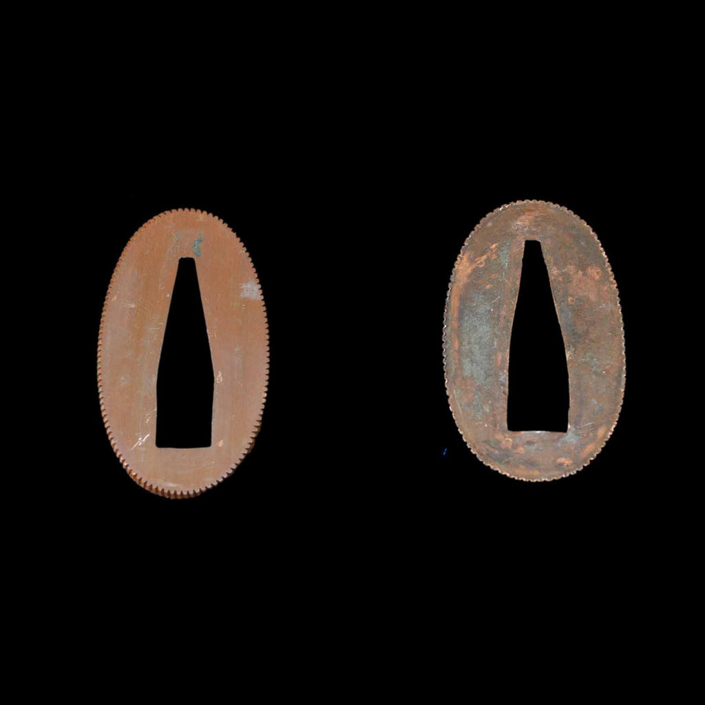Koshirae was made in modern era and is in very excellent condition. The tsuka is made of black leather and wrapped in the hinerimaki style. The tsuba is from the Edo period, while the fuchi kashira and menuki are modern pieces. The leather-wrapped tsuka with grooves in the blade and its reasonable length make it suitable for use as an iai or batto.