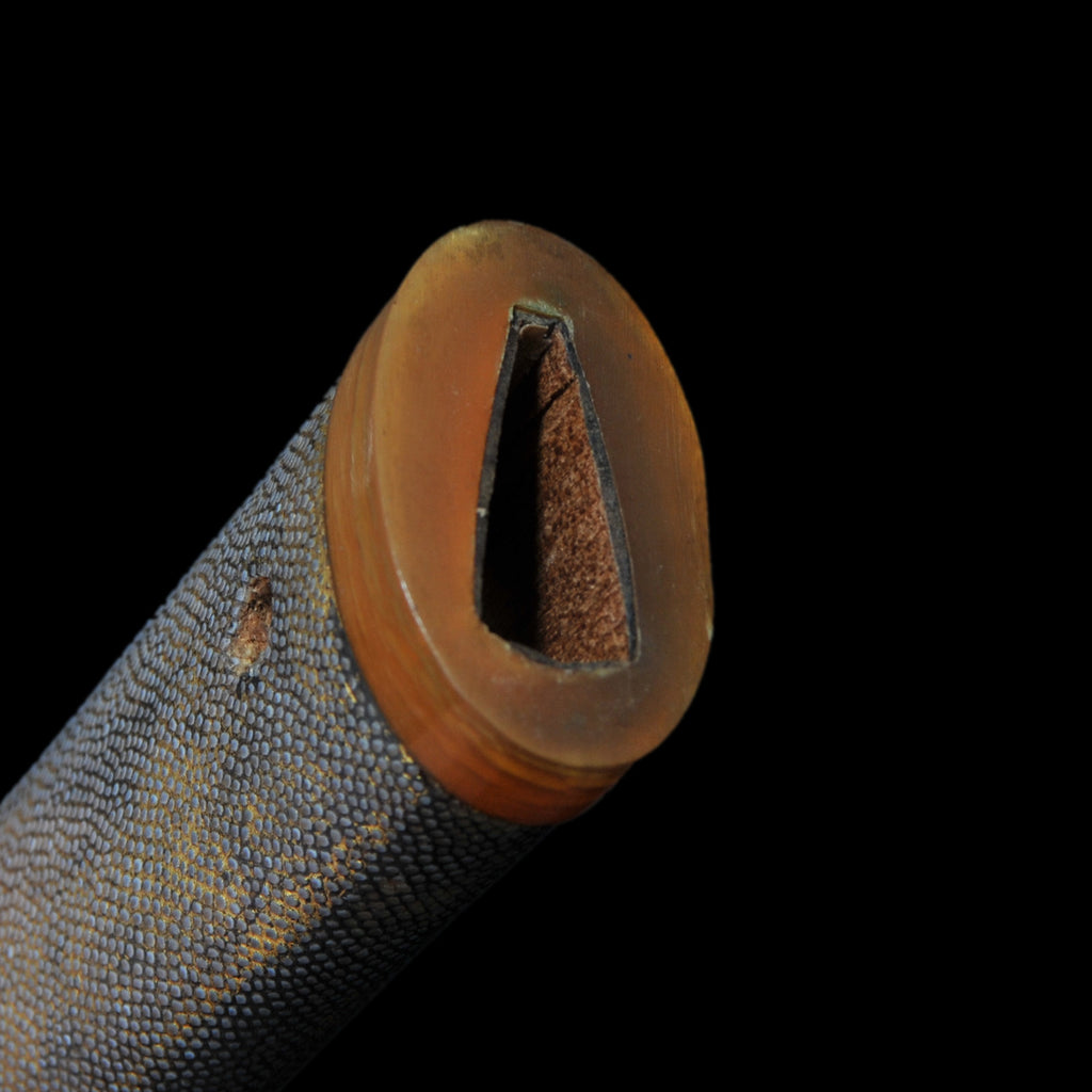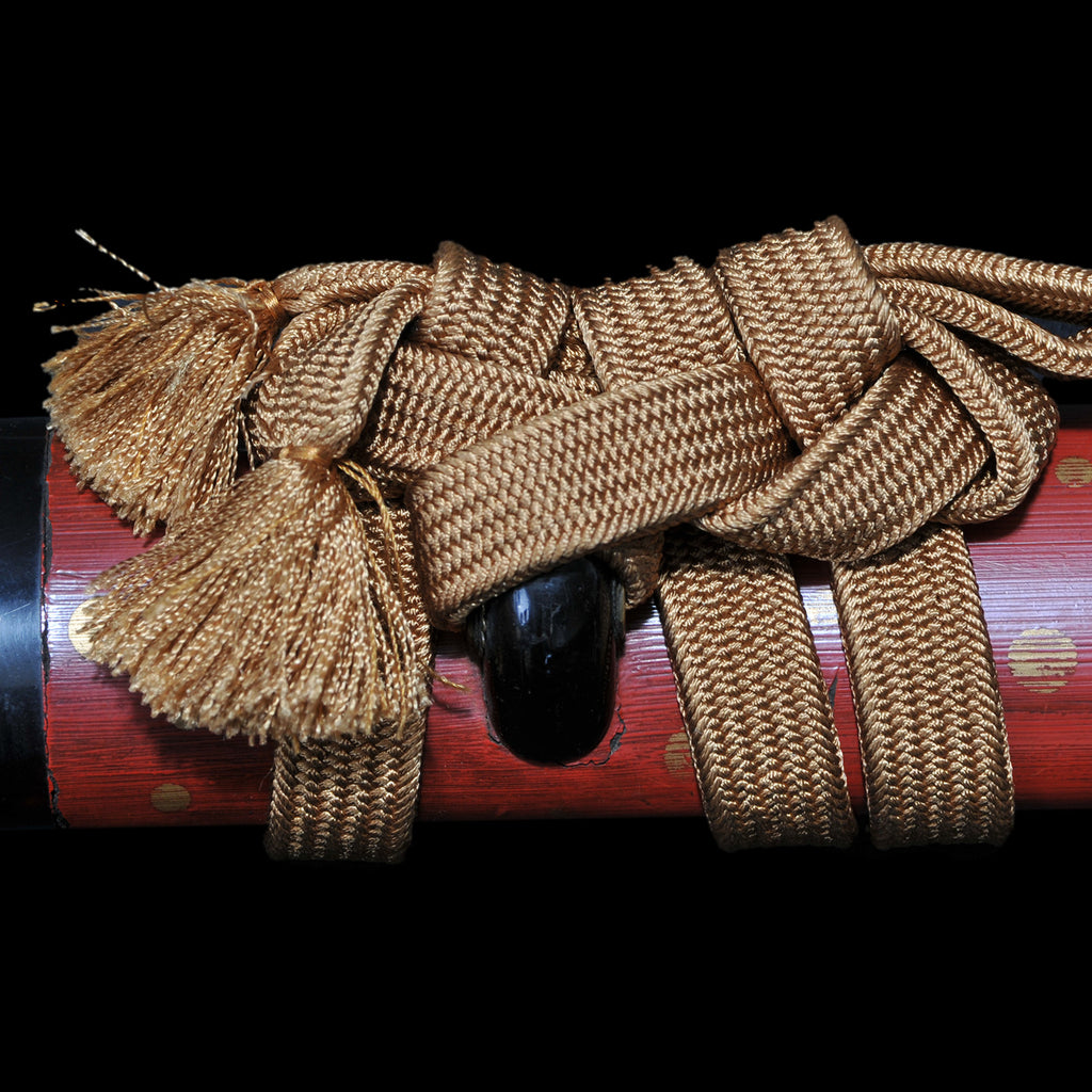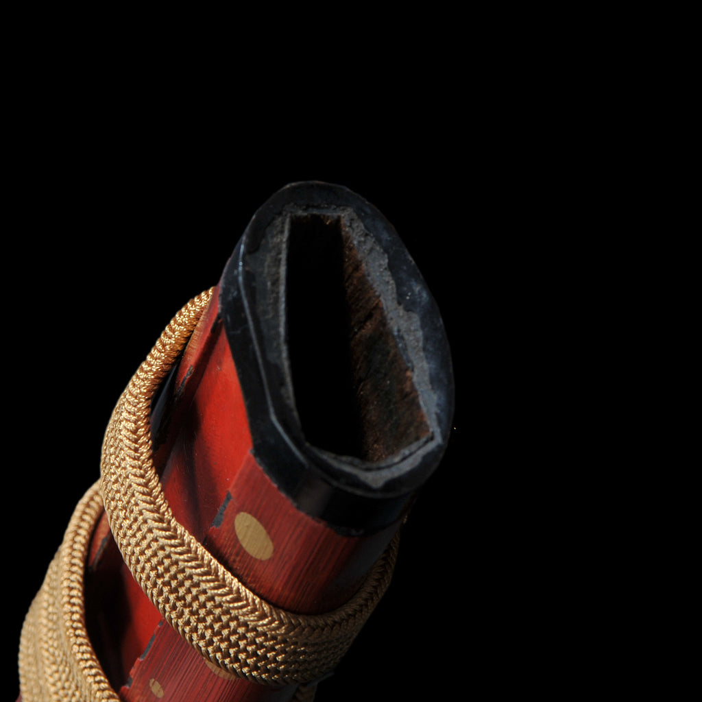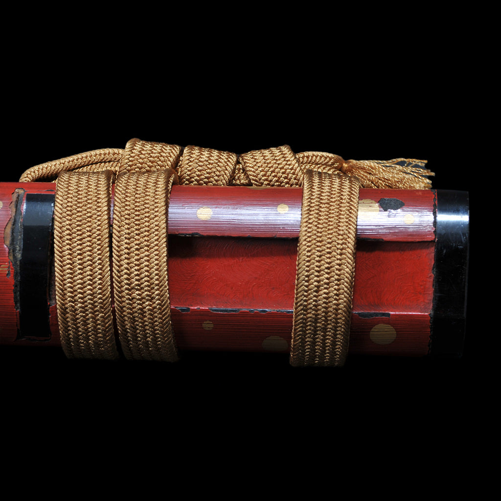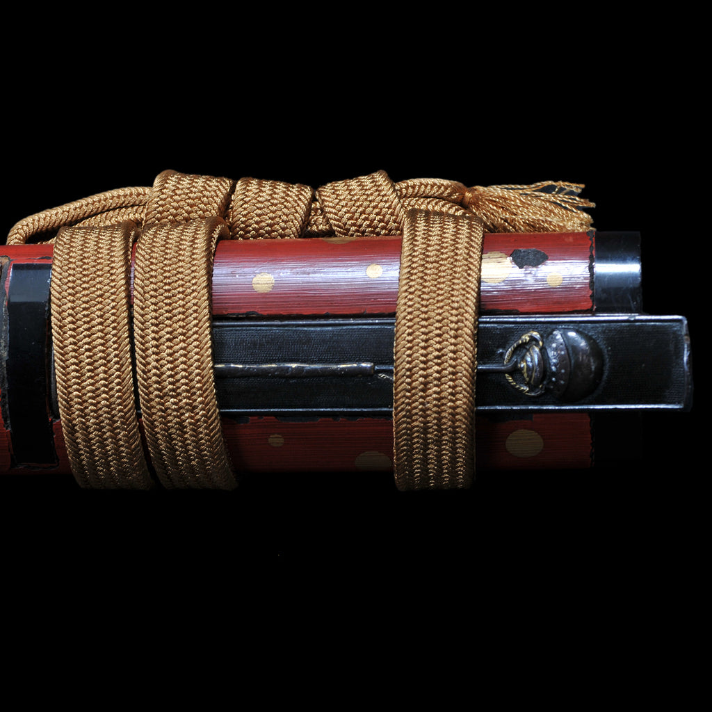 - Koshirae: Leather wrapped Tsuka & vermillion-lacquered Saya