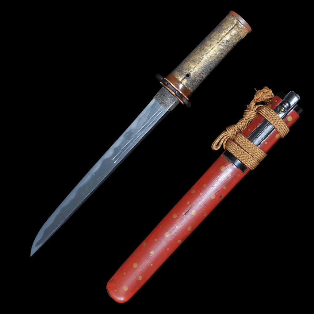 Magoroku Kanemoto, also known as Magoroku, is particularly famous and the first and second generations are especially popular. This piece was made around the late Muromachi period. The saya is lacquered in vermilion with gold dots, and tsuka is equipped with a leather painted in gold. The fuchigane is made of a material similar to amber. The kozuka is also equipped and there are no missing pieces as a tanto koshirae.