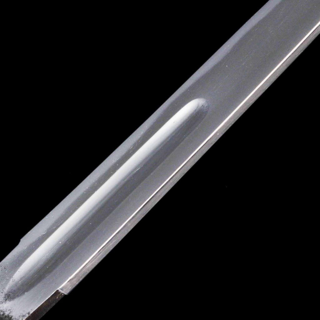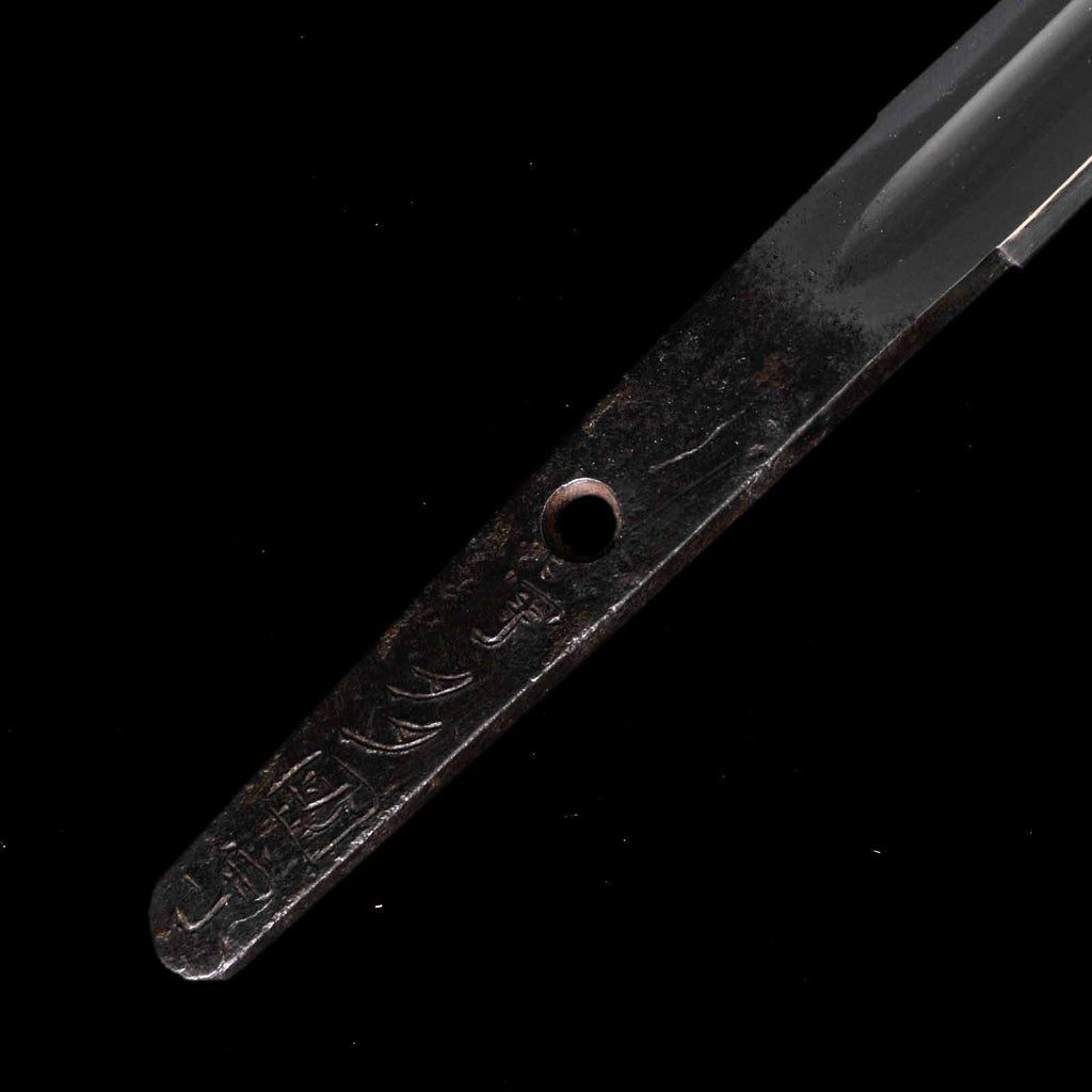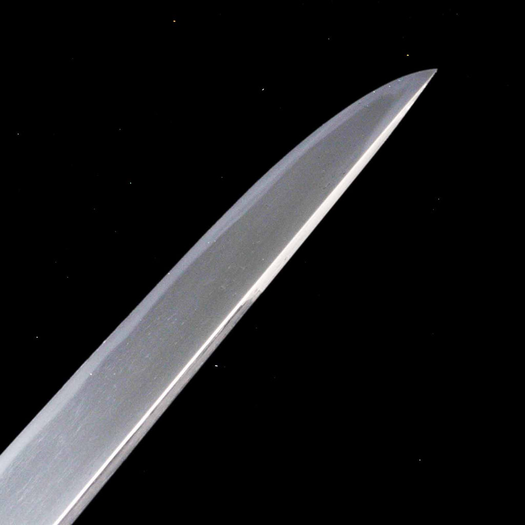 This piece is in an extremely well-preserved state of sharpening, with no flaws or defects. The hada is a well-packed itame hada with some hataraki such as chikei. The thin notare hamon with niedeki is very elegant and graceful. The blade is engraved with a groove, one on the sashiomote side and two on the sashiura side. The habaki on the sashiura side is decorated with a six-pointed star family crest.