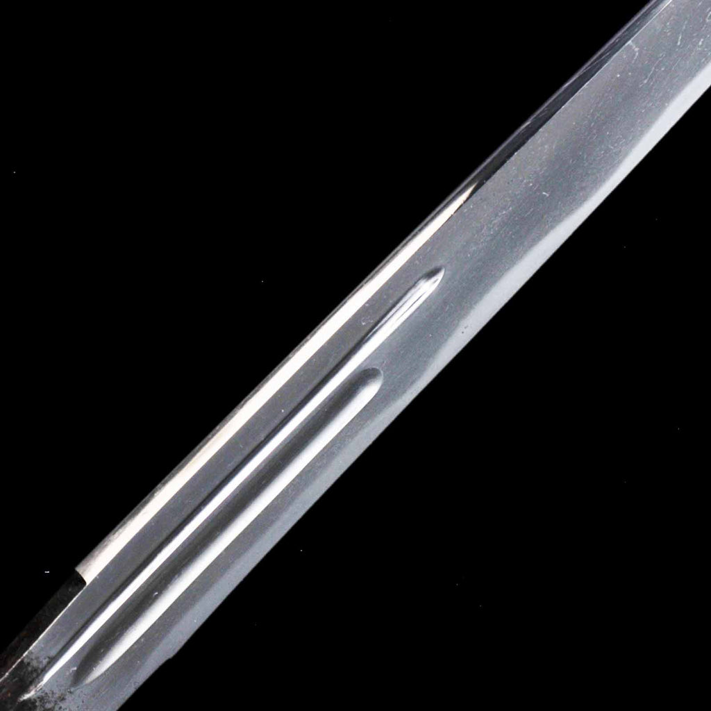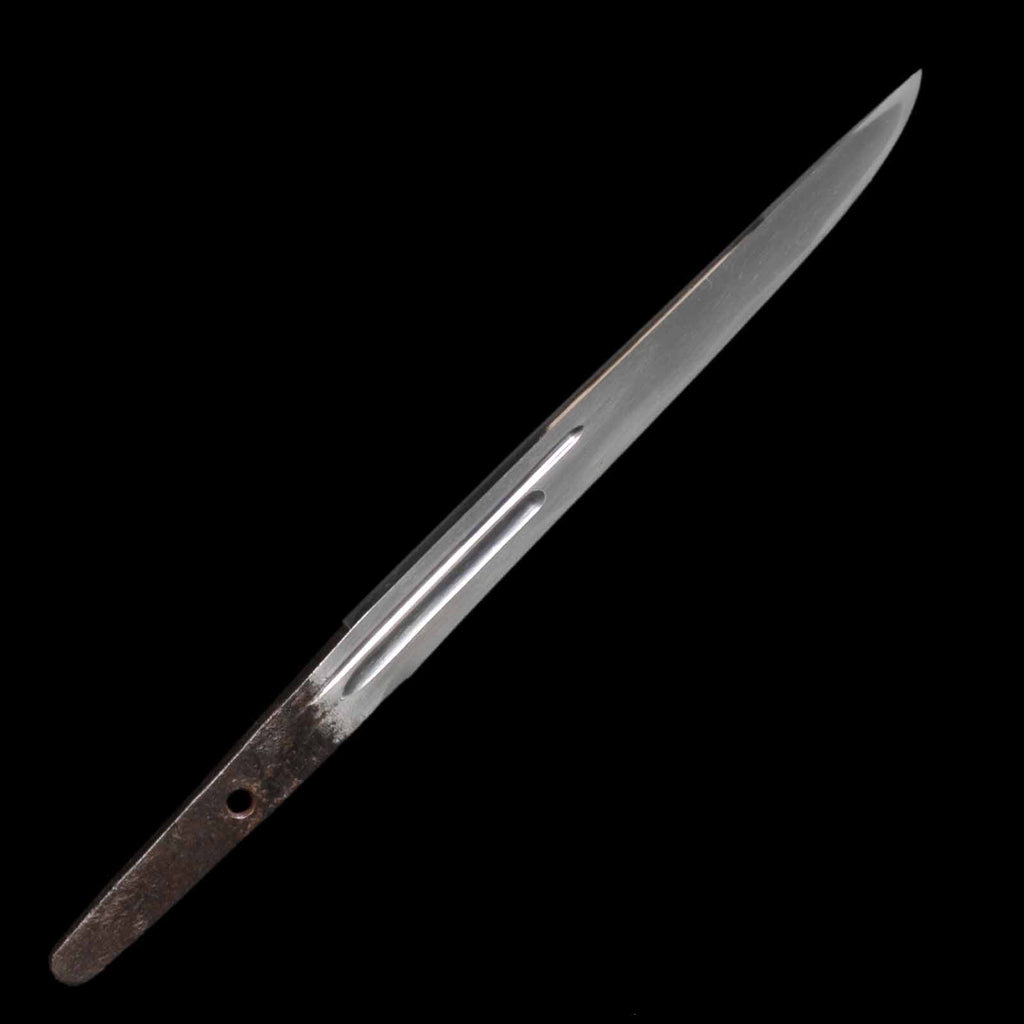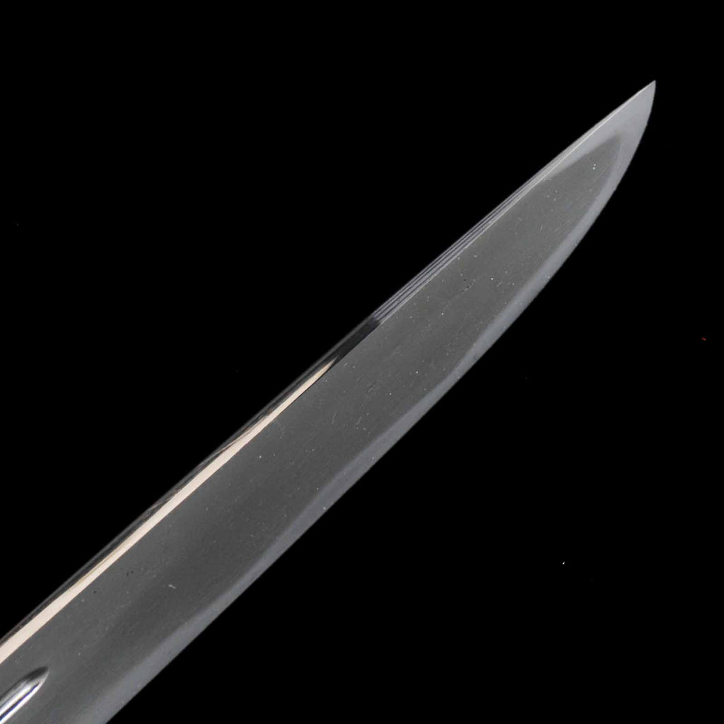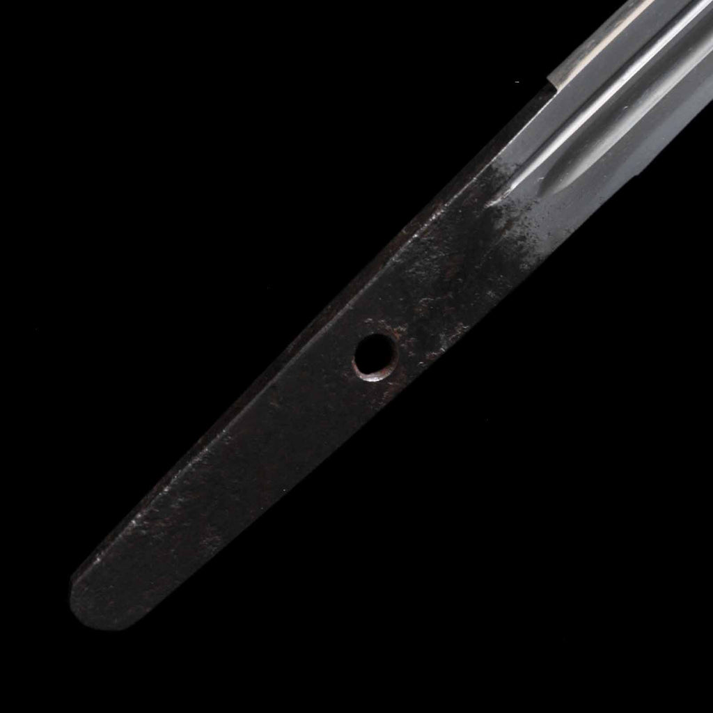 This piece is in an extremely well-preserved state of sharpening, with no flaws or defects. The hada is a well-packed itame hada with some hataraki such as chikei. The thin notare hamon with niedeki is very elegant and graceful. The blade is engraved with a groove, one on the sashiomote side and two on the sashiura side. The habaki on the sashiura side is decorated with a six-pointed star family crest.