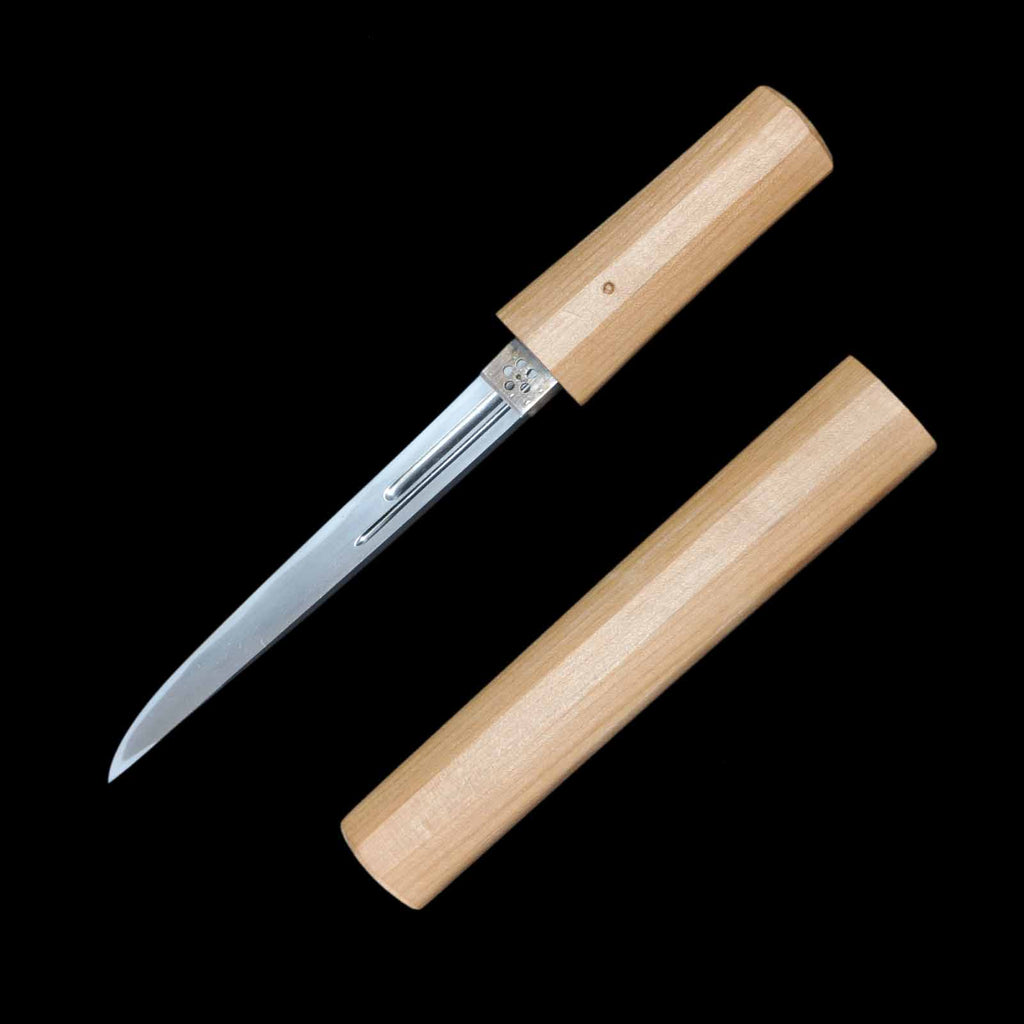 This dagger is small and is what is called a kaiken. Kaiken means a sword that is kept inside a kimono, and it can be said to be a short sword for self-defense. Since carrying a katana was forbidden inside a castle, its value was recognized as a weapon for self-defense in the event of a surprise attack. It is said that many masterpieces have been handed down from ancestors, even by feudal lords.