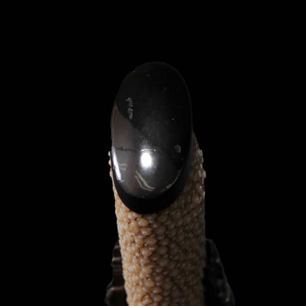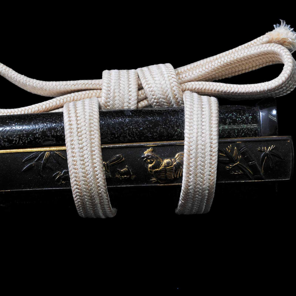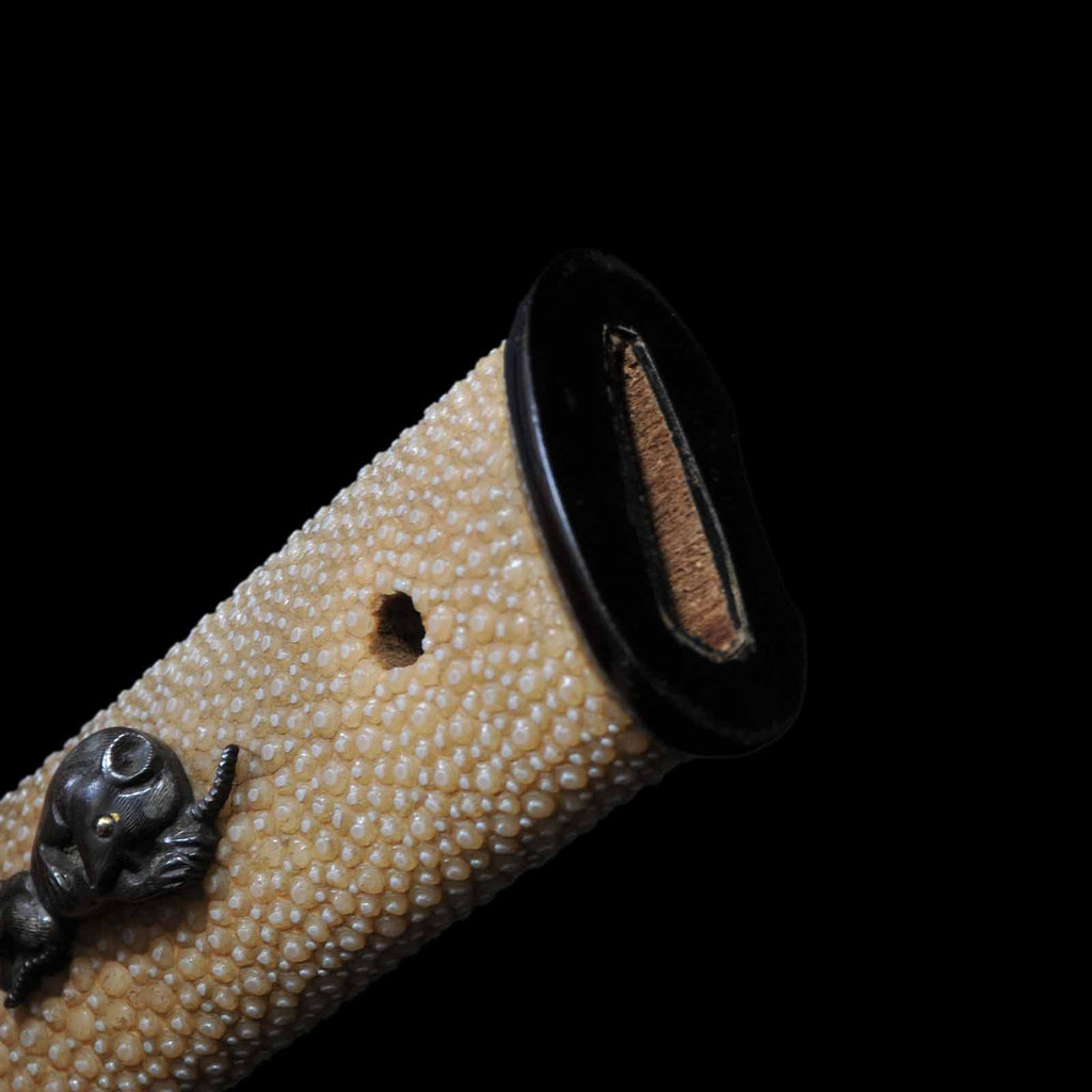 The sword blade has well-packed itame hada and gorgeously decorated hitatsura hamon. The hamon on the sashiomote side in particular is gorgeously and flamboyantly hitatsura. All the metal fittings of Koshirae's equipment are of the period, and the style is typical of the Tensho style of quality and sturdiness of the samurai. The scabbard lacquer is a special lacquer with blue shells scattered in mother-of-pearl inlay, and the kozuka is also fully equipped.