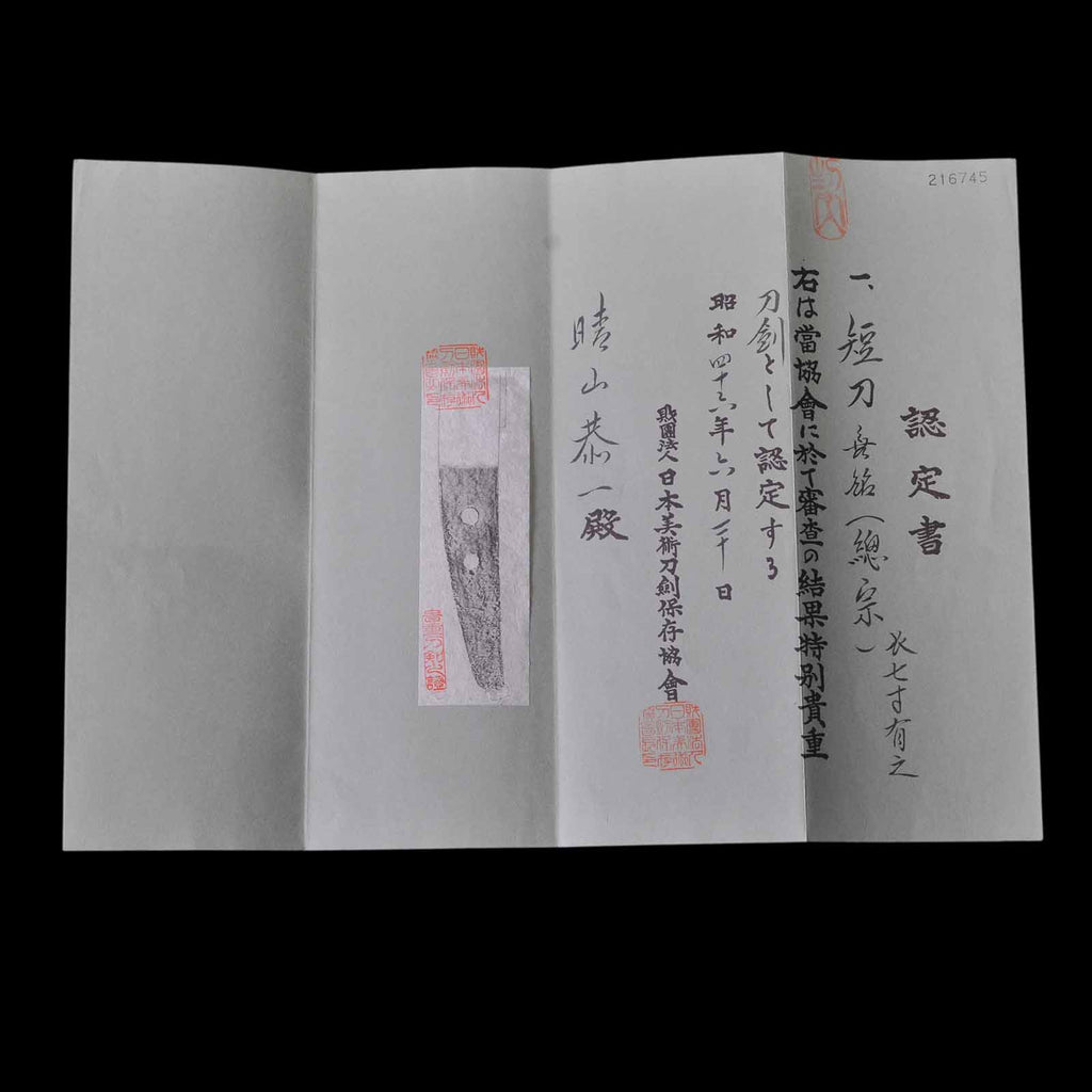 This piece is a tanto recognized by the Society for Preservation of Japanese Art Swords as being of exceptional value as a work of Fusamune, and is equipped with both koshirae and shirasaya.
