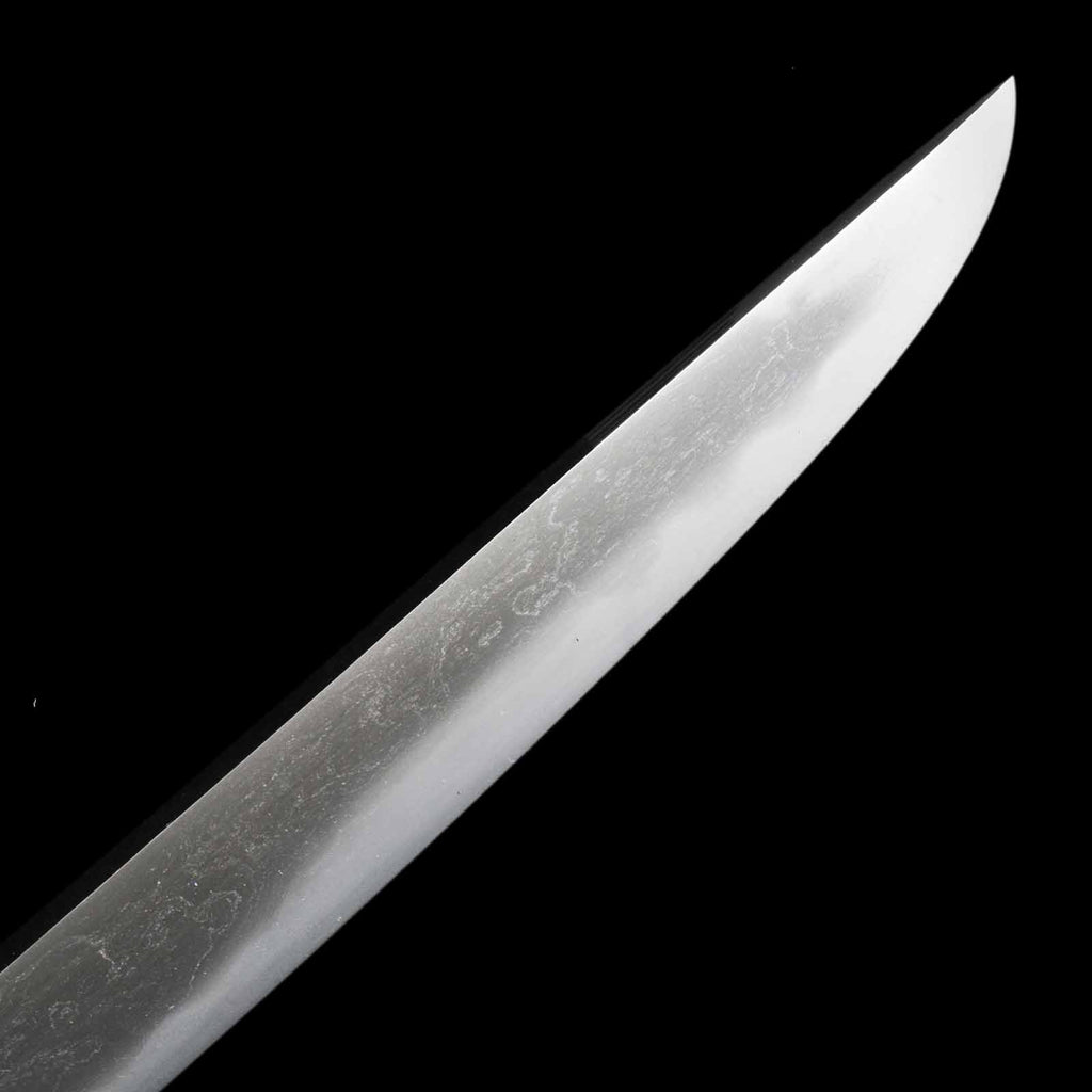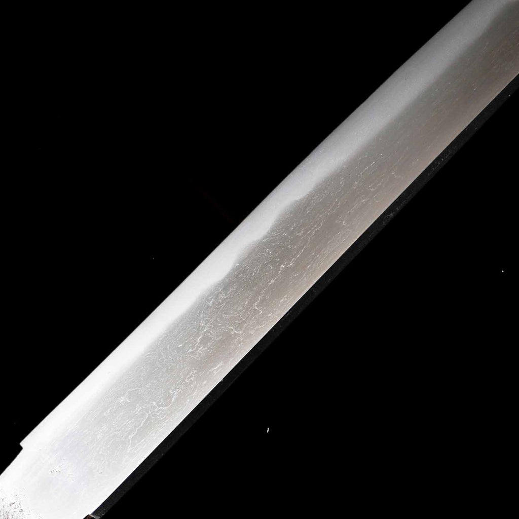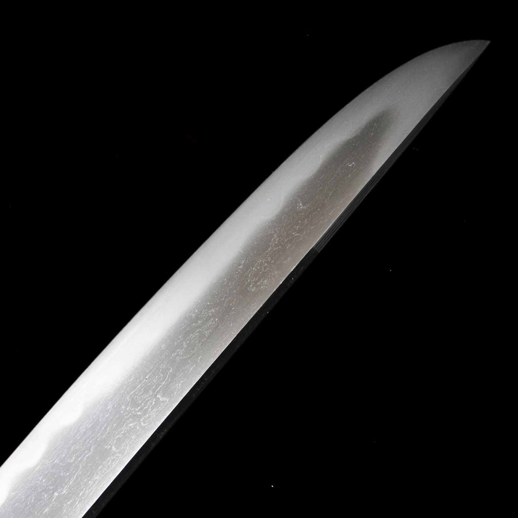 The sword is in excellent condition with no flaws, rust, chips, or dents. The jigane is itame mixed with mokume and yubashiri is clearly visible. Hamon is a gunome with well attached nie, with some notare mixed in on the sashiura side.