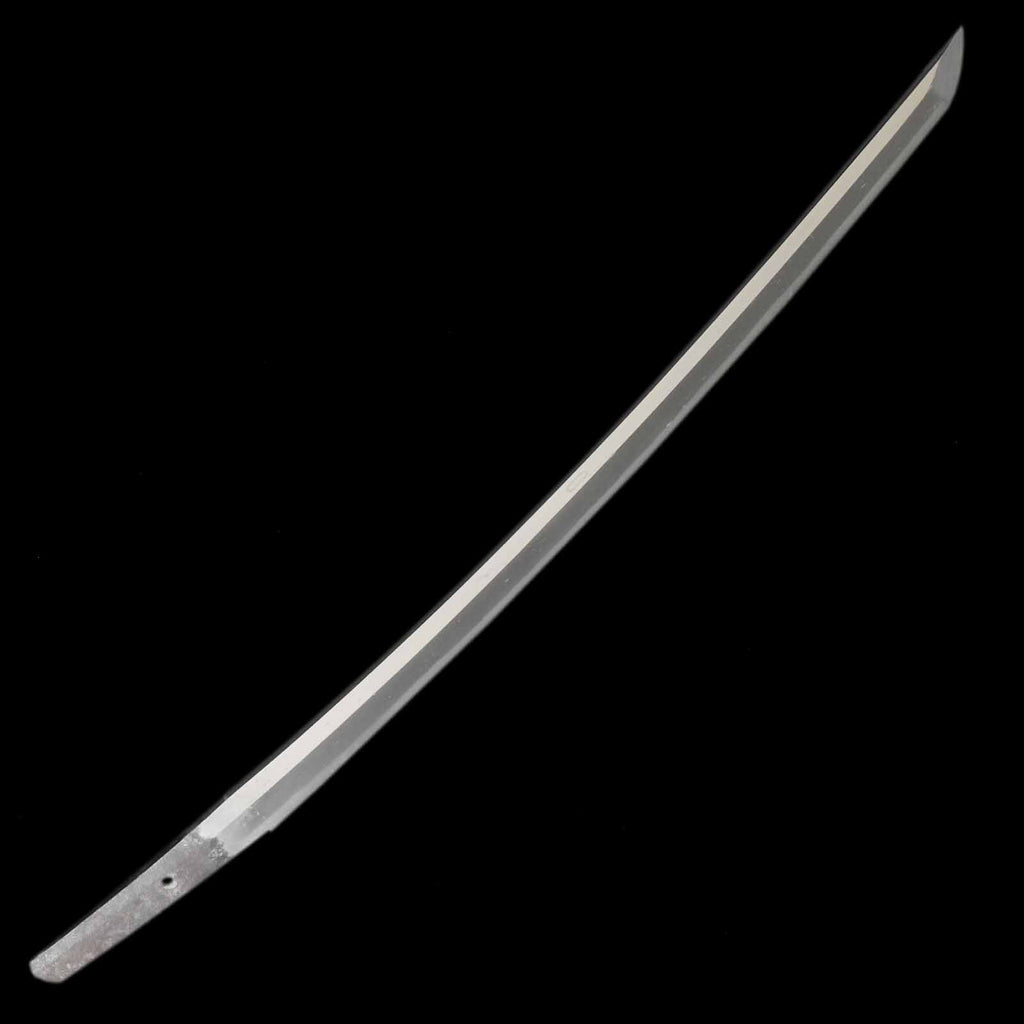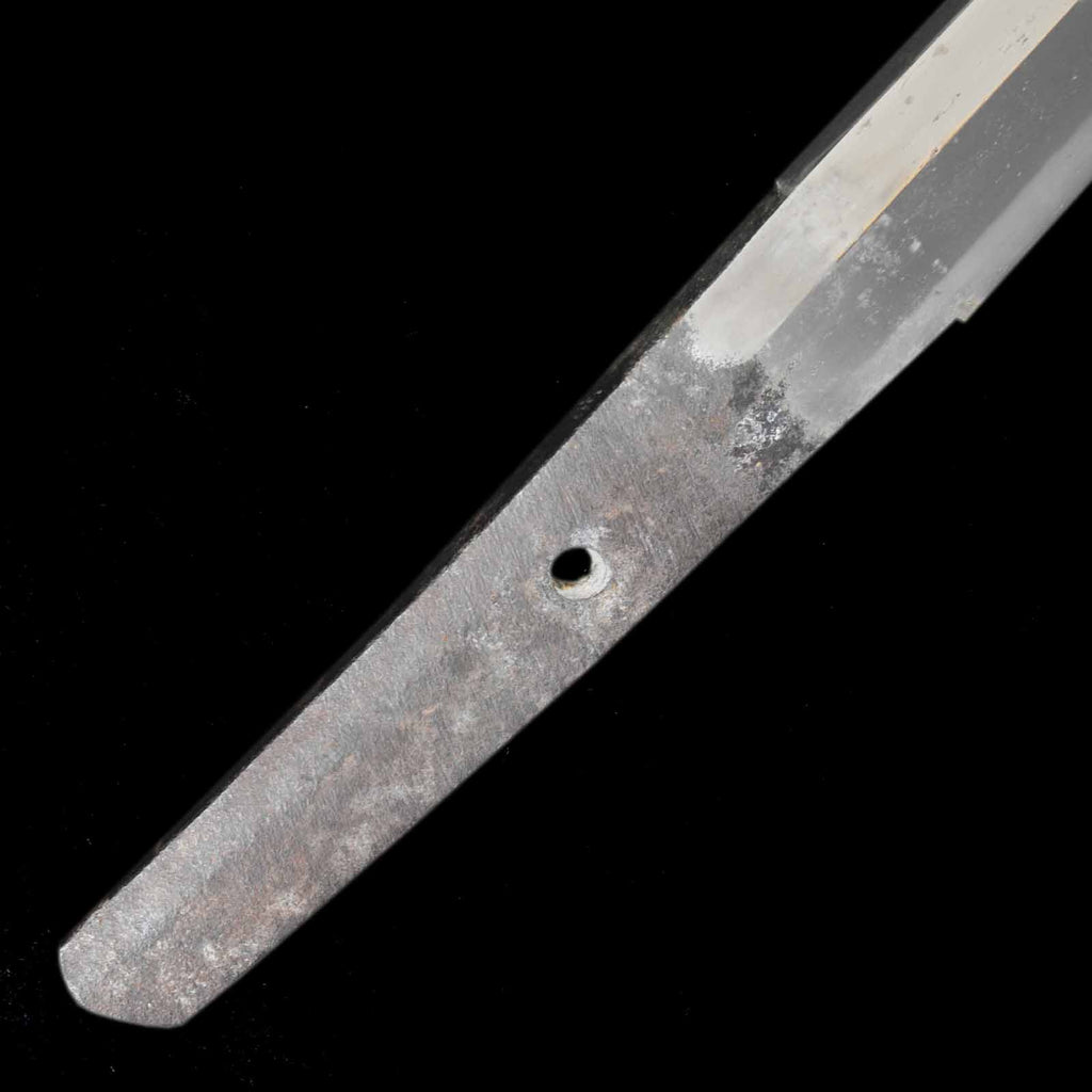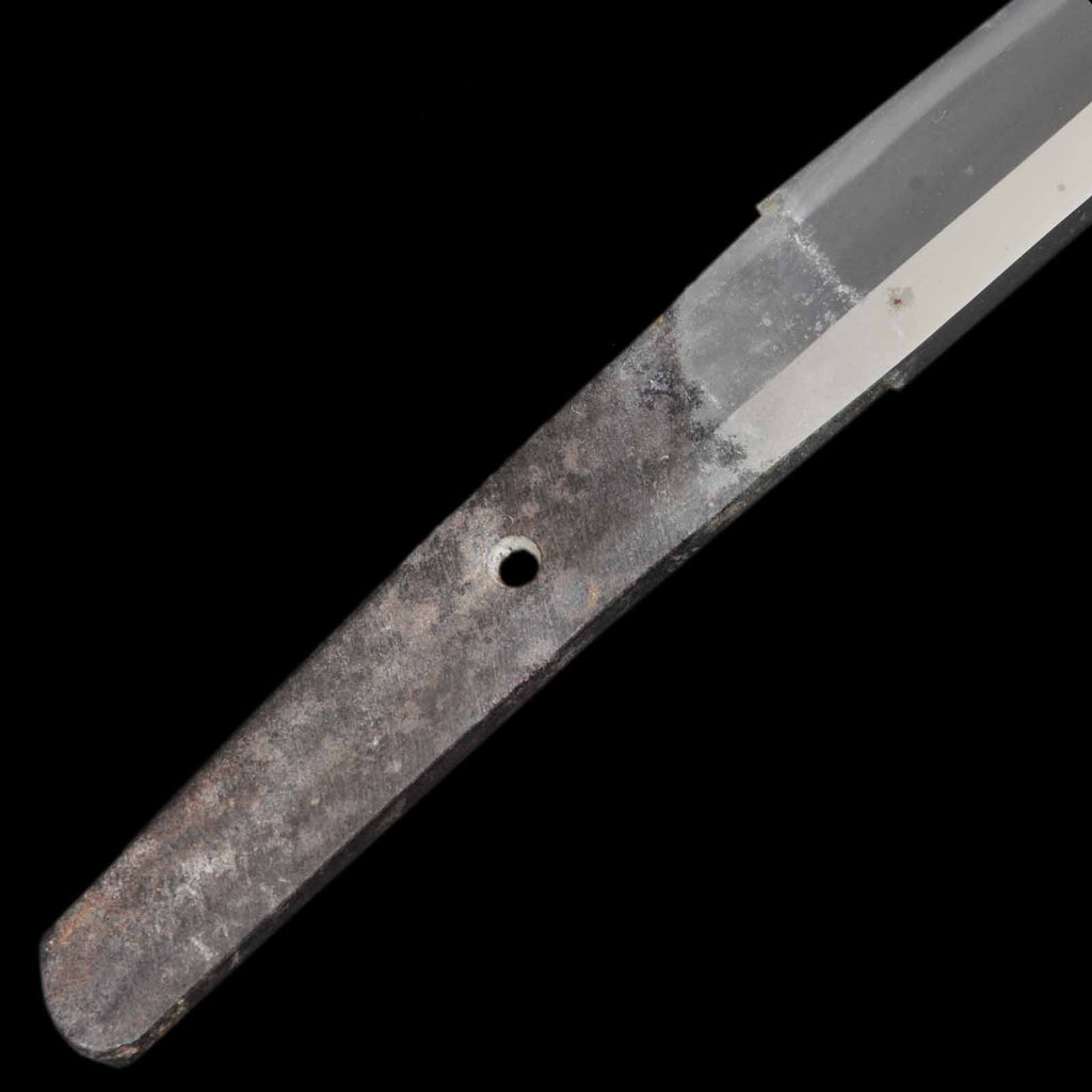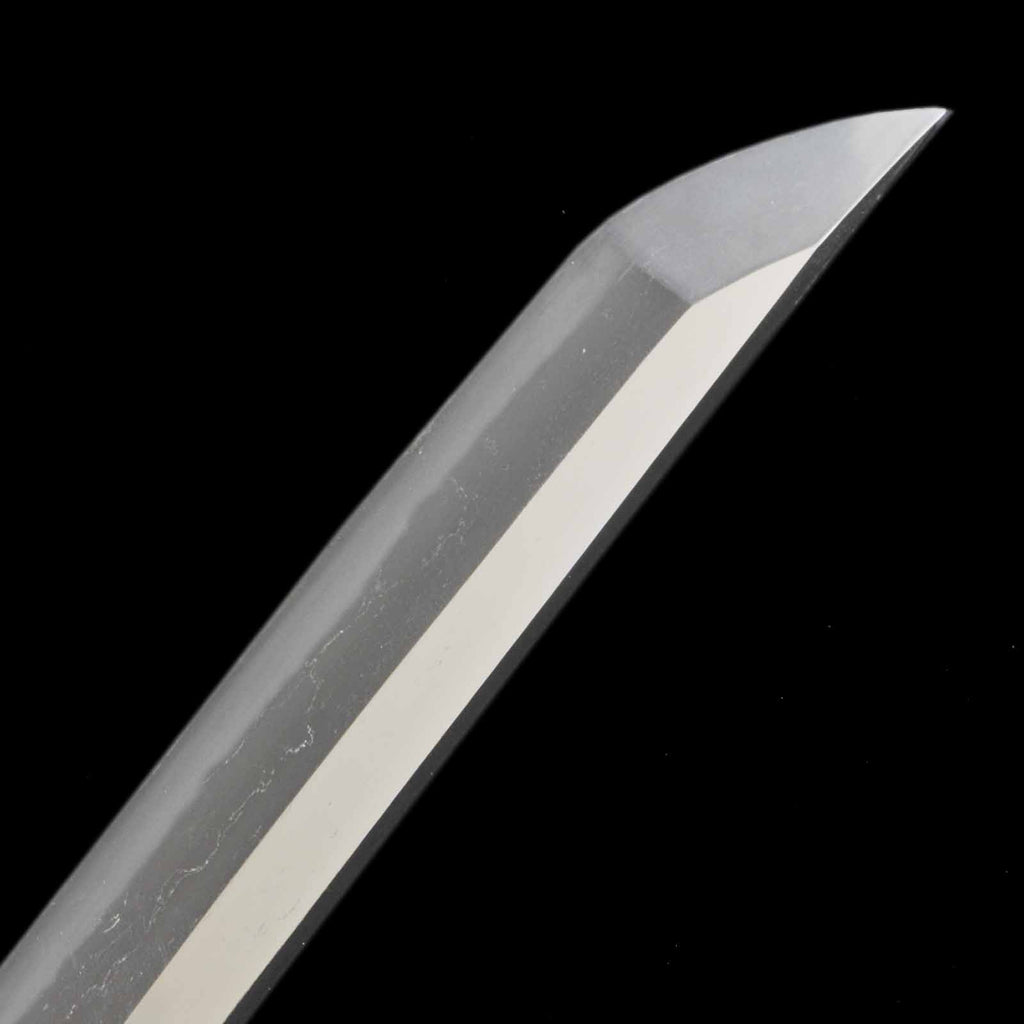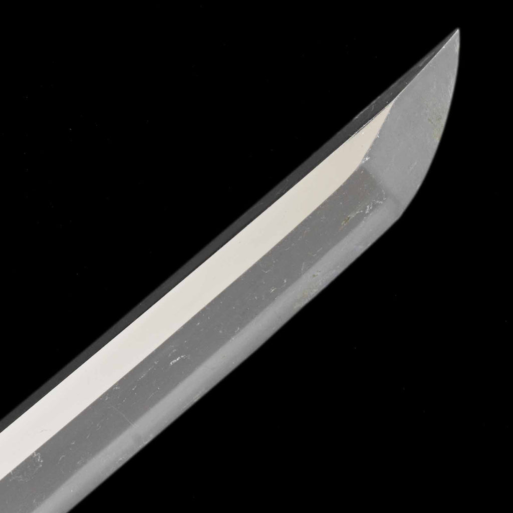 This sword has several kitae flaws and some signs of umegane, but overall it was preserved in very good condition. The itame jitetsu and Hoso-suguha Hamon create a very elegant atmosphere. The curvature is a little more on the hand side than the center, which is known as koshizori. The koshirae on the shirasaya is also uncompromisingly excellent.