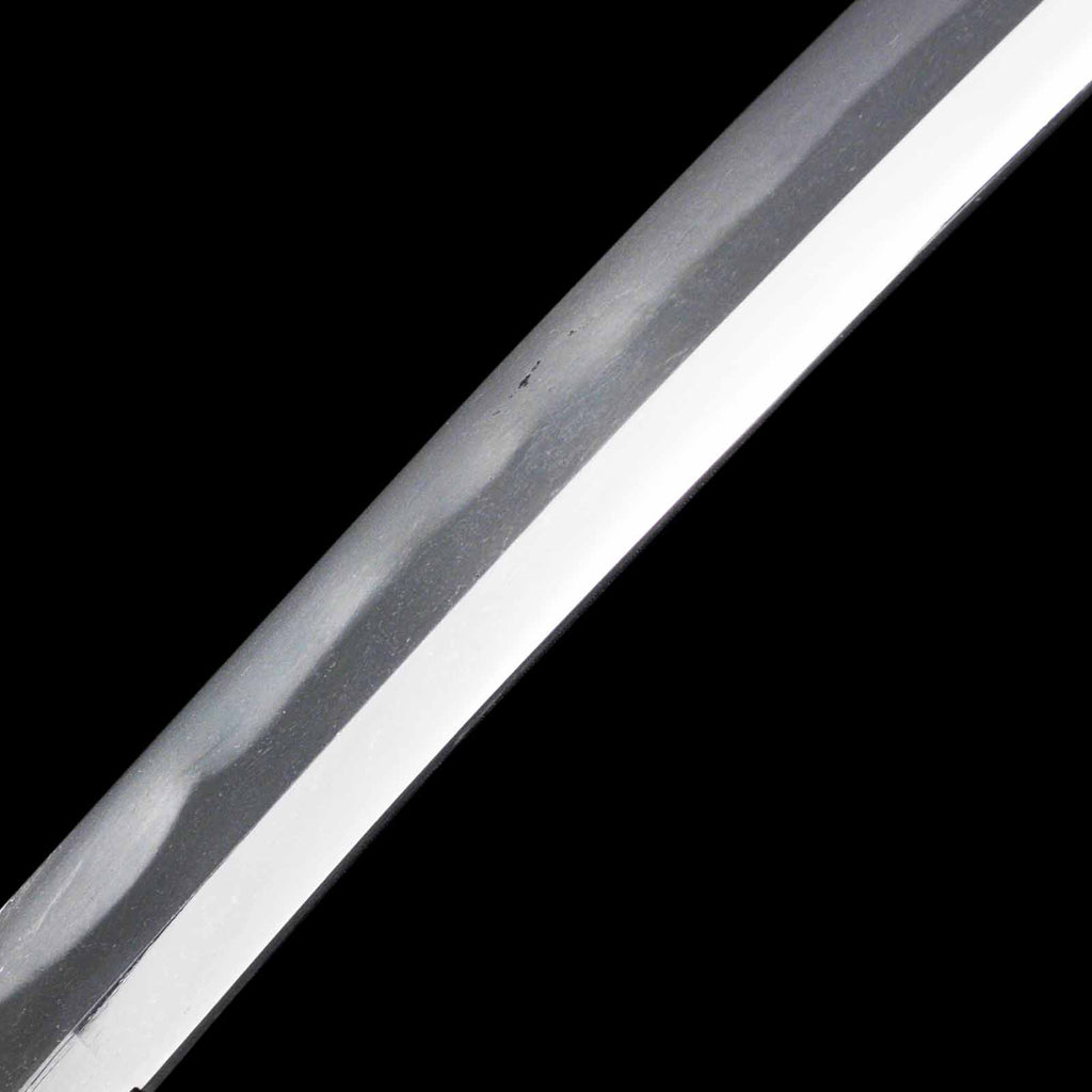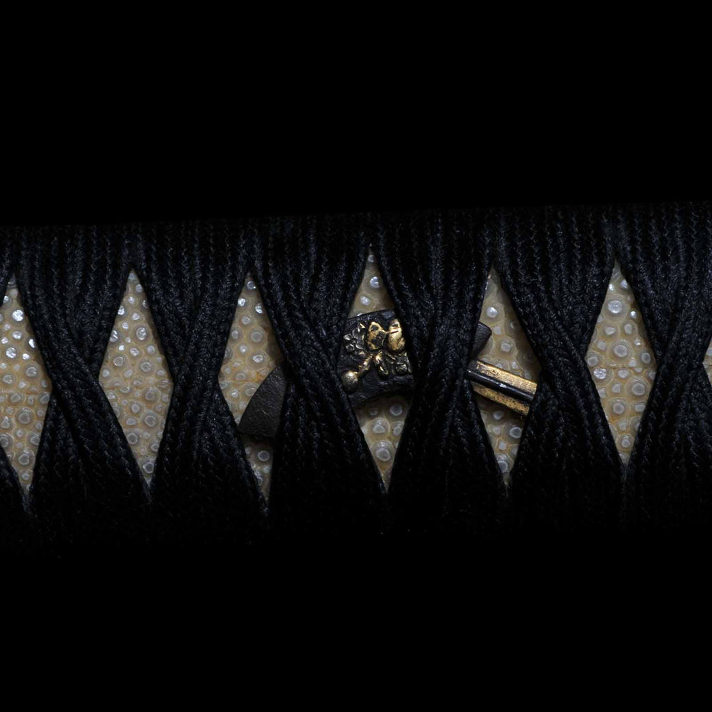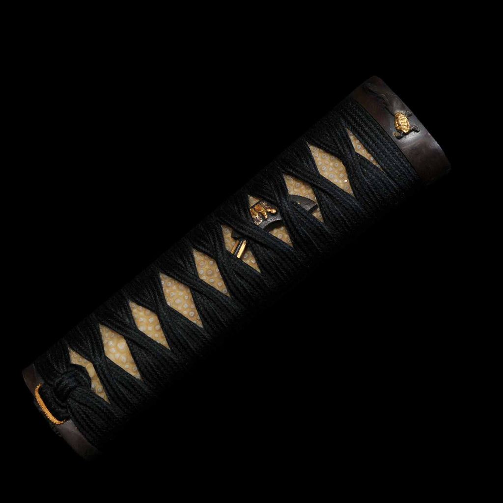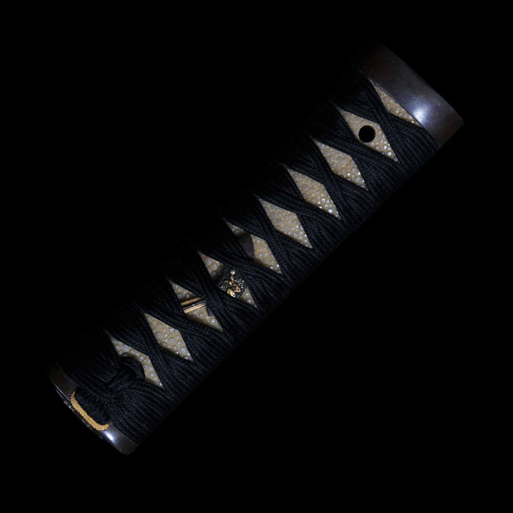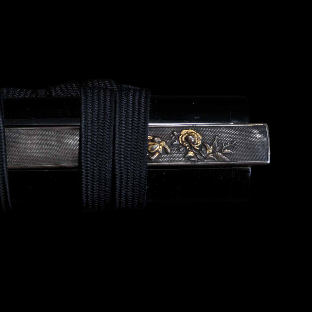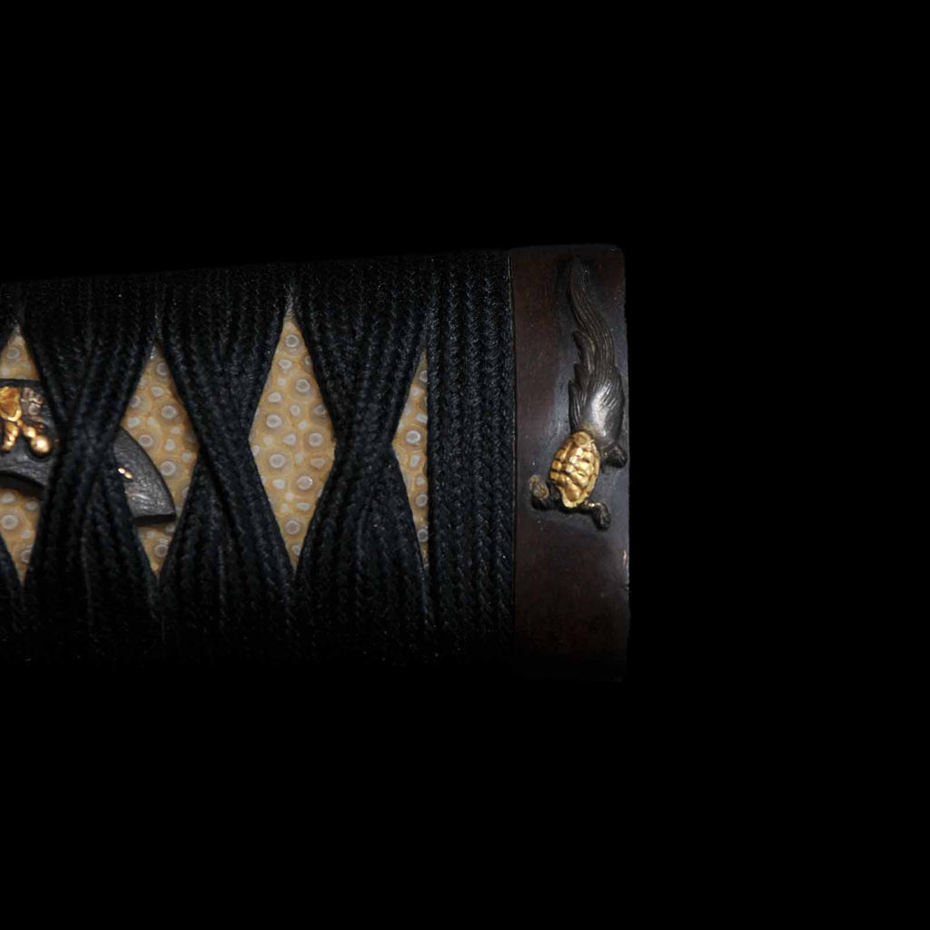 This piece has a very well-packed itame with a notare-like suguha hamon. The ha is spotted in places with gnome and choji nie, which is very interesting. The preservation is very good, the sword is very clean, and it is assumed that it has been carefully stored for a long time. There is a single forging flaw that appears about 8 cm from the moto on the sashiura side, but this does not detract greatly from the beauty of the piece. It is also equipped with an uchigatana koshirae. The metal fittings used for it are original to the period, with a crane and turtle motif on the fuchi-kashira and a fan on the menuki, making it very auspicious. This uchikatana koshirae is also equipped with a kozuka. The kozuka's design is decorated with auspicious peonies, lions, and butterflies.