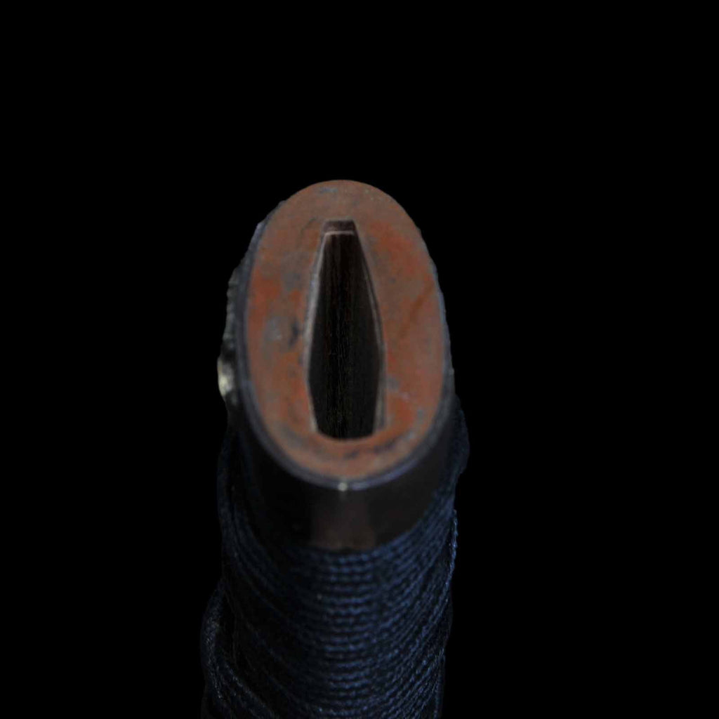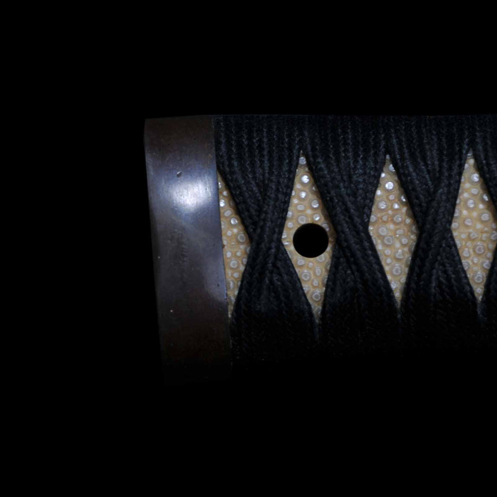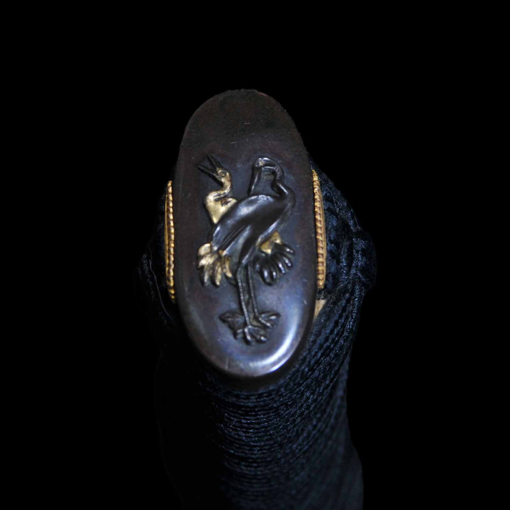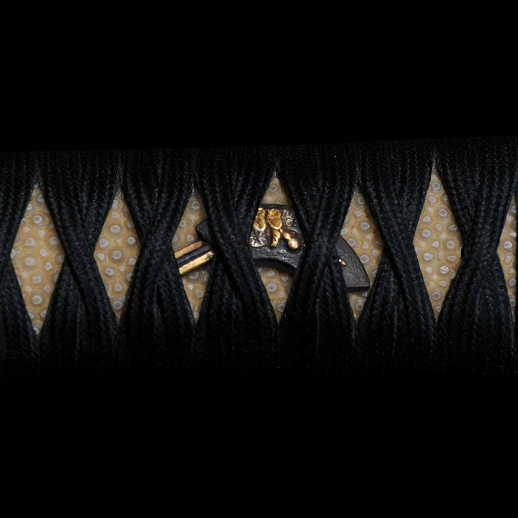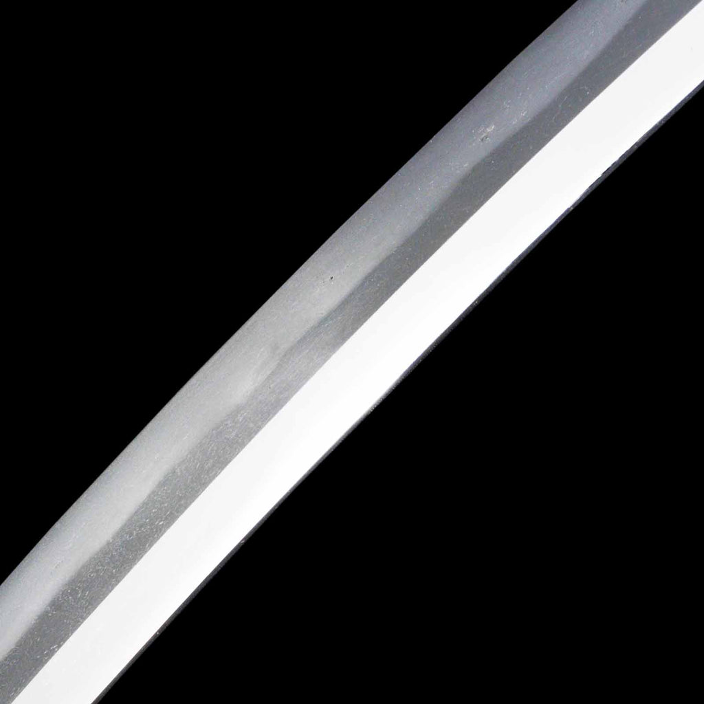 This piece has a very well-packed itame with a notare-like suguha hamon. The ha is spotted in places with gnome and choji nie, which is very interesting. The preservation is very good, the sword is very clean, and it is assumed that it has been carefully stored for a long time. There is a single forging flaw that appears about 8 cm from the moto on the sashiura side, but this does not detract greatly from the beauty of the piece. It is also equipped with an uchigatana koshirae. The metal fittings used for it are original to the period, with a crane and turtle motif on the fuchi-kashira and a fan on the menuki, making it very auspicious. This uchikatana koshirae is also equipped with a kozuka. The kozuka's design is decorated with auspicious peonies, lions, and butterflies.