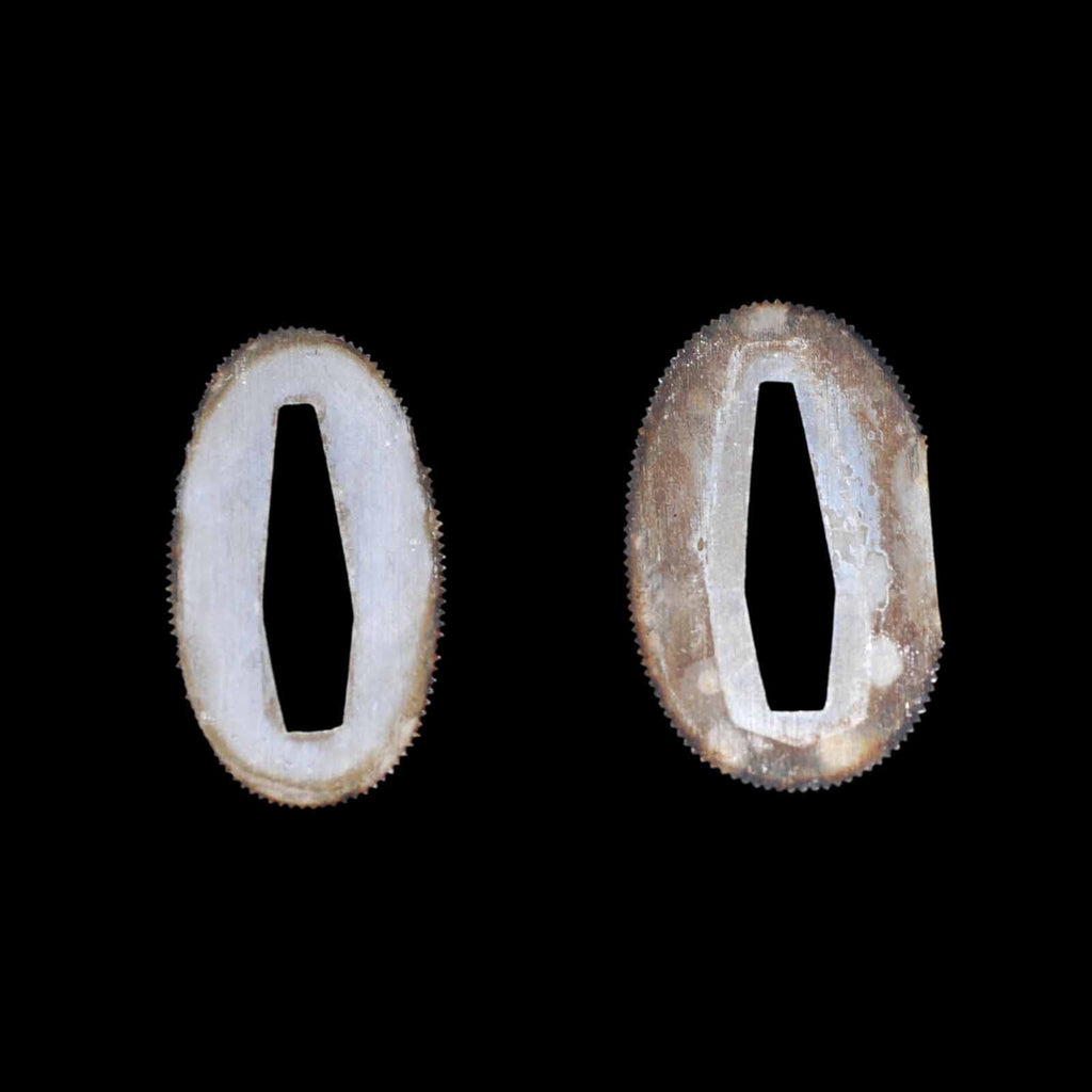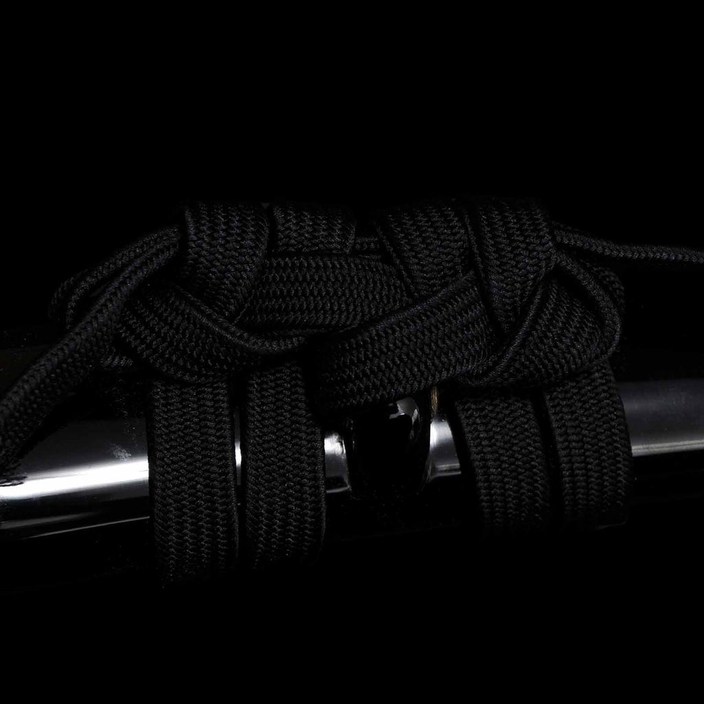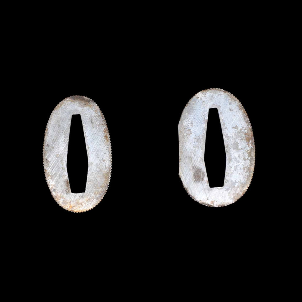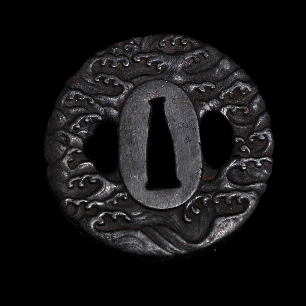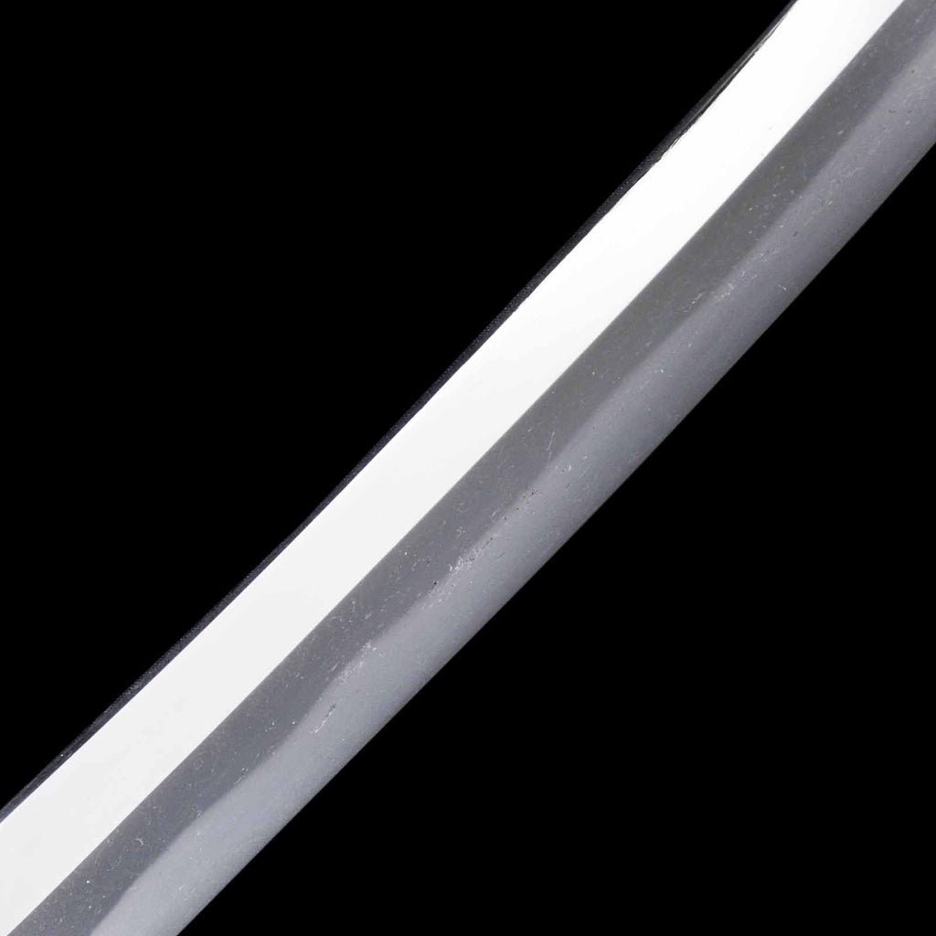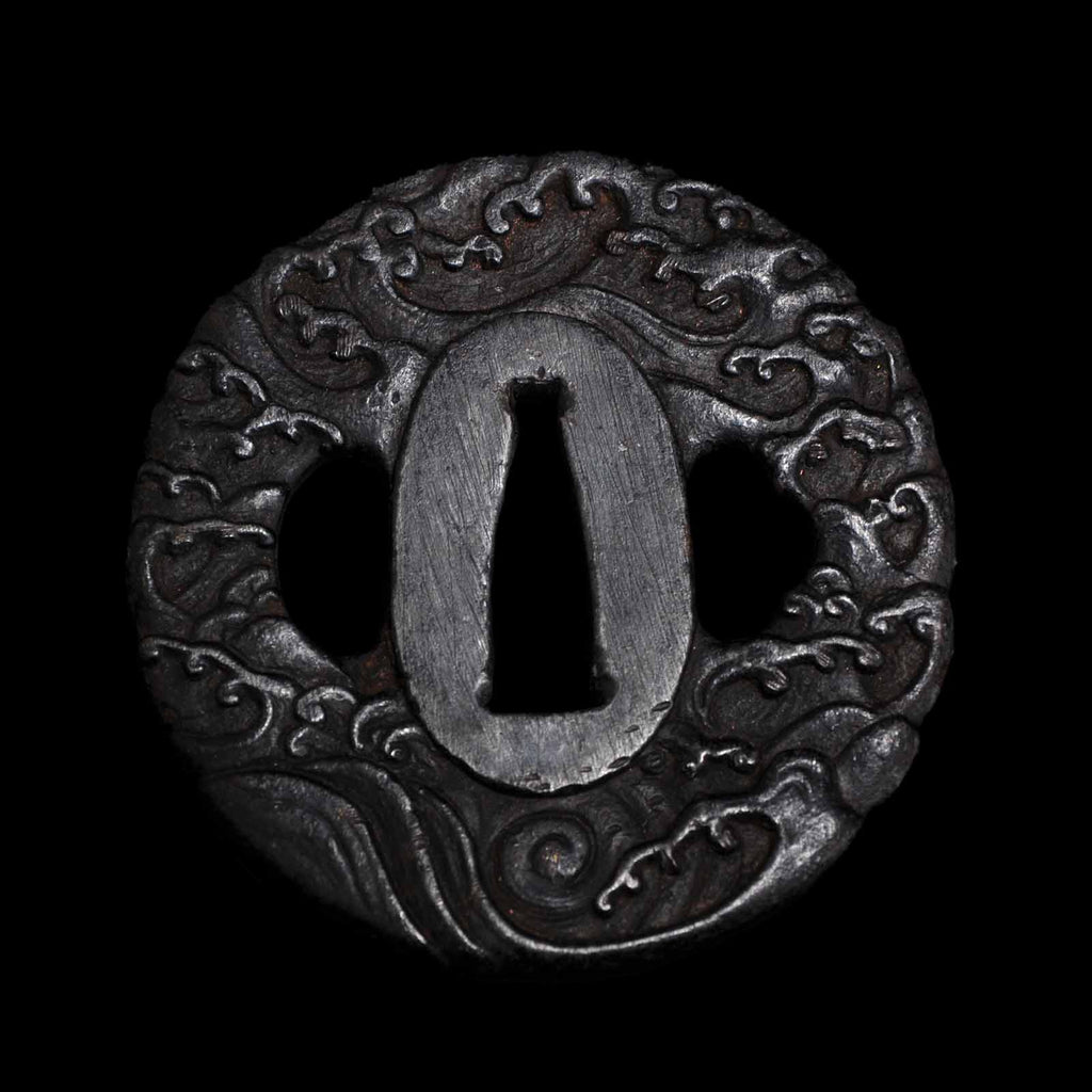 This piece has a very well-packed itame with a notare-like suguha hamon. The ha is spotted in places with gnome and choji nie, which is very interesting. The preservation is very good, the sword is very clean, and it is assumed that it has been carefully stored for a long time. There is a single forging flaw that appears about 8 cm from the moto on the sashiura side, but this does not detract greatly from the beauty of the piece. It is also equipped with an uchigatana koshirae. The metal fittings used for it are original to the period, with a crane and turtle motif on the fuchi-kashira and a fan on the menuki, making it very auspicious. This uchikatana koshirae is also equipped with a kozuka. The kozuka's design is decorated with auspicious peonies, lions, and butterflies.
