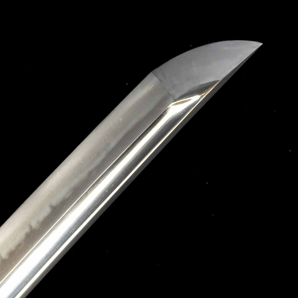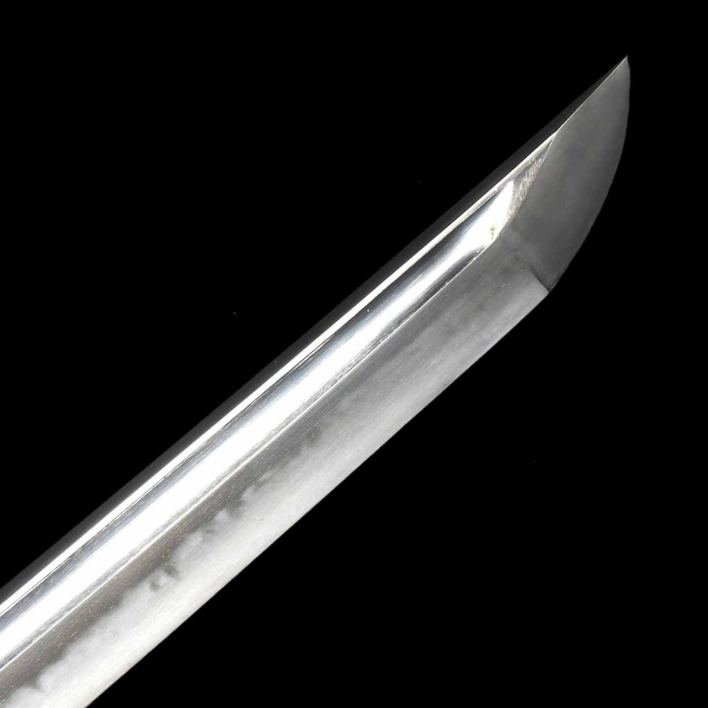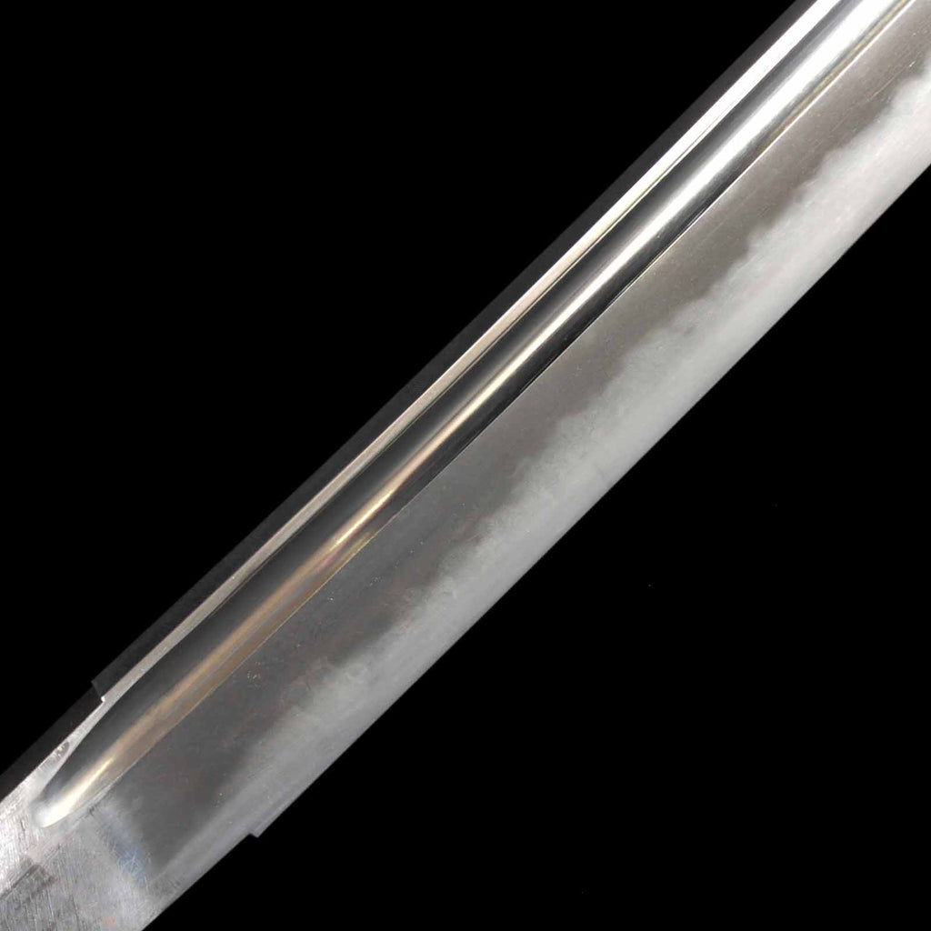 The hada is generally itame with very active hataraki such as chikei. Hamon is very beautiful with gorgeous jukachoji, reminiscent of the national treasure sanchomo, with ashi, yo, etc. appearing very gorgeously on the sword. Koshirae is decorated with modern metal fittings, which serve to further enhance the beauty of the sword blade. The tsuka cord is made of brown cowhide leather that fits well in the hand and is wrapped in a hinerimaki style. The lacquering of the saya is done in an angewisime that gives it an even more luxurious look.