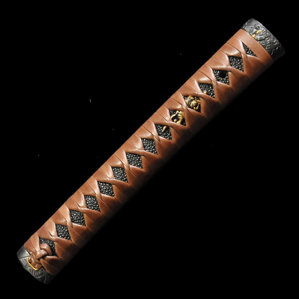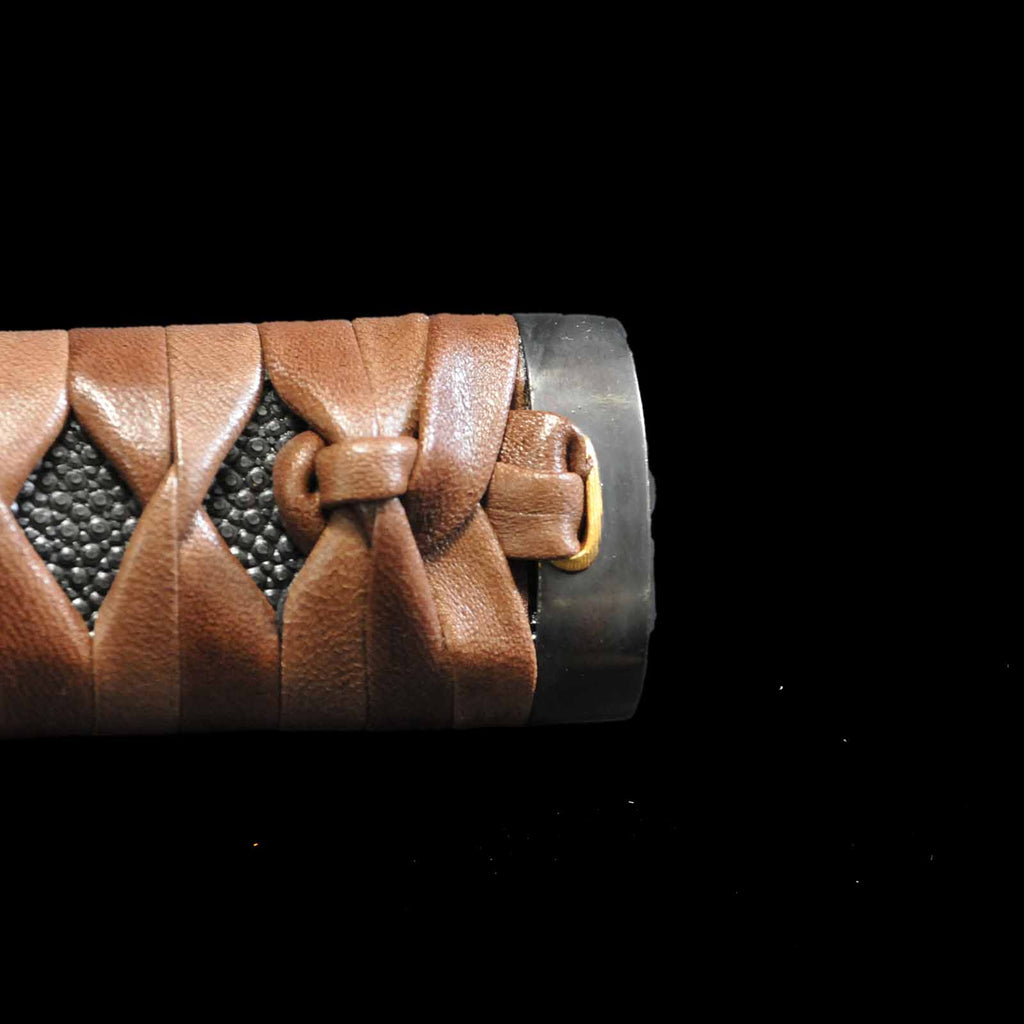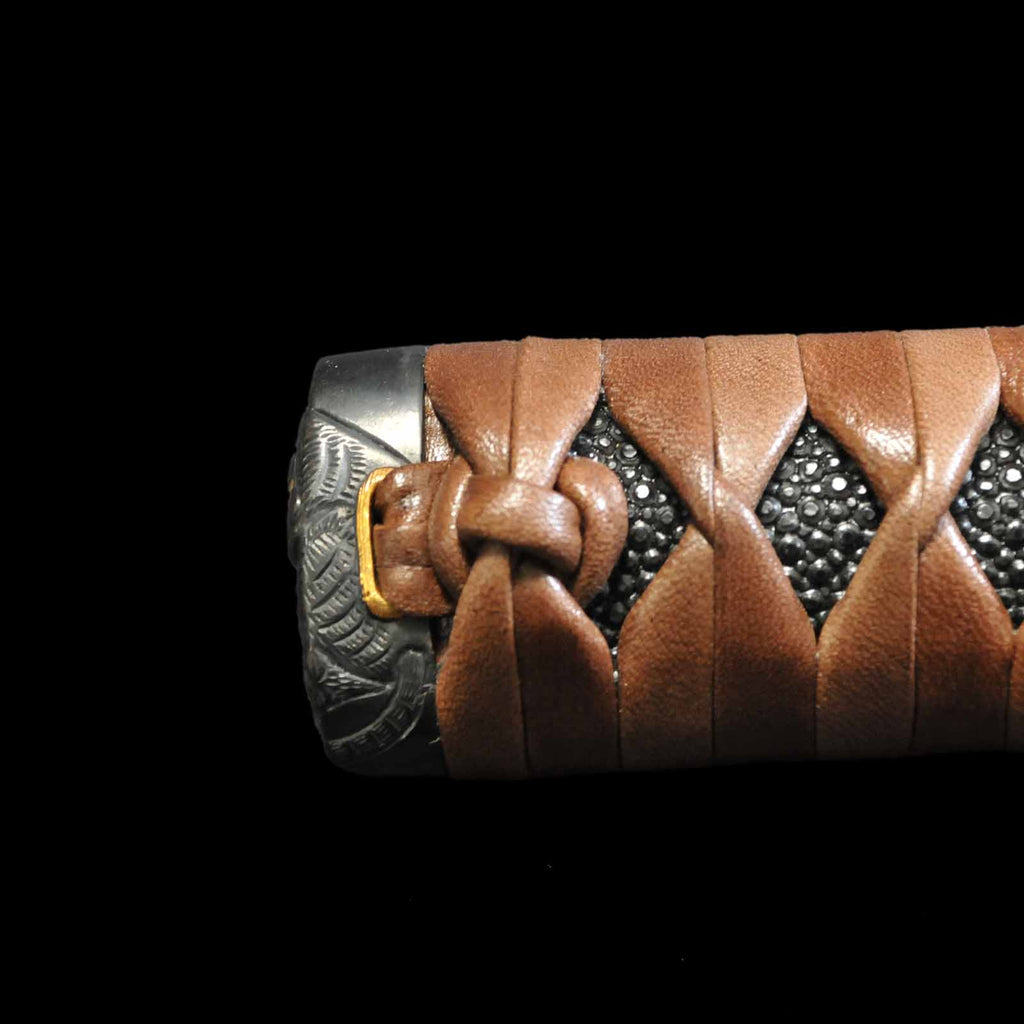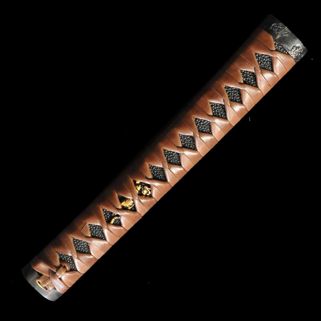 - Koshirae: Brown leather-wrapped Tsuka with Anshu-ishime lacquered Saya