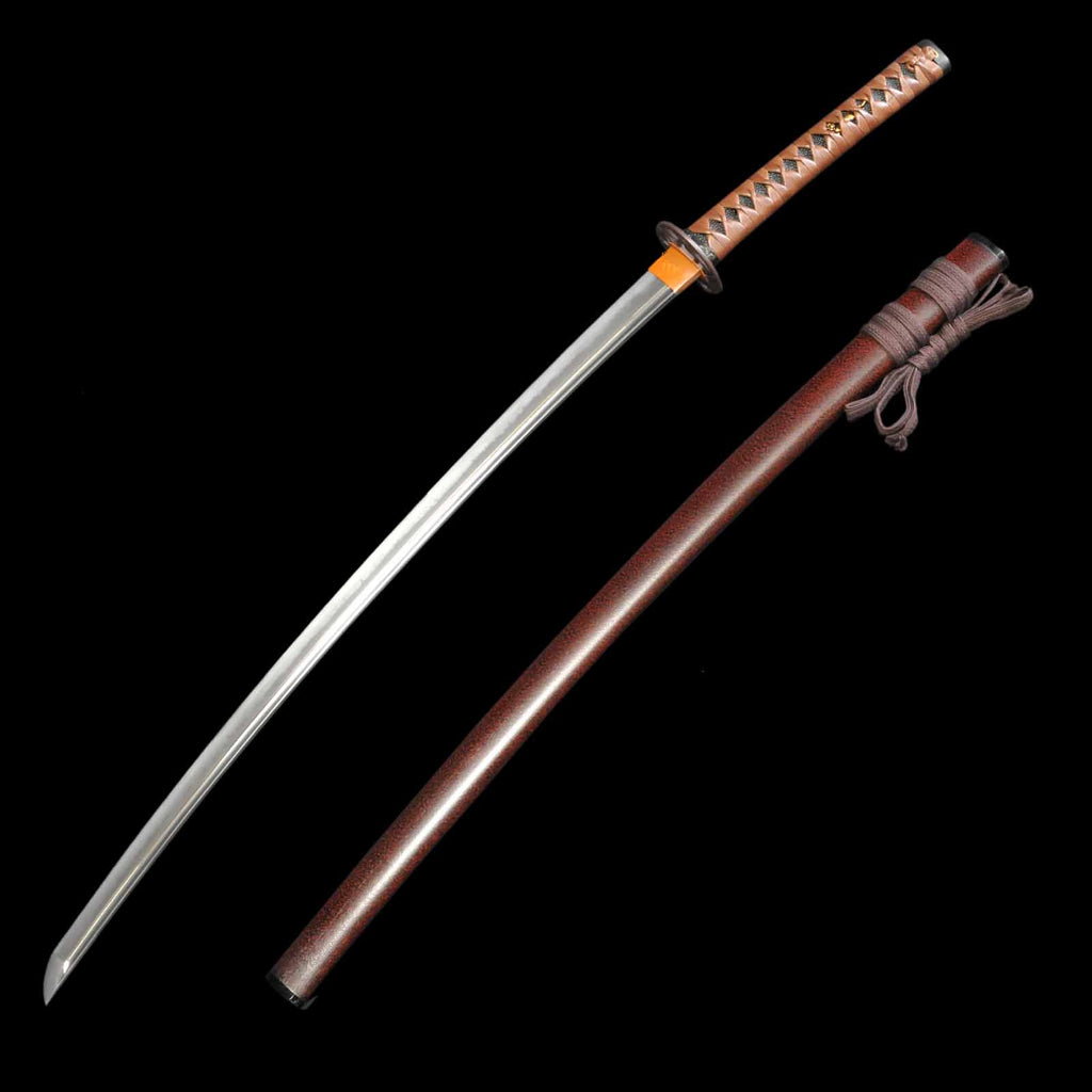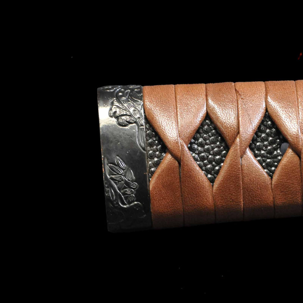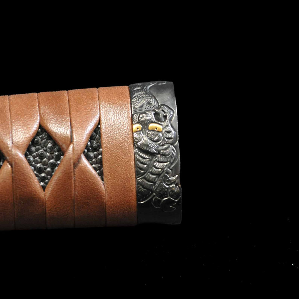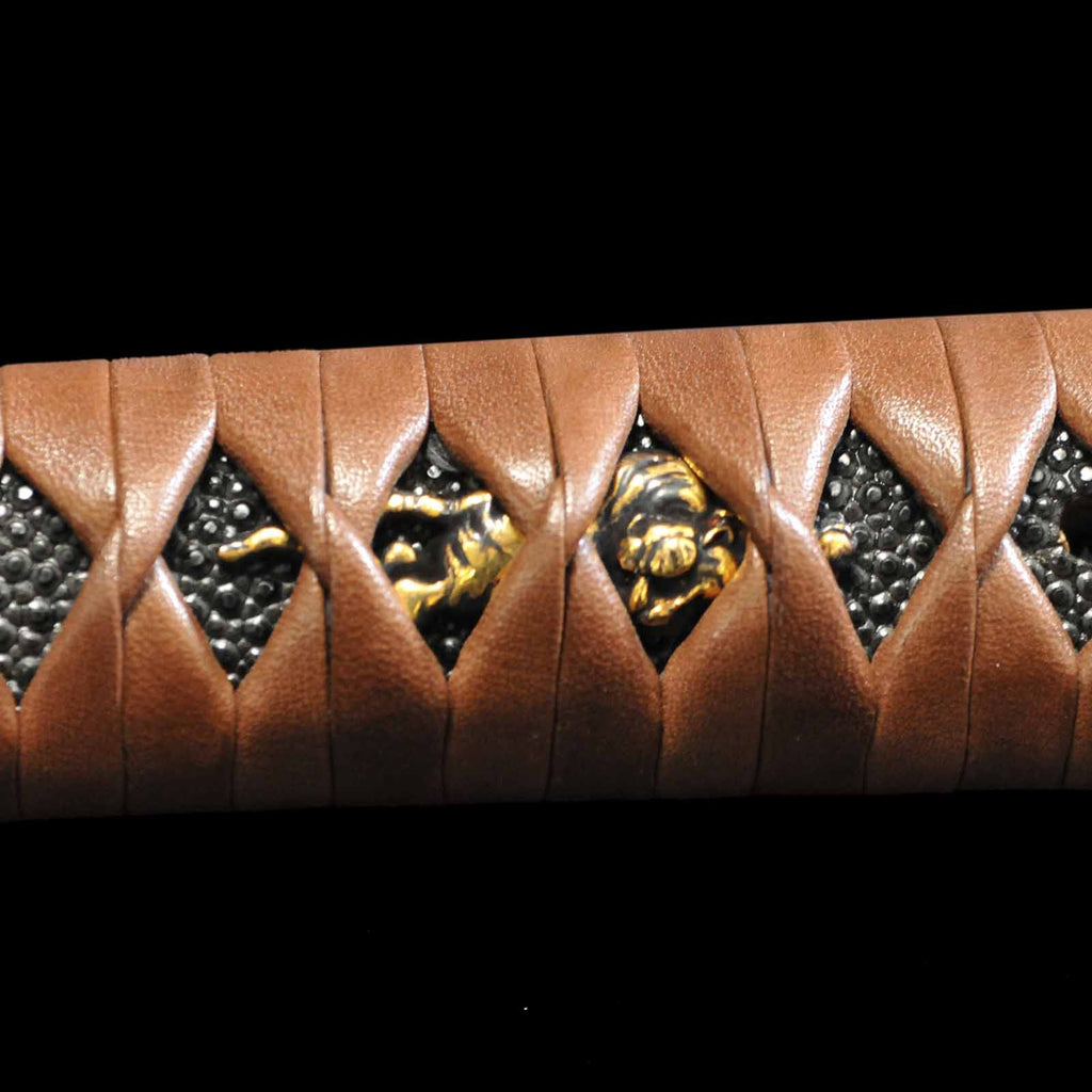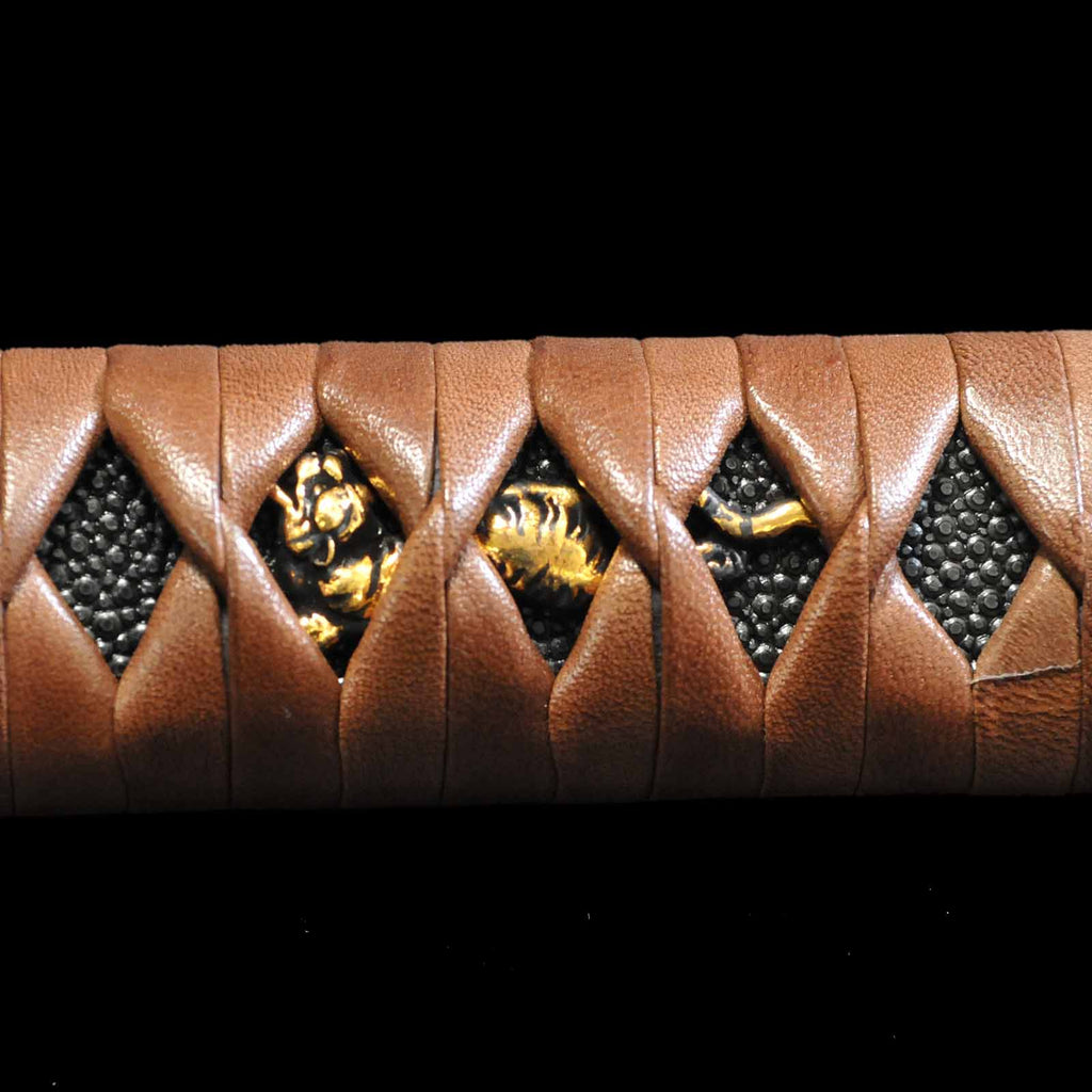 - Koshirae: Brown leather-wrapped Tsuka with Anshu-ishime lacquered Saya