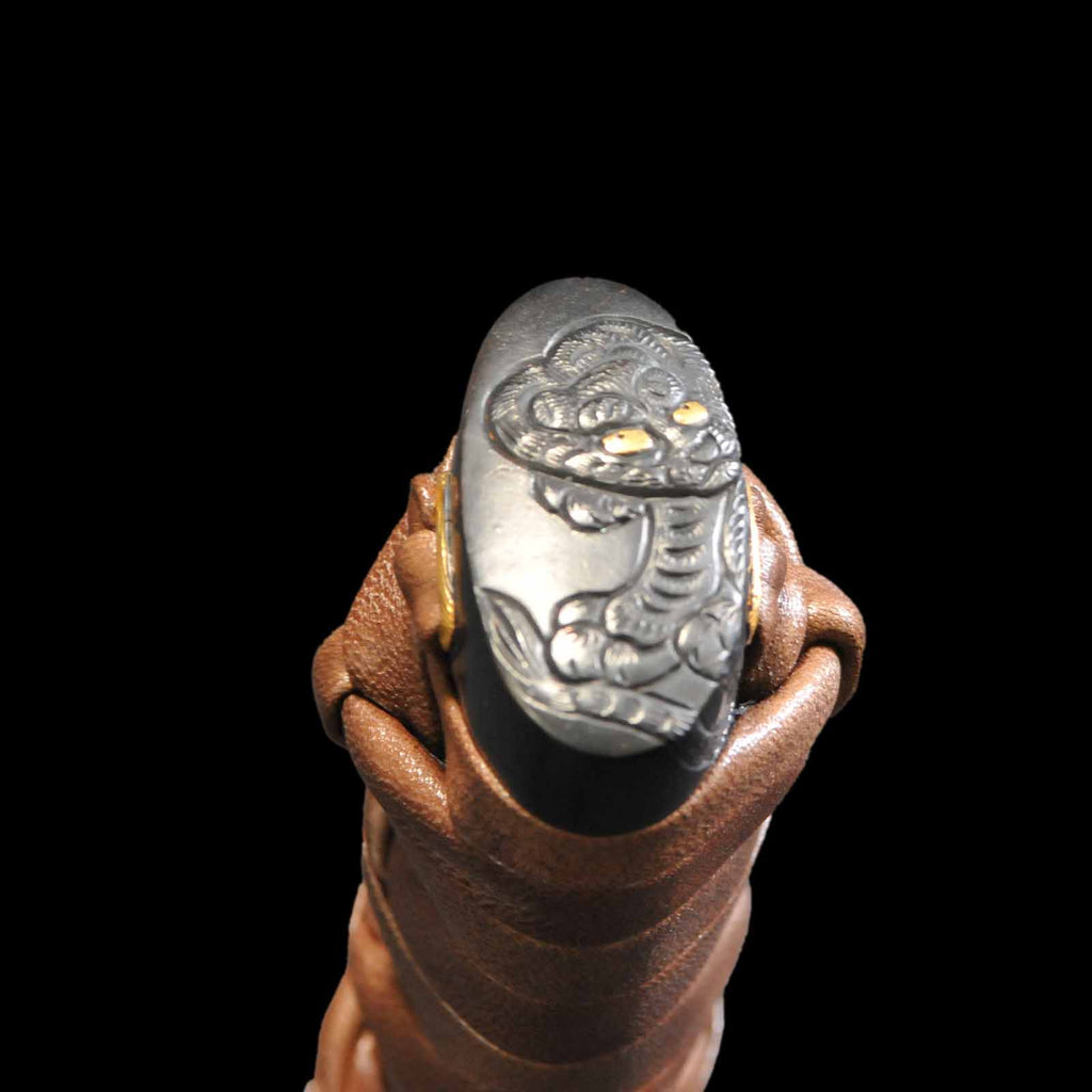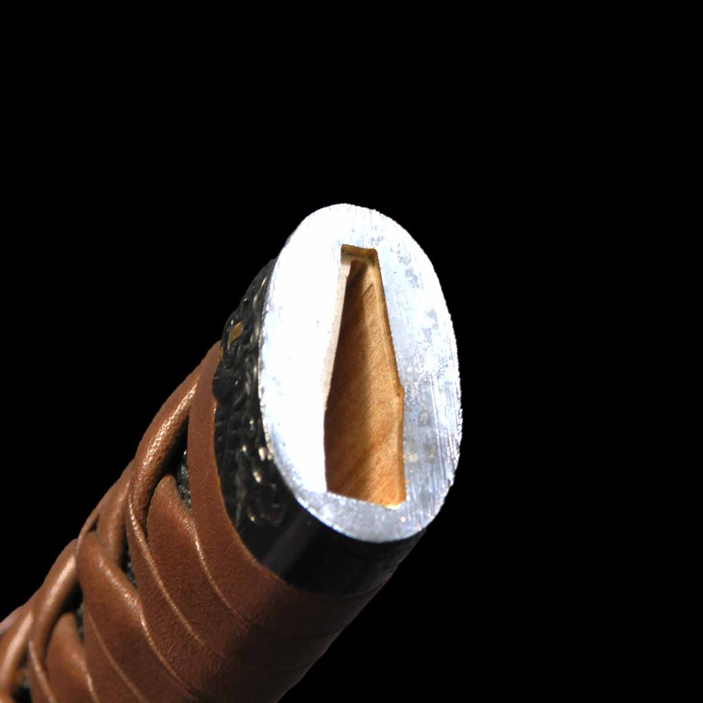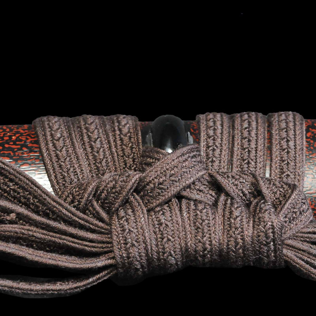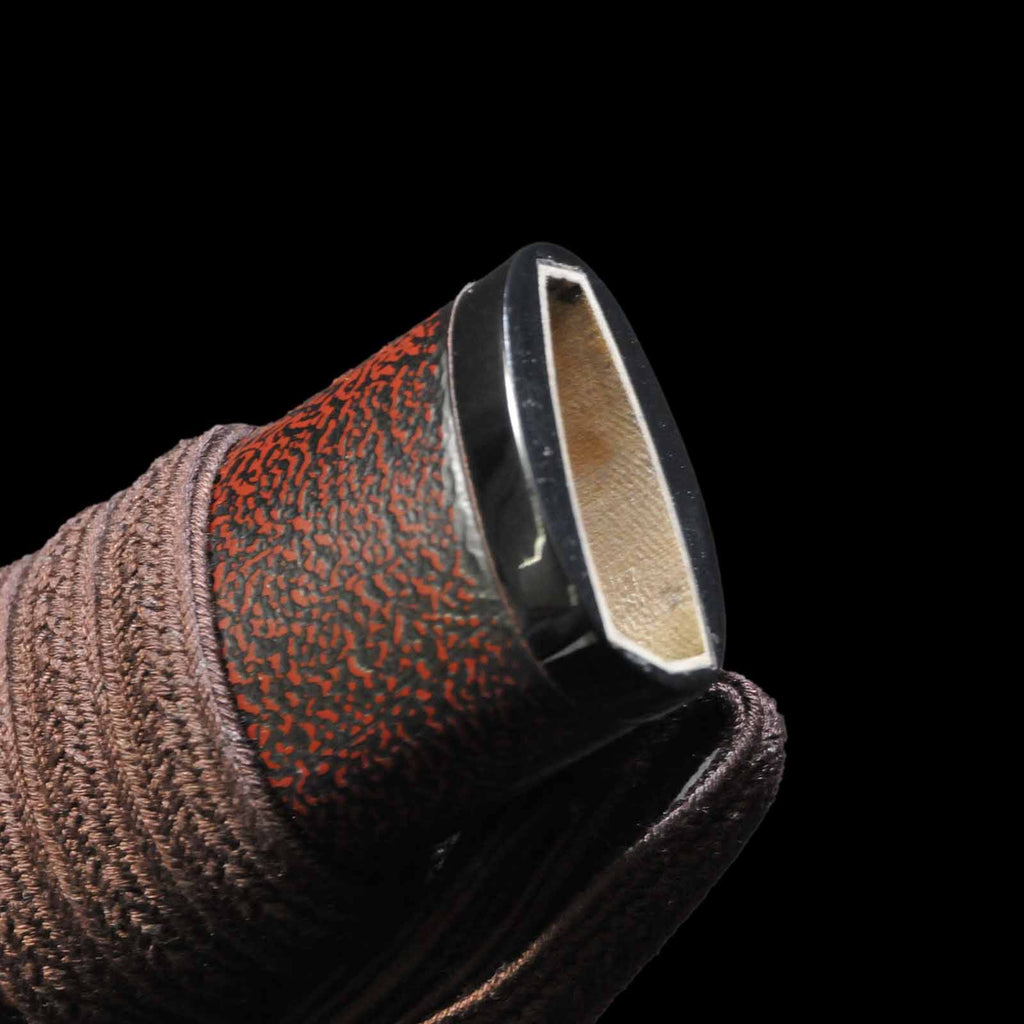 - Koshirae: Brown leather-wrapped Tsuka with Anshu-ishime lacquered Saya