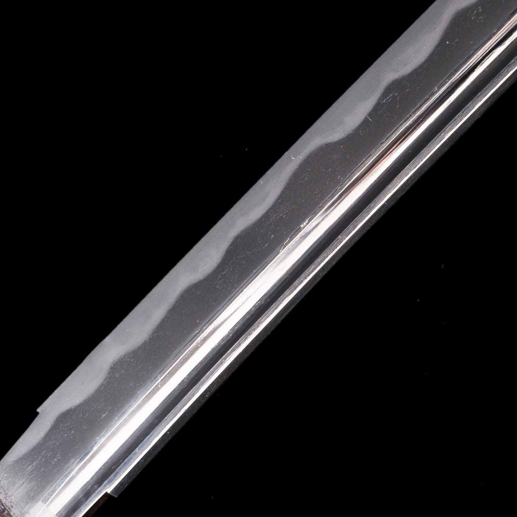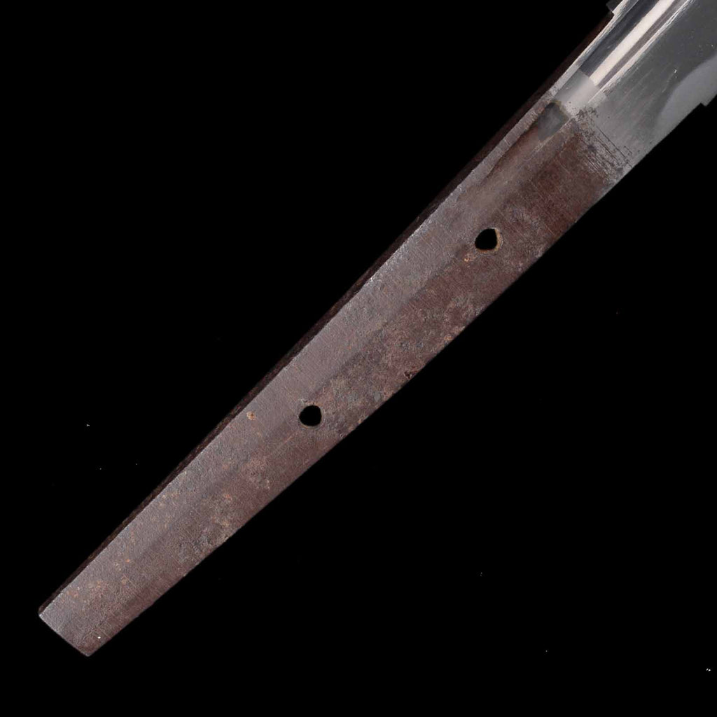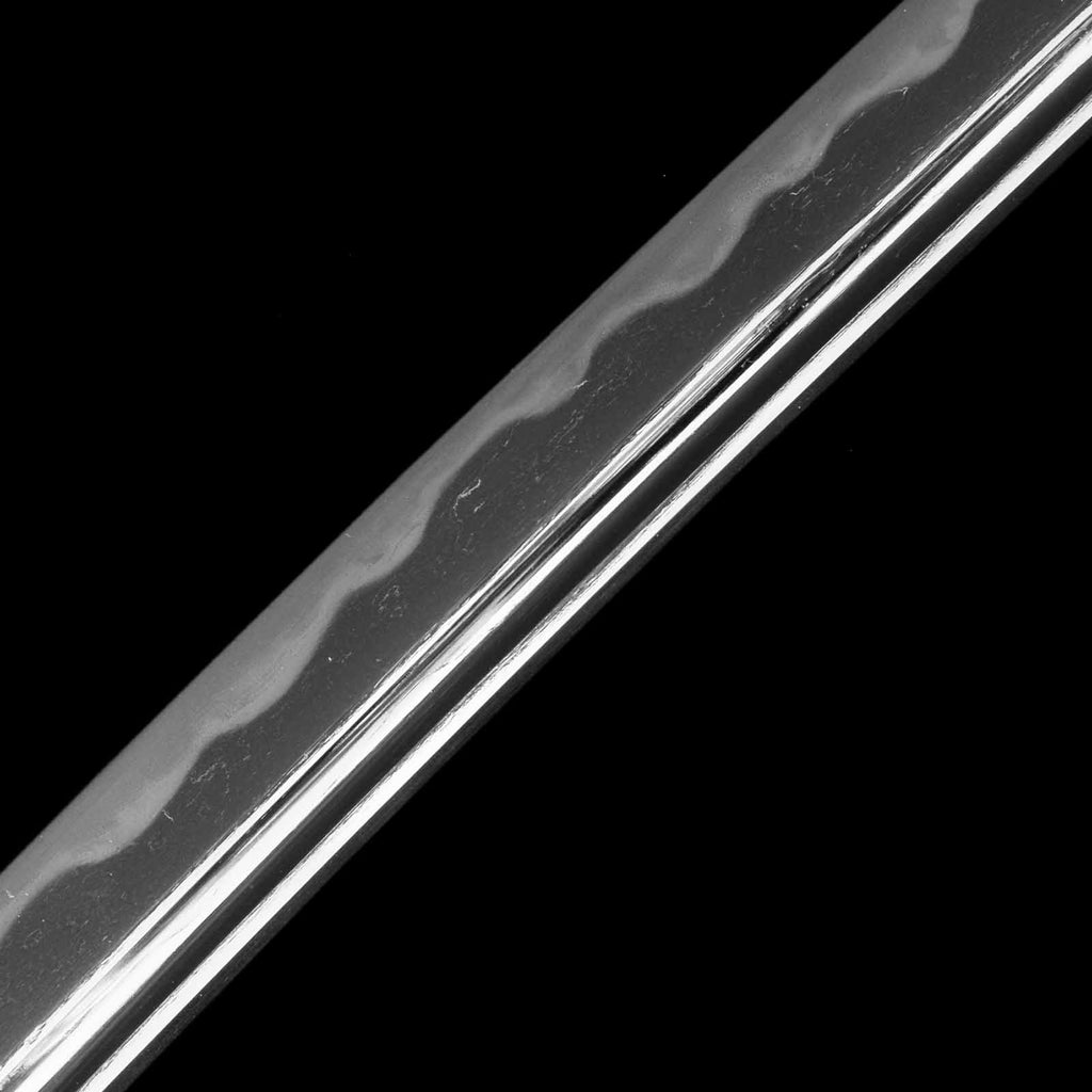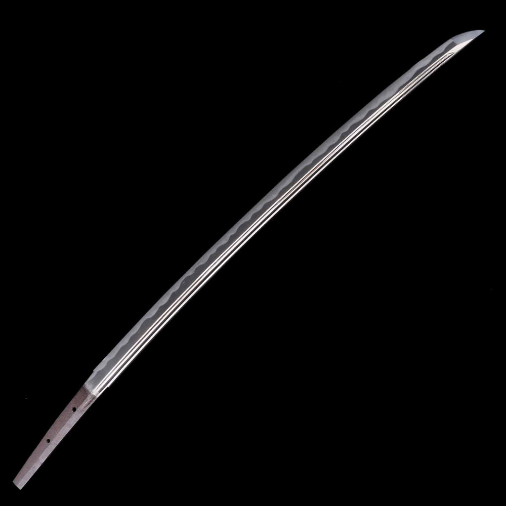 Considering its age, the blade's condition is remarkably good, showing almost no nicks, rust, or chips. The jigane features itame mixed with mokume, displaying patterns like yubashiri and chikei. The hamon features a prominent gunome pattern with niedeki, along with other patterns like ashi. Both sides of the blade are carved with Kakinagashi-style blood groove.