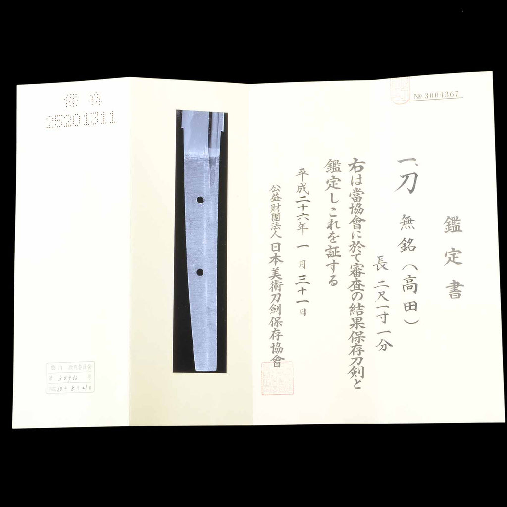 Although unsigned, the Society for the Preservation of Japanese Art Swords certified this as a Takada work in January 2014 and issued a Hozon certificate, recognizing its high value for preservation for future generations. Takada katana refers to Japanese swords produced in the Takada region of Bungo Province (present-day Tsurusaki area, Oita City) from the Kamakura period through the end of the Edo period. Many swordsmiths were active there, and the katana forged there were known for their high quality and circulated nationwide. Swords from the Nanboku-cho to Muromachi periods are called Ko Takada, those from the Sengoku to Azuchi-Momoyama periods are called Taira Takada, and those from later periods are called Fujiwara Takada.