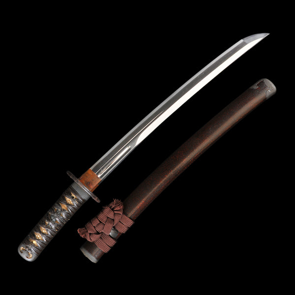 - Koshirae: Brown silk Tsuka with crimson Tamenuri-lacquered Saya, Shirasaya