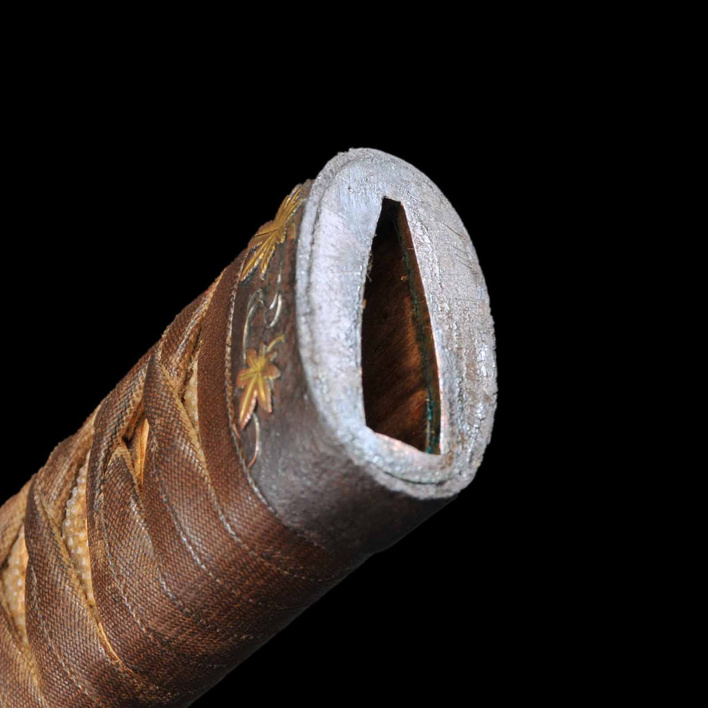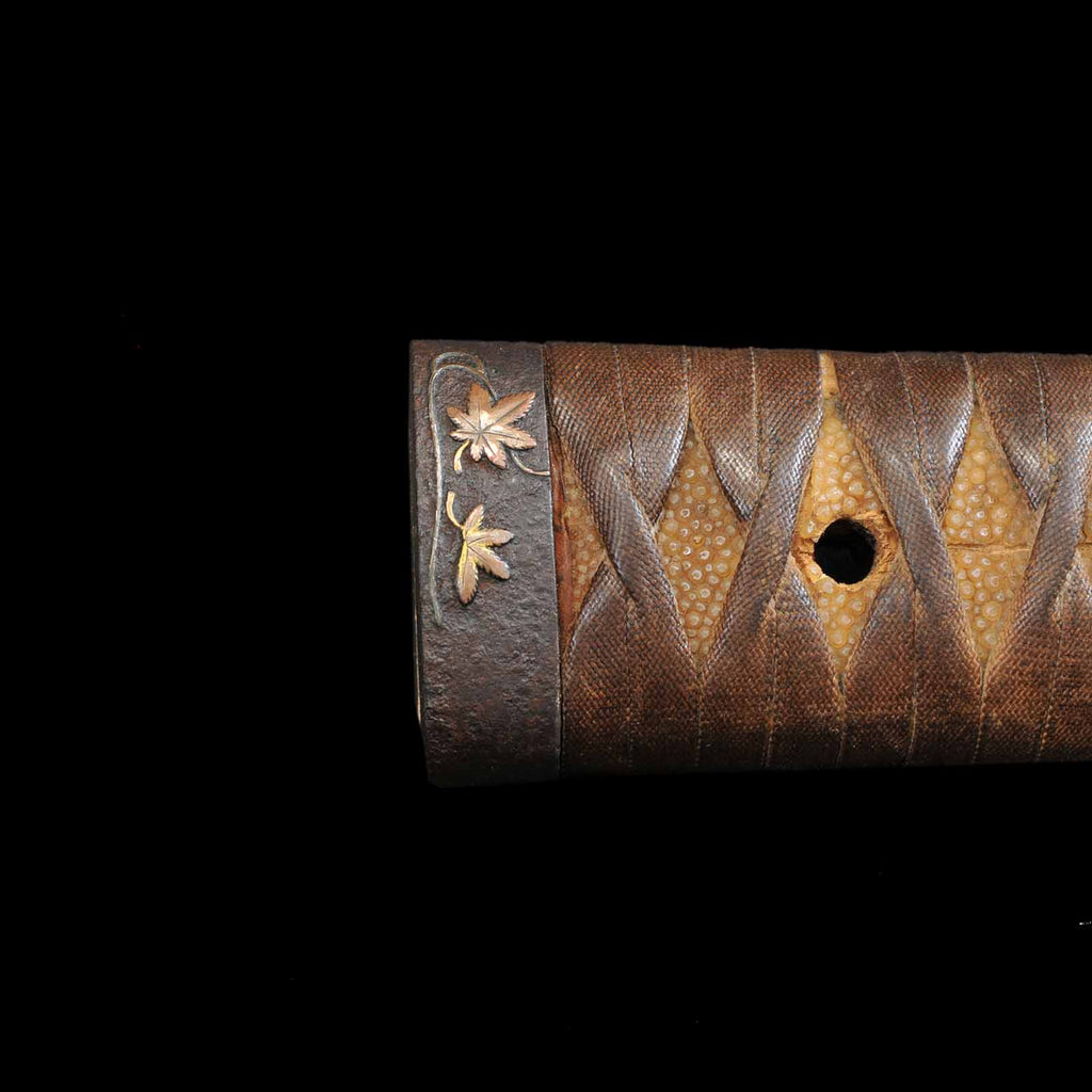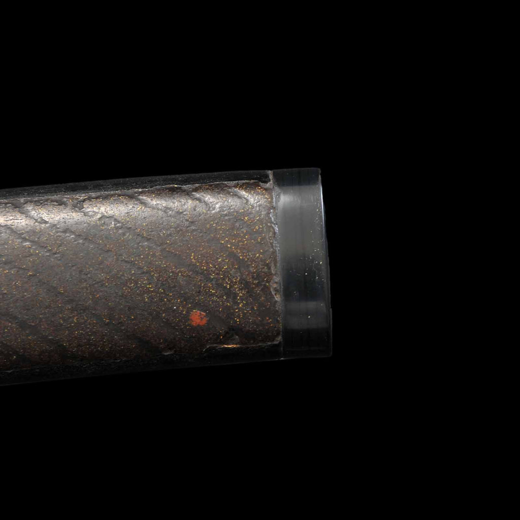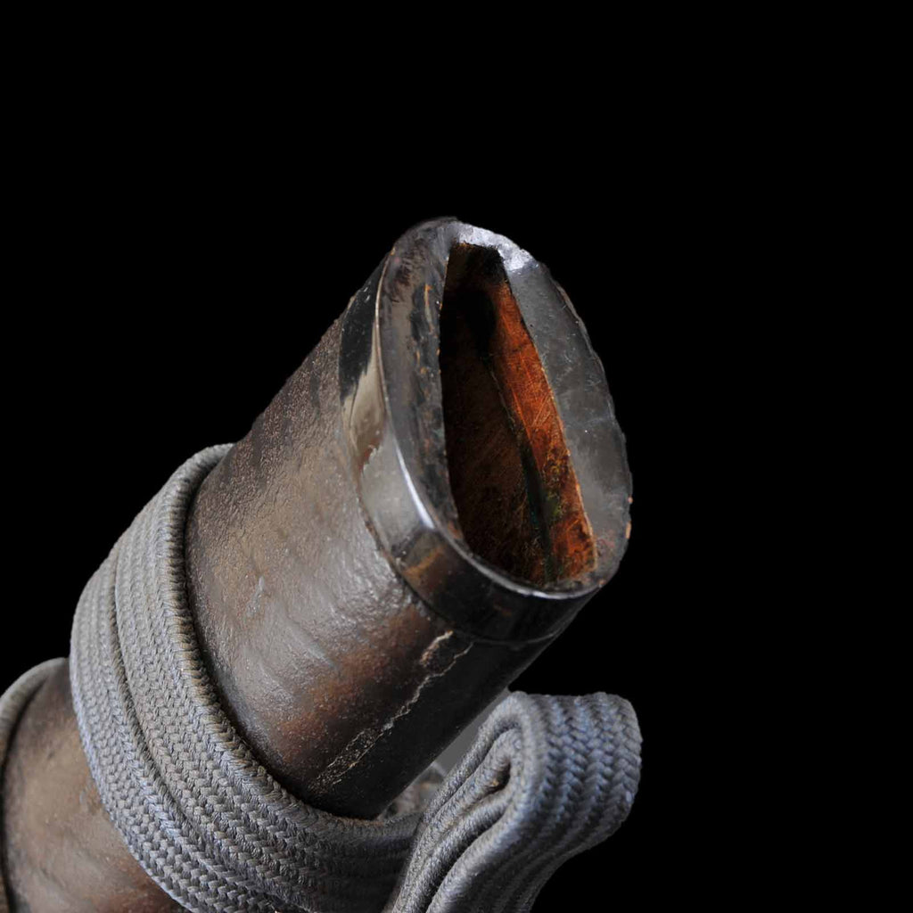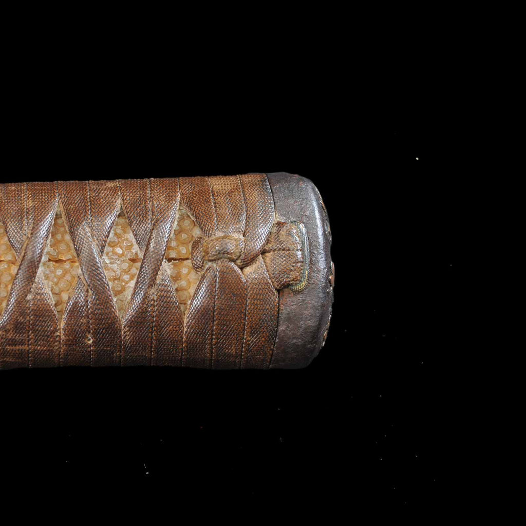 Koshirae is equipped with uchigatana, and the metal fittings and scabbard are the same as those used in those days. The tsuka cord is made of canvas and is of the tsumami style. Since it has actually been used, there is some discoloration on the surface due to age, but this has become a texture. The sheath is delicately lacquered with a unique grain-toned finish that matches well with the color of the tsukaito. The sheath has been repaired in recent years, and there are traces of cellophane tape that has been removed from the sashiura side.