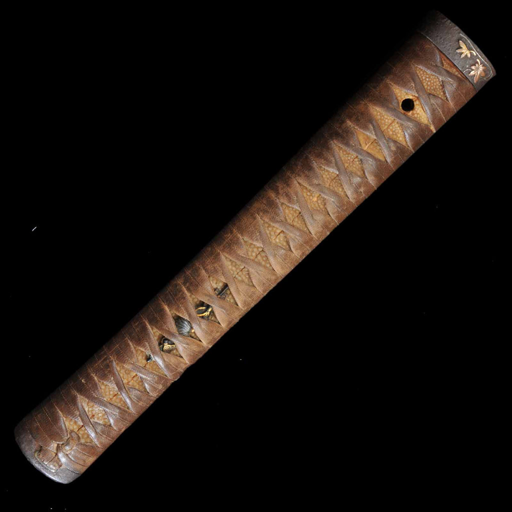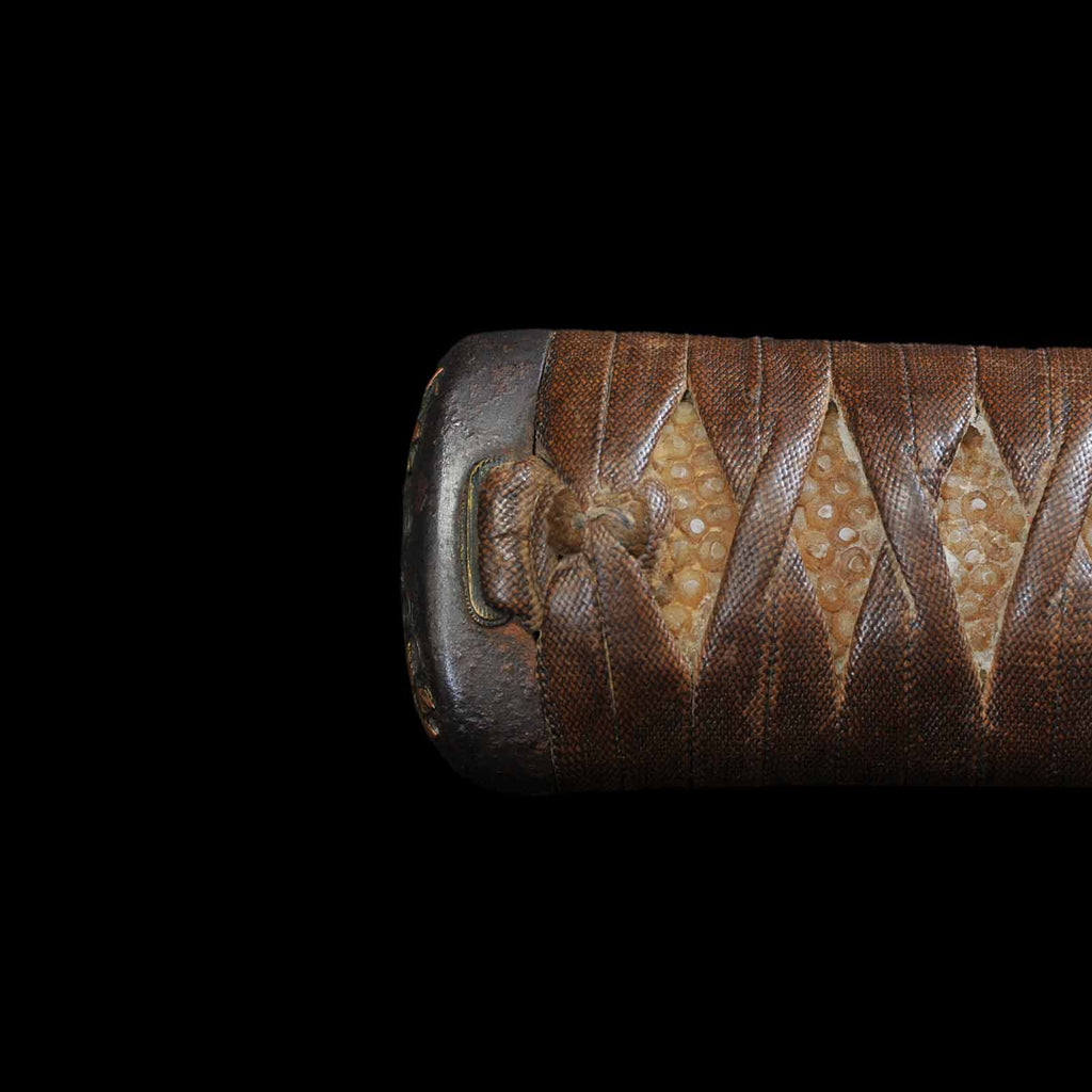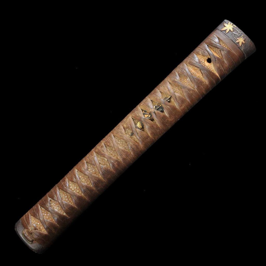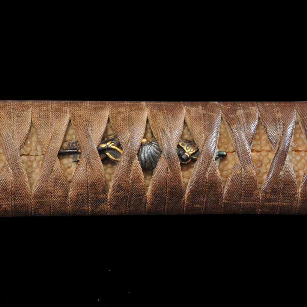Koshirae is equipped with uchigatana, and the metal fittings and scabbard are the same as those used in those days. The tsuka cord is made of canvas and is of the tsumami style. Since it has actually been used, there is some discoloration on the surface due to age, but this has become a texture. The sheath is delicately lacquered with a unique grain-toned finish that matches well with the color of the tsukaito. The sheath has been repaired in recent years, and there are traces of cellophane tape that has been removed from the sashiura side.