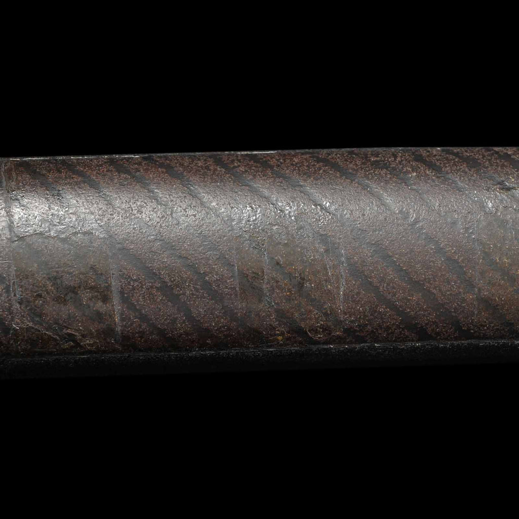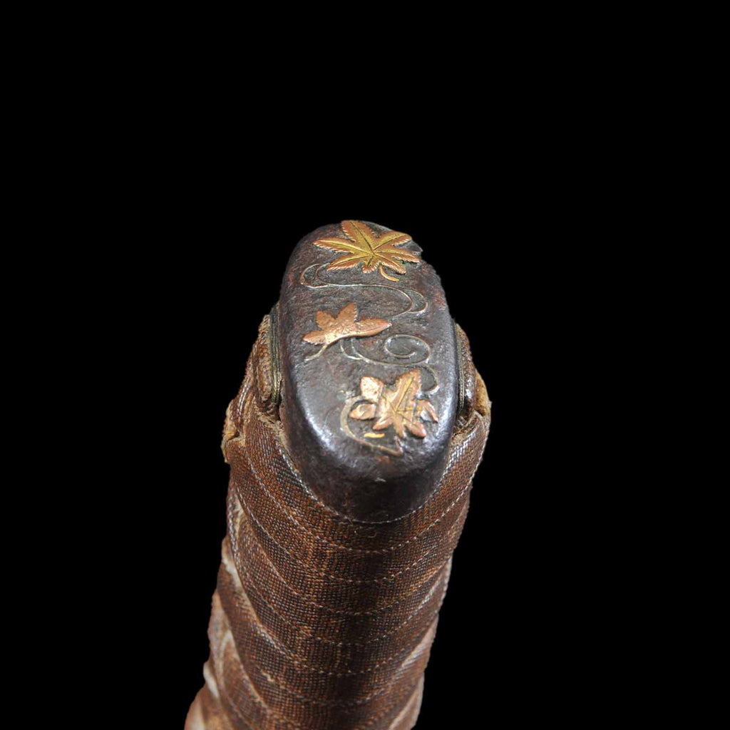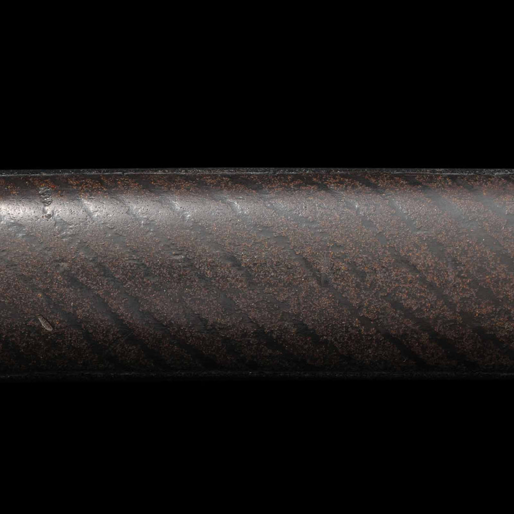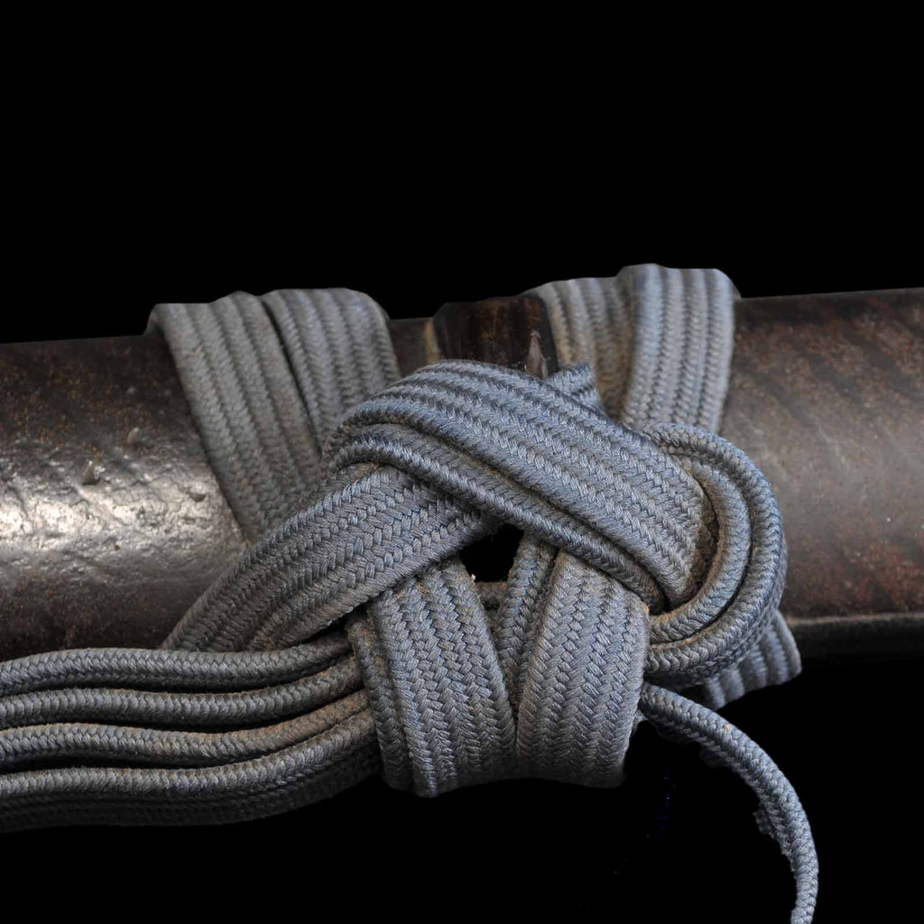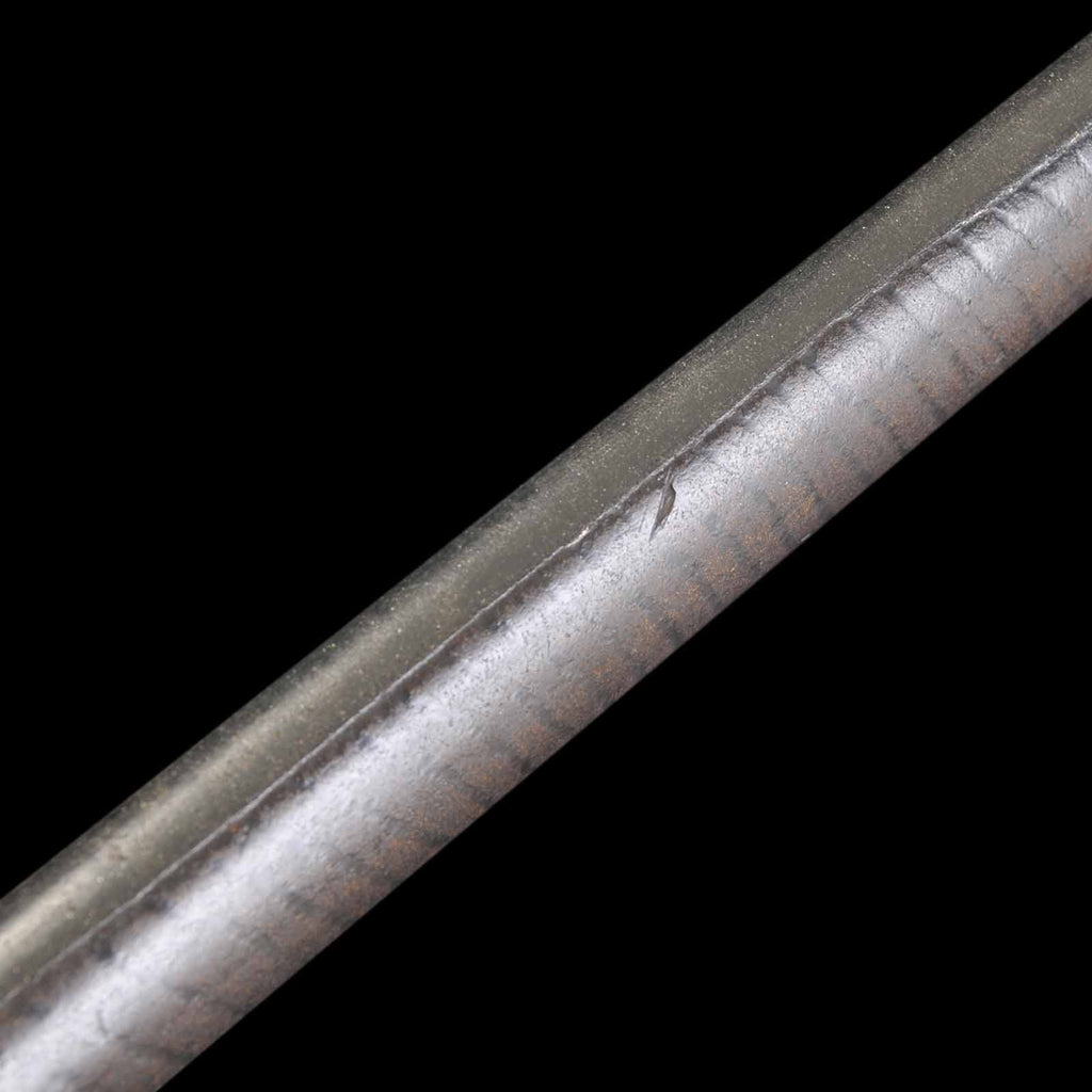 Koshirae is equipped with uchigatana, and the metal fittings and scabbard are the same as those used in those days. The tsuka cord is made of canvas and is of the tsumami style. Since it has actually been used, there is some discoloration on the surface due to age, but this has become a texture. The sheath is delicately lacquered with a unique grain-toned finish that matches well with the color of the tsukaito. The sheath has been repaired in recent years, and there are traces of cellophane tape that has been removed from the sashiura side.