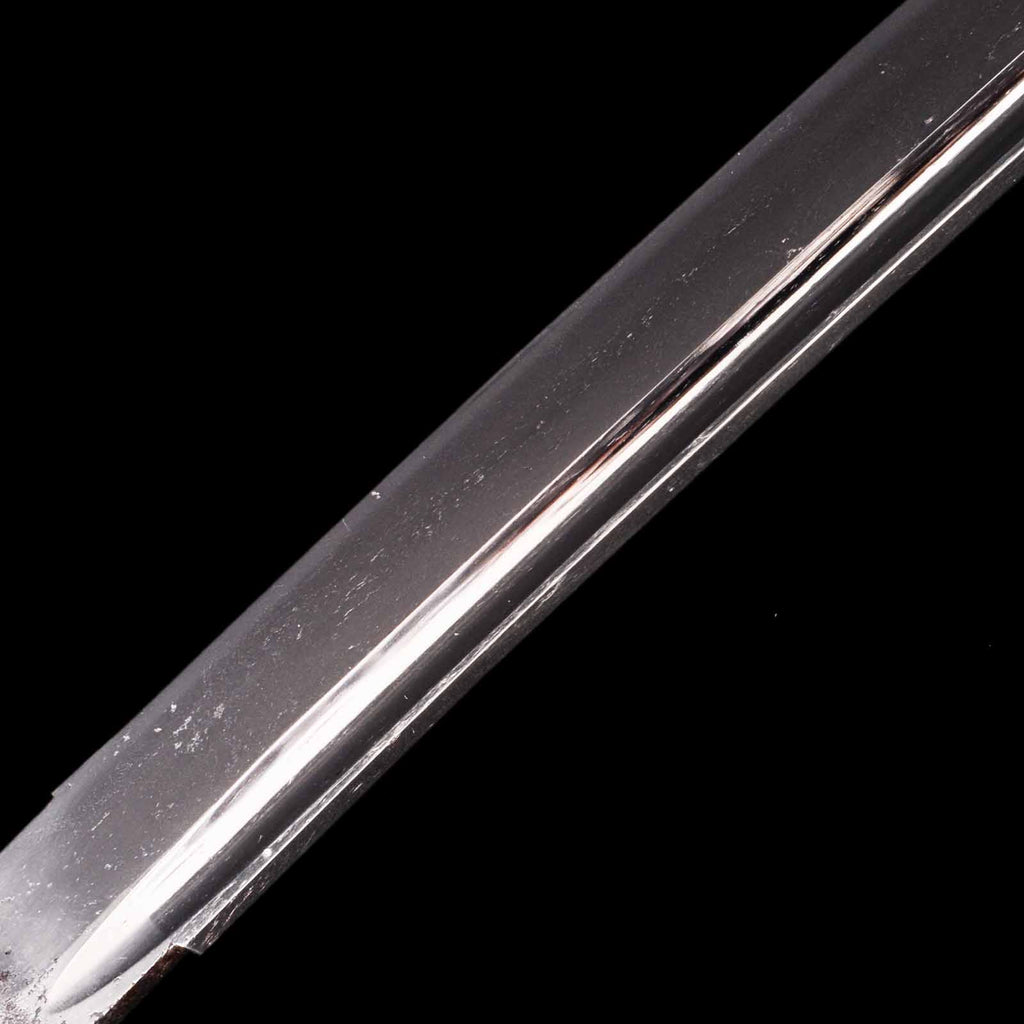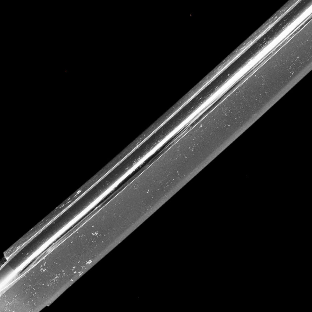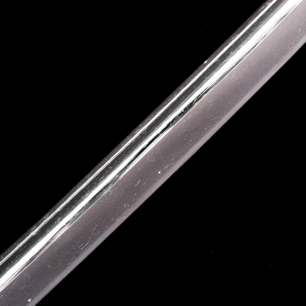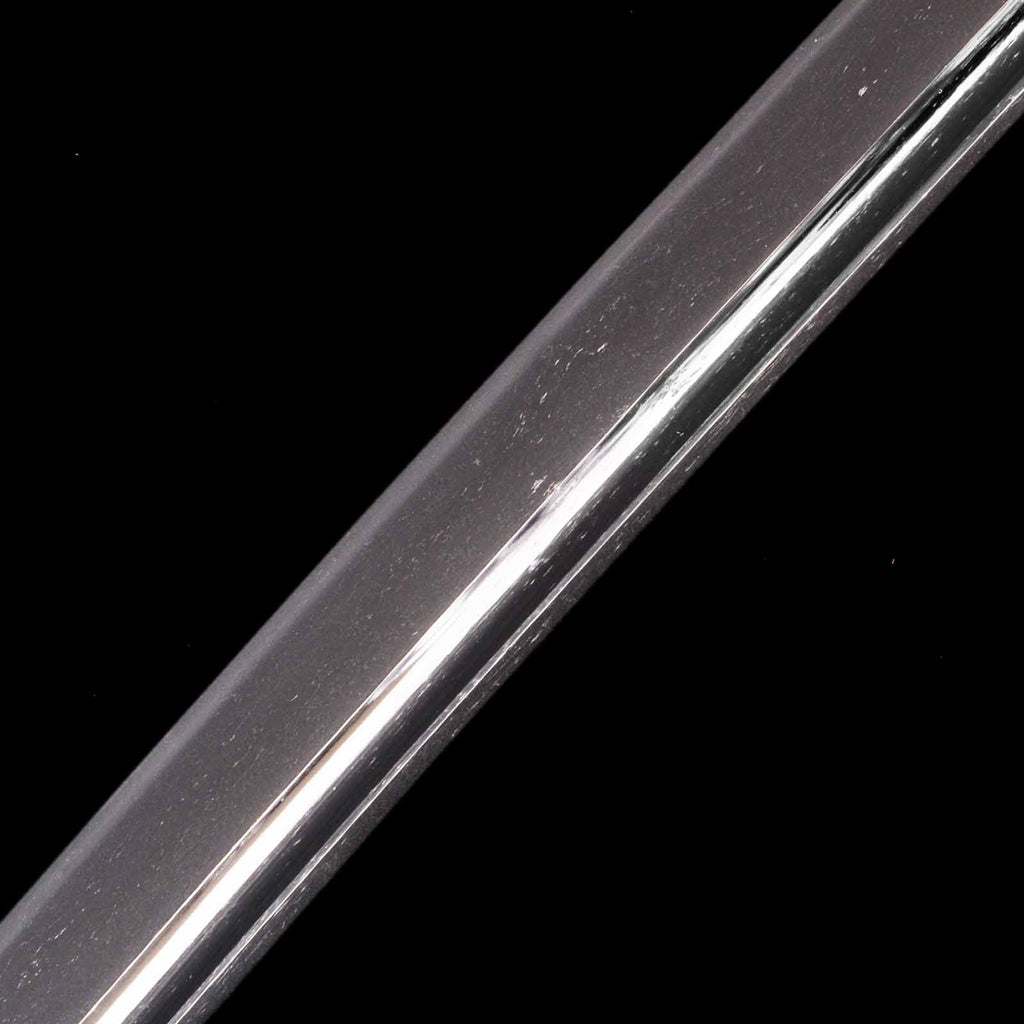 Considering its estimated age, the blade is in remarkably good condition. On the sashimote side, approximately 8 cm from the kissaki, there is a 1.8 cm wide Fukure-like forging mark. On the sashiura side, forging flaws are visible around 15 cm from the kissaki, and at 29 cm and 36 cm, there are dot-like flaws known as uchikomi. The jigane exhibits a well-kneaded itame grain with occasional mokume patterns, featuring a very fine suguha hamon. A kakinagashi-style groove is carved along both sides of the blade.