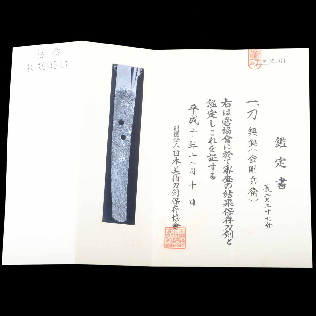 An unsigned katana forged during the Koto period has arrived. In December 1999, the Society for the Preservation of Japanese Art Swords certified this blade as the work of Kongo Hyoe, recognizing its value as a sword worthy of preservation for posterity, and issued a Hozon certificate.