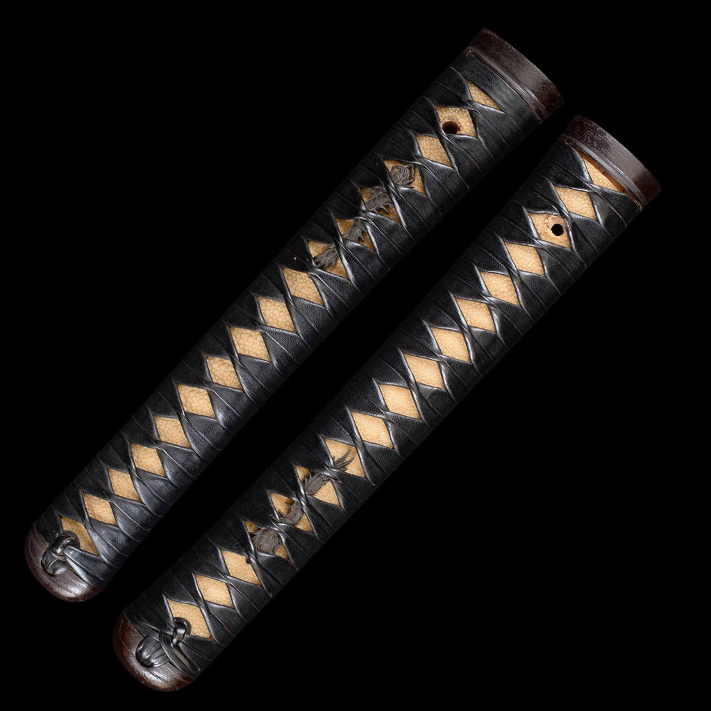- Koshirae: Black leather wrapped Tsuka with Kuro-ro lacquered Saya/Shirasaya