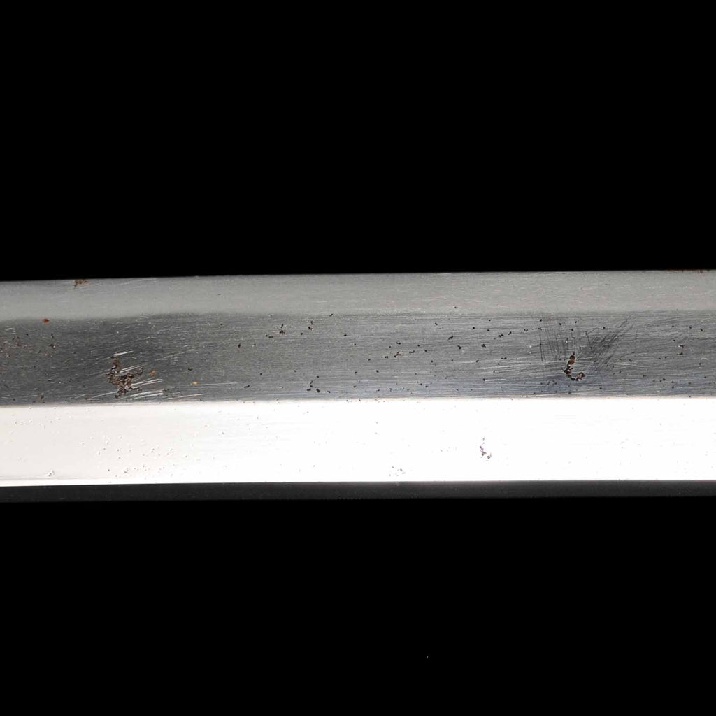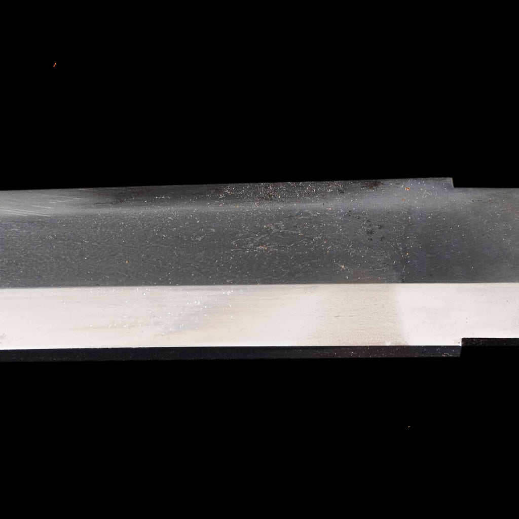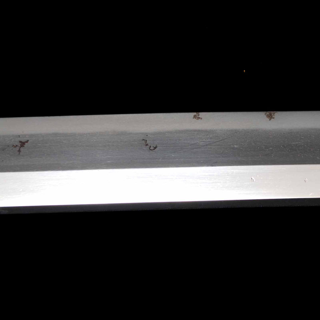 As for the condition of the blade, it is not in good condition with some flaws, rust, and scratches in places, but the surface of the blade has been sharpened and the hada and hamon are well visible. The hada is well packed with itame and is called konuka hada, which is often seen in the works of the Hizen School. Yubashiri and chikei are also common. Hamon is a well-packed suguha that is very elegant. The nakago is engraved with Fujiwara Tadahiro, the recipient of the Omi Daijo who lived in the country of the Hizen.