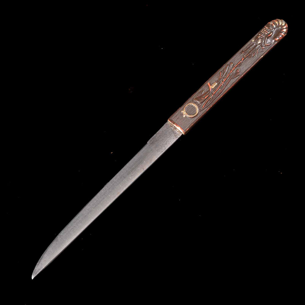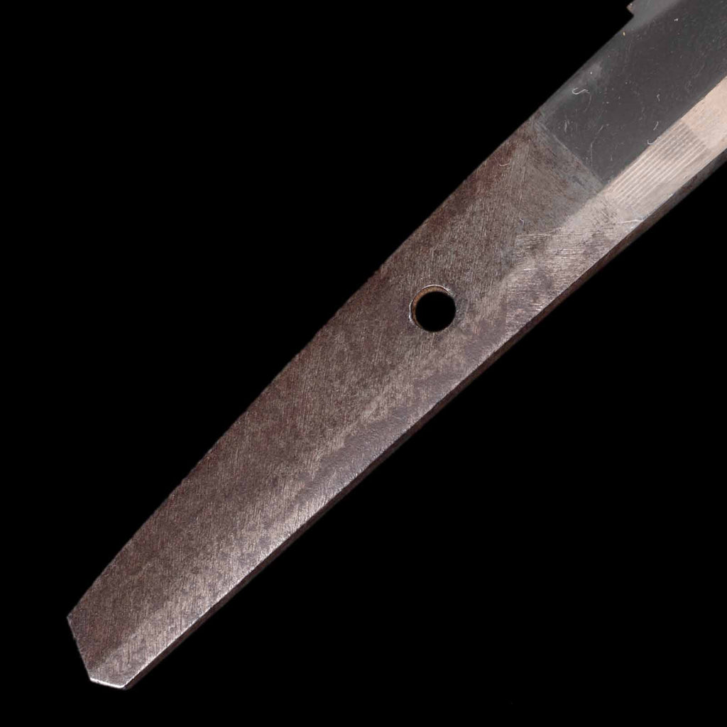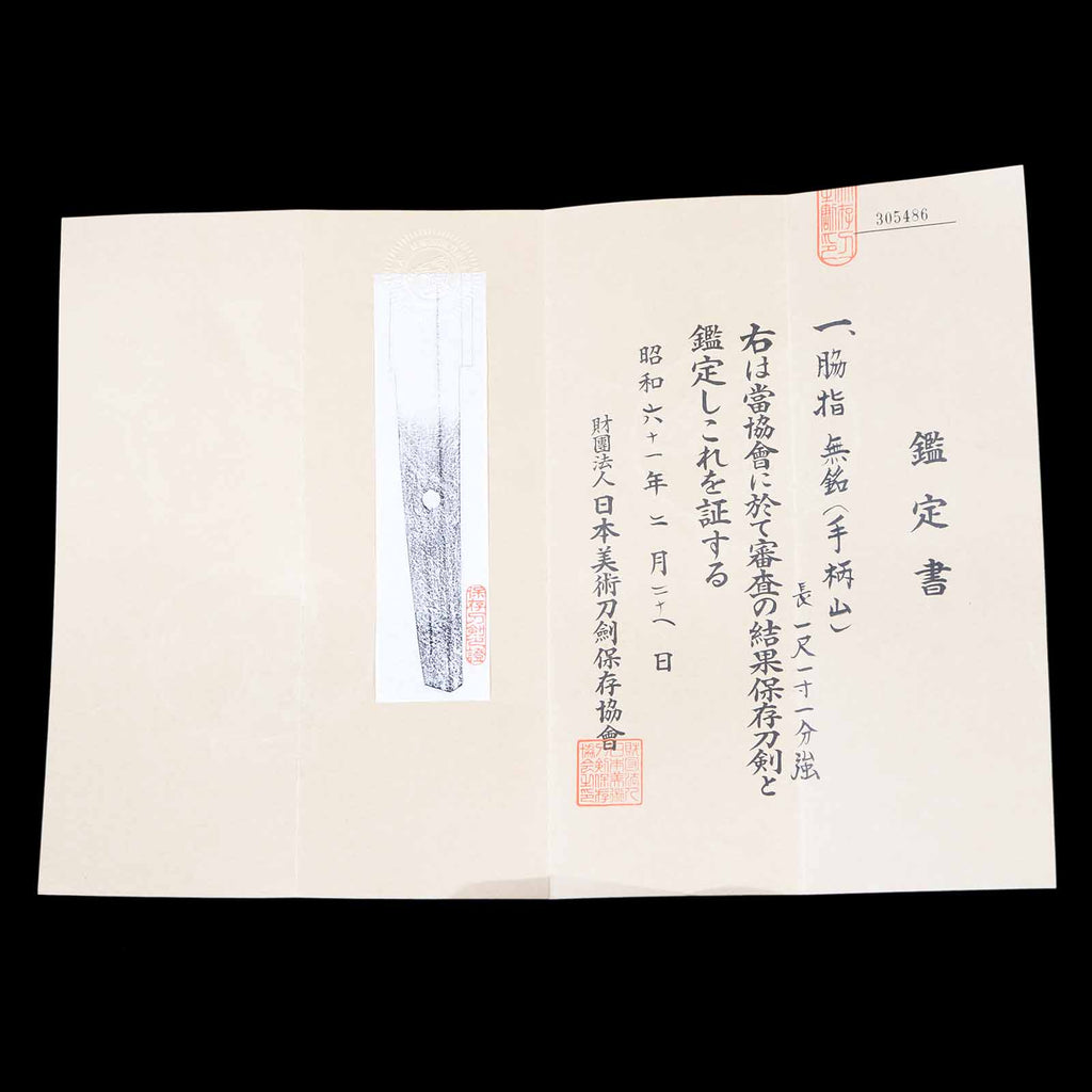 Although this blade is unsigned, in February 1986, the Society for the Preservation of Japanese Art Swords authenticated it as a genuine work by Tegarayama and issued a certificate of appraisal. The Tegarayama school was a group of swordsmiths active around Tegarayama, a small hill in what is now southwest Himeji City, Harima Province (present-day Hyogo Prefecture).
