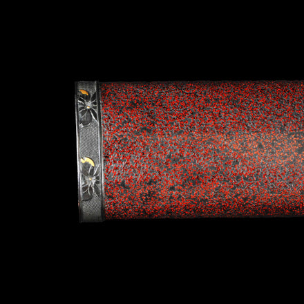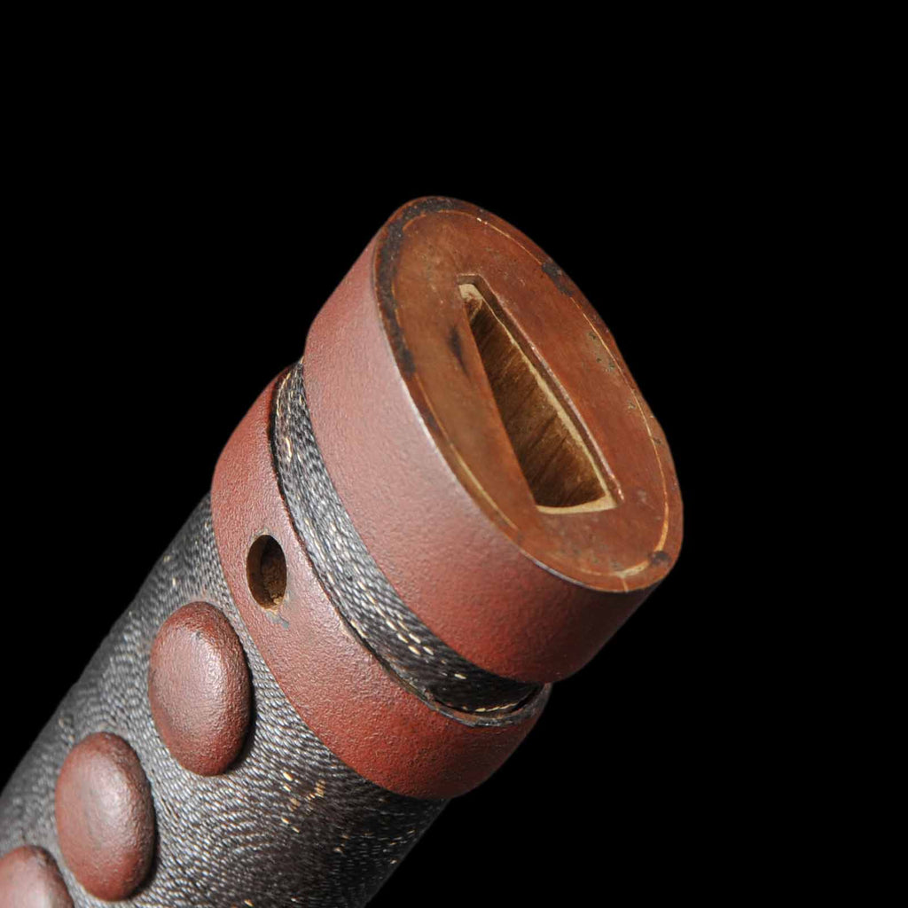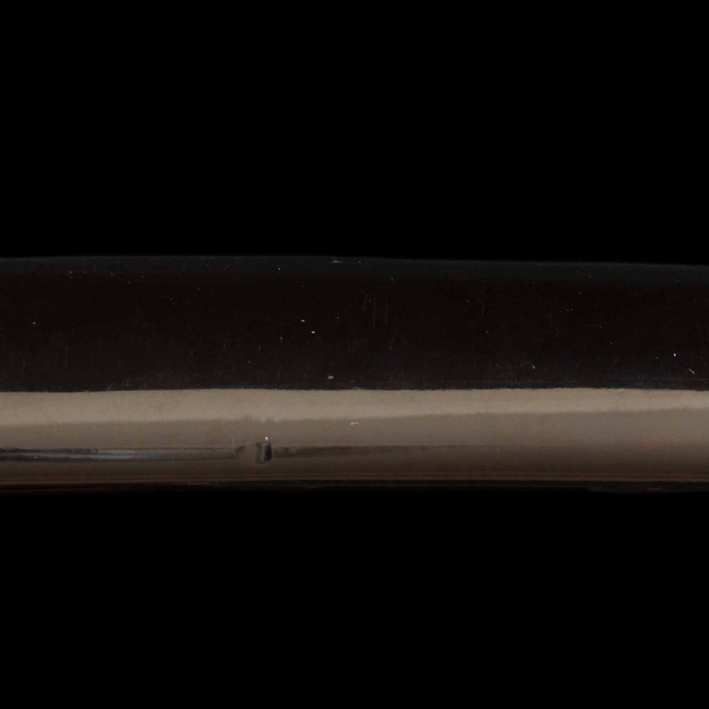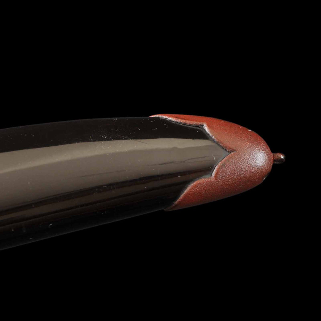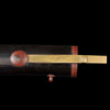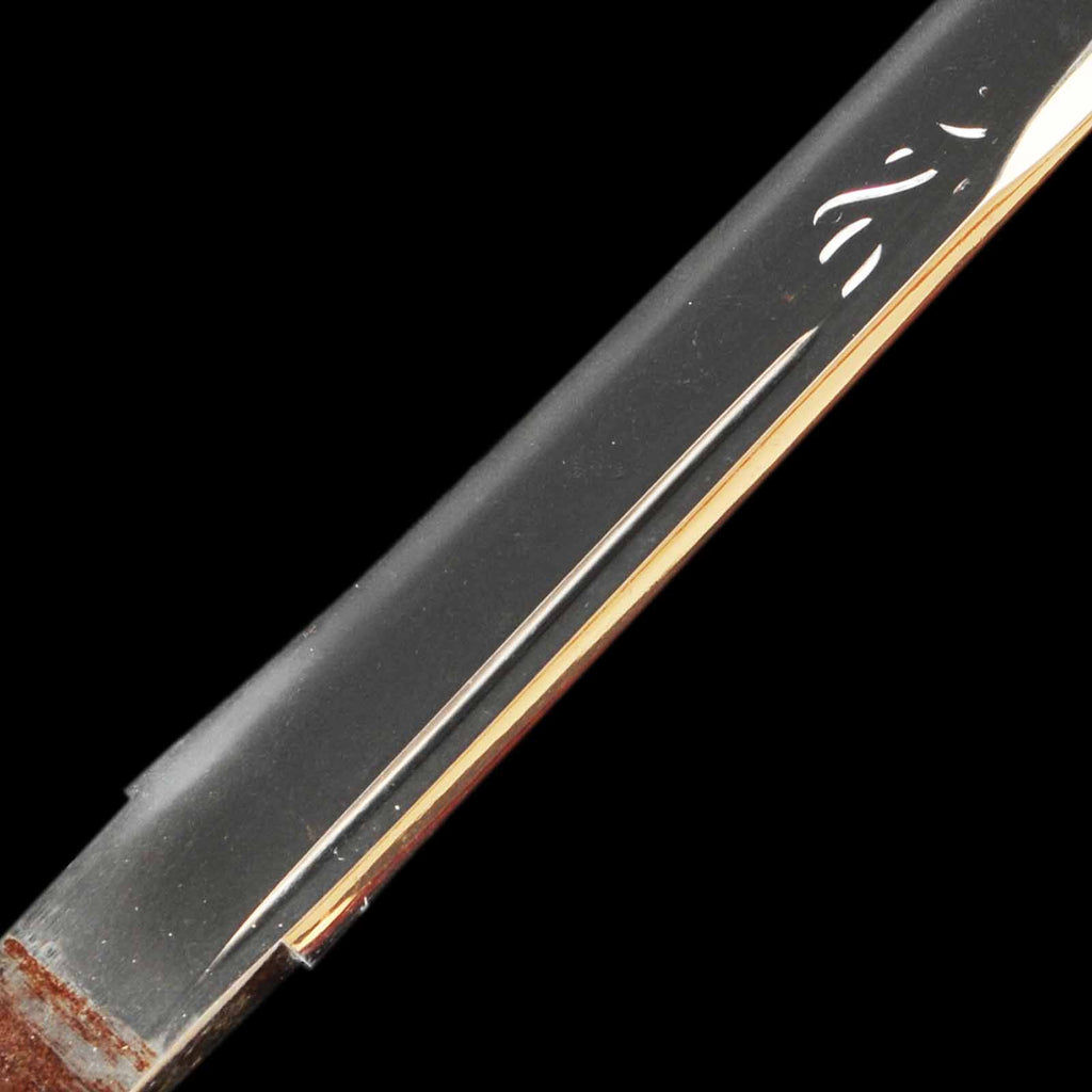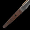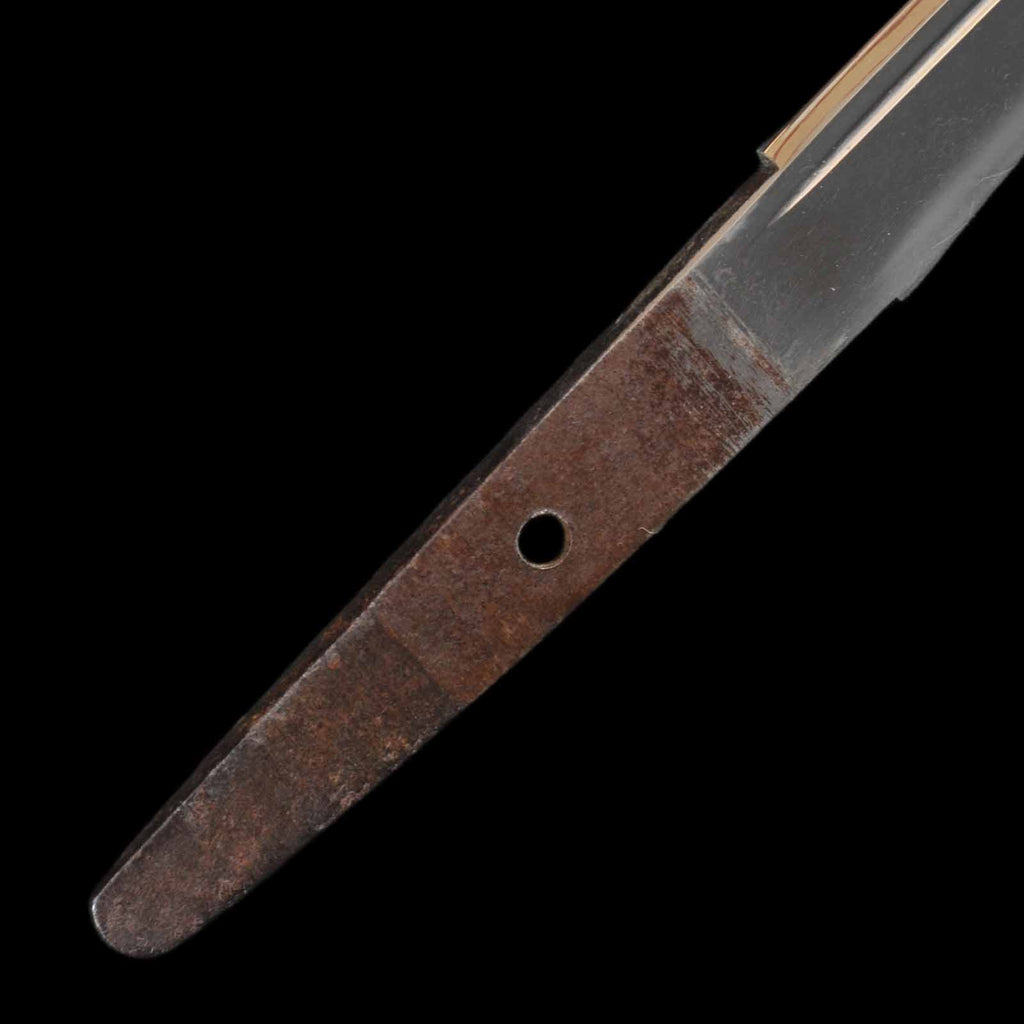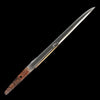 The koshirae features a Toppei-style scabbard with a pointed tip. The tsuka-maki is not made using traditional methods but is riveted, giving it a distinctly Western feel. Additionally, a brass plate protrudes from the scabbard, functioning as a stopper secured through the tsuba's hole to prevent the scabbard from accidentally slipping off.