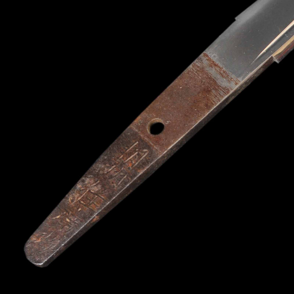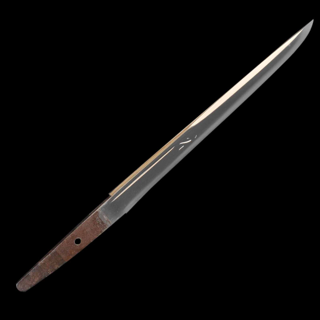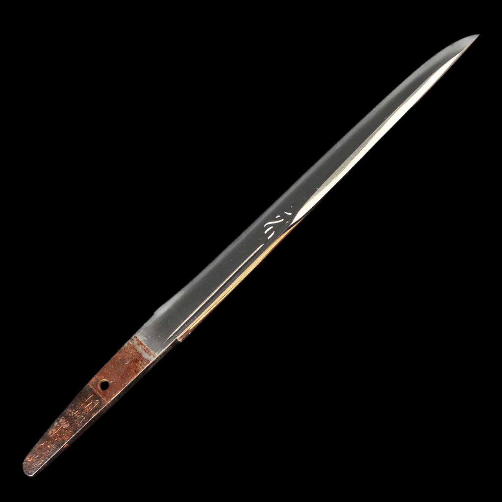 The unokubi structure further specializes the blade for thrusting. Both sides of the blade are carved with Sanskrit characters and grooves The Sanskrit characters depict Dainichi Nyorai (Mahavairocana Buddha) and Fudo Myo-o (Acala). This suggests it was likely a protective amulet blade.