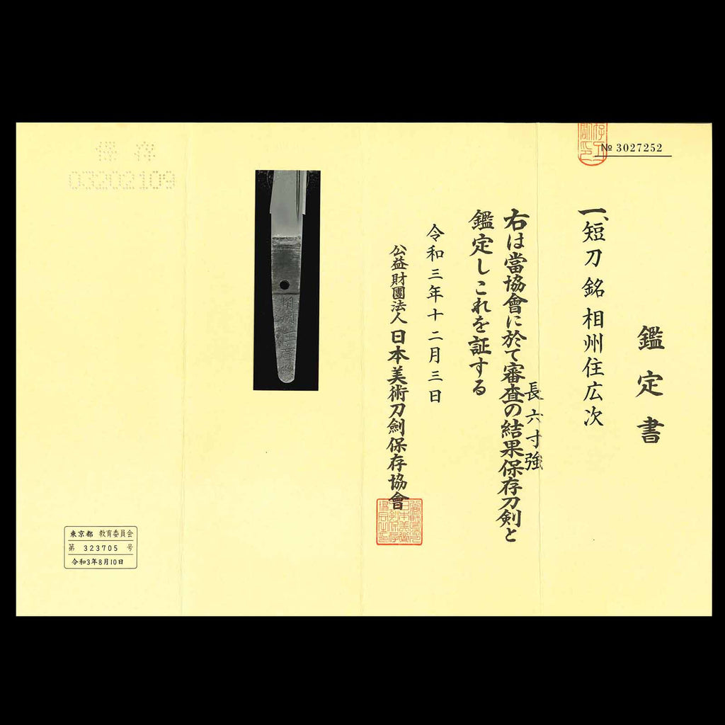 In December 2021, the Society for the Preservation of Japanese Art Swords authenticated this tanto as a genuine work by Hirotsugu and issued a Hozon certificate.