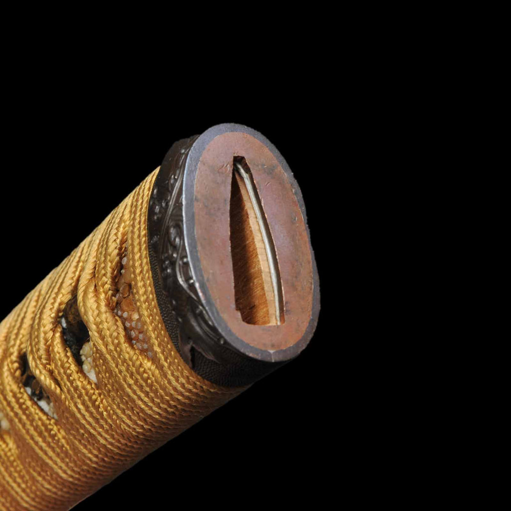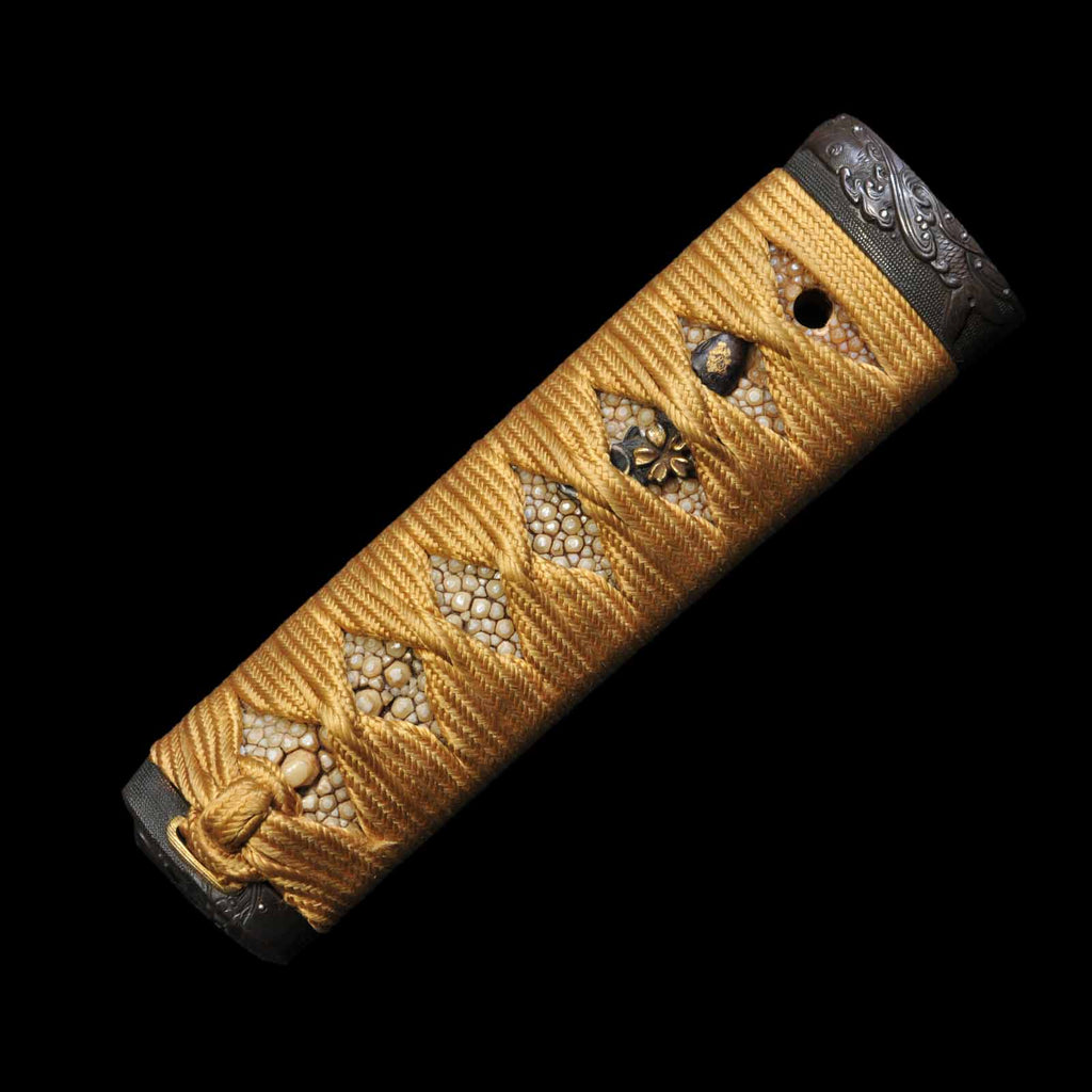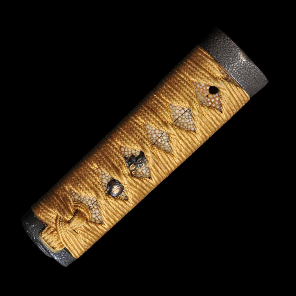 - Koshirae: Golden yellow silk Tsuka Hineri-maki with black Hakeme lacquered saya