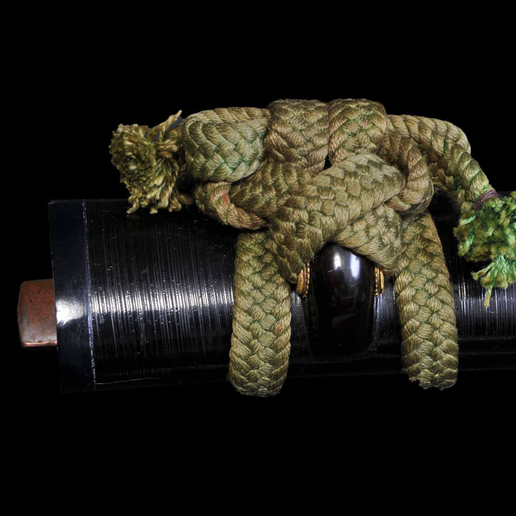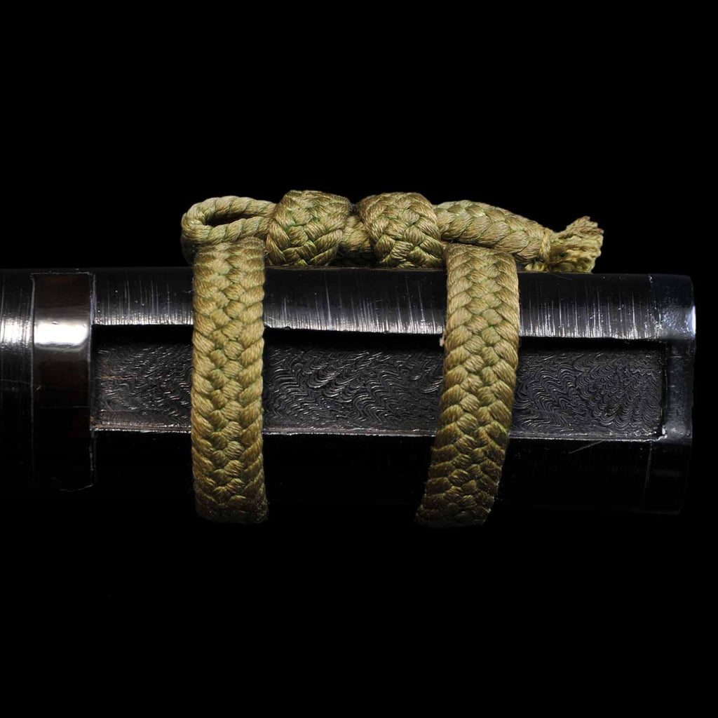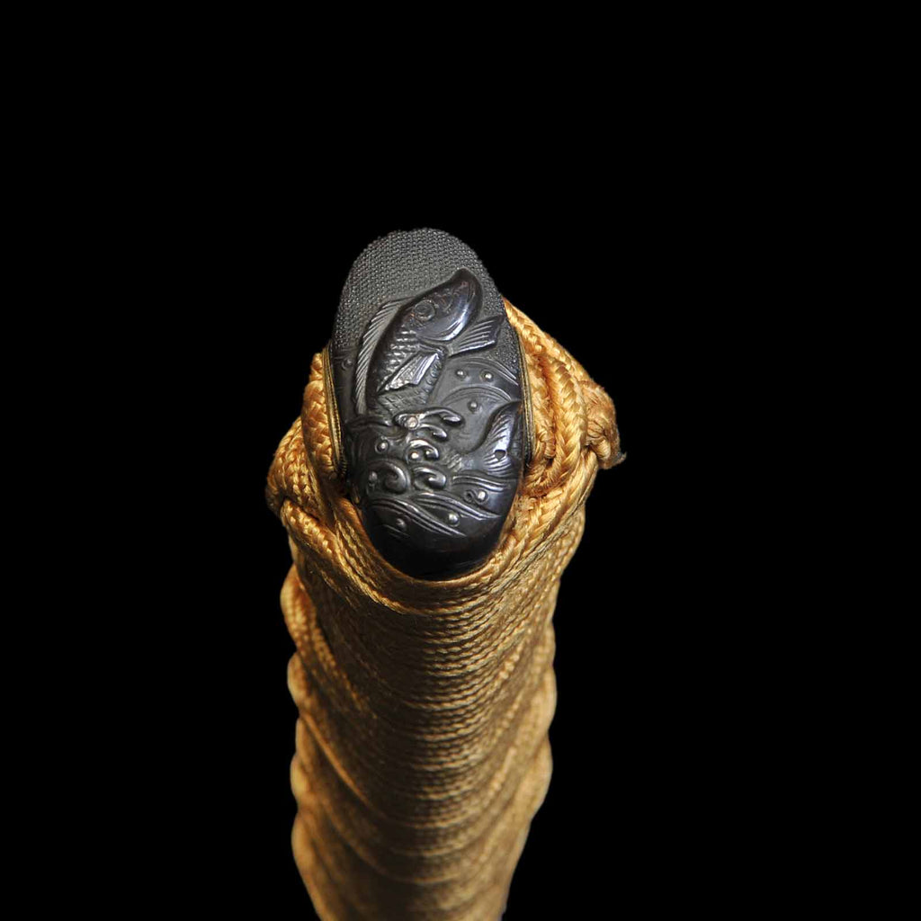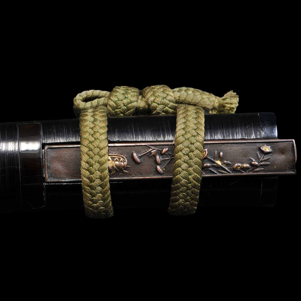 - Koshirae: Golden yellow silk Tsuka Hineri-maki with black Hakeme lacquered saya