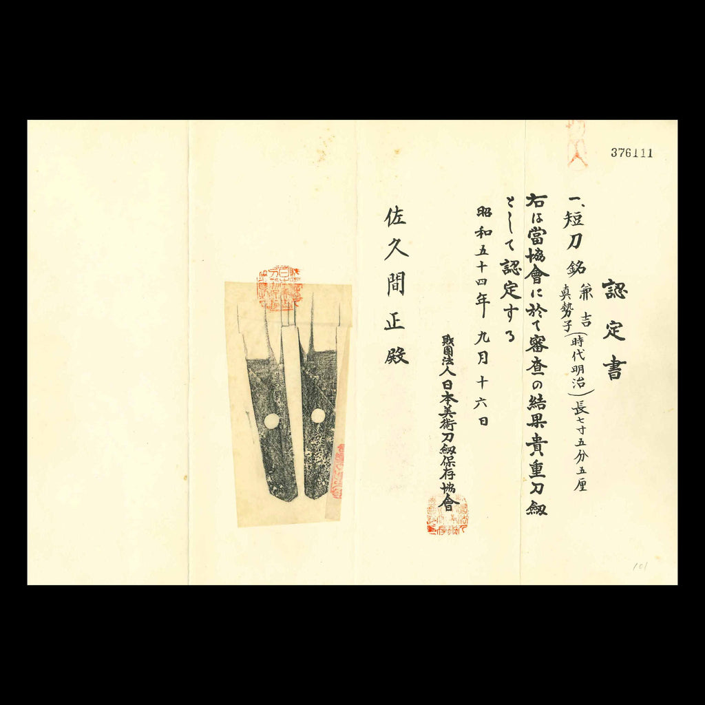 In September 1979, the Society for the Preservation of Japanese Art Swords certified this work as Kicho and issued the corresponding certificate. This tanto is an exceptional piece that can be appreciated by a wide range of enthusiasts, from beginners to collectors of Japanese swords.