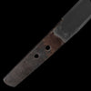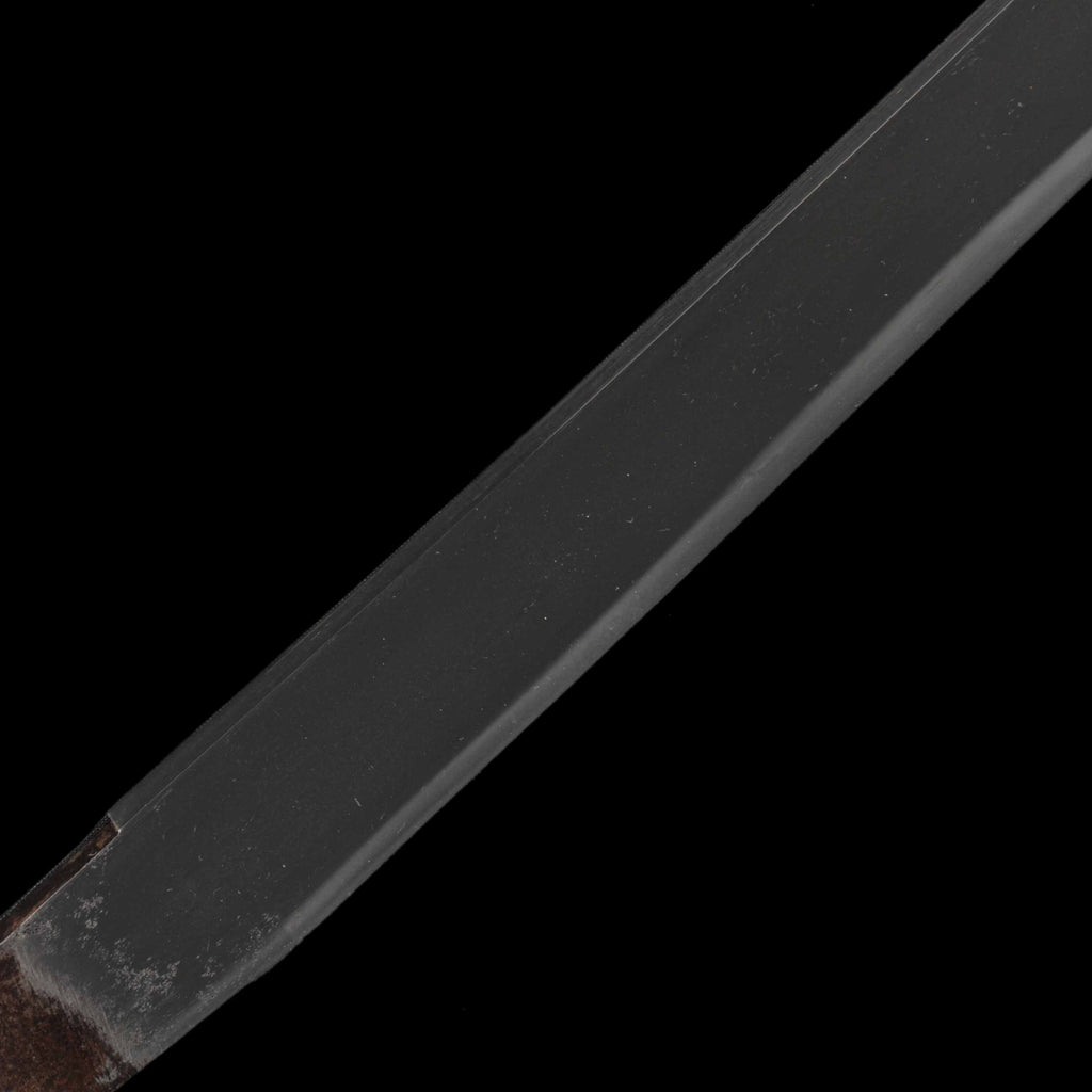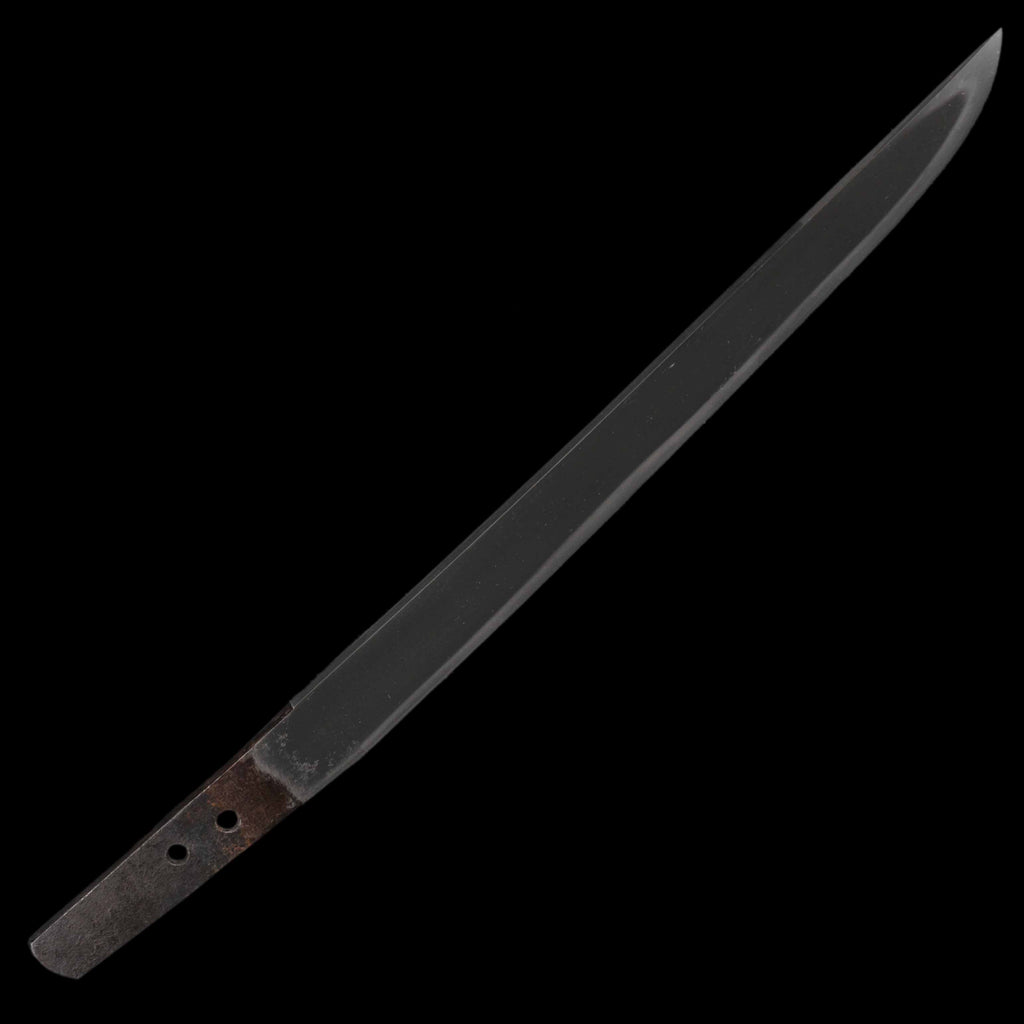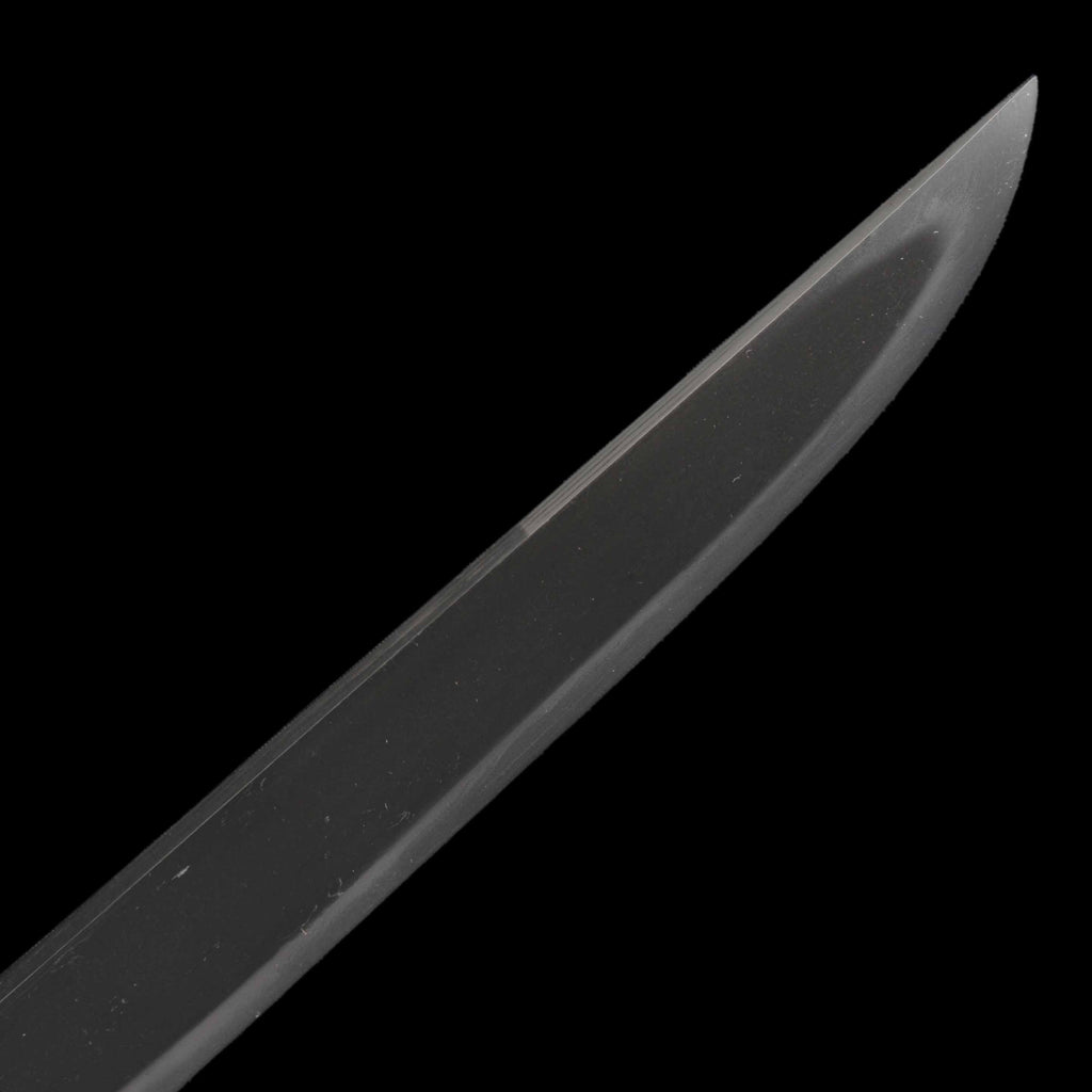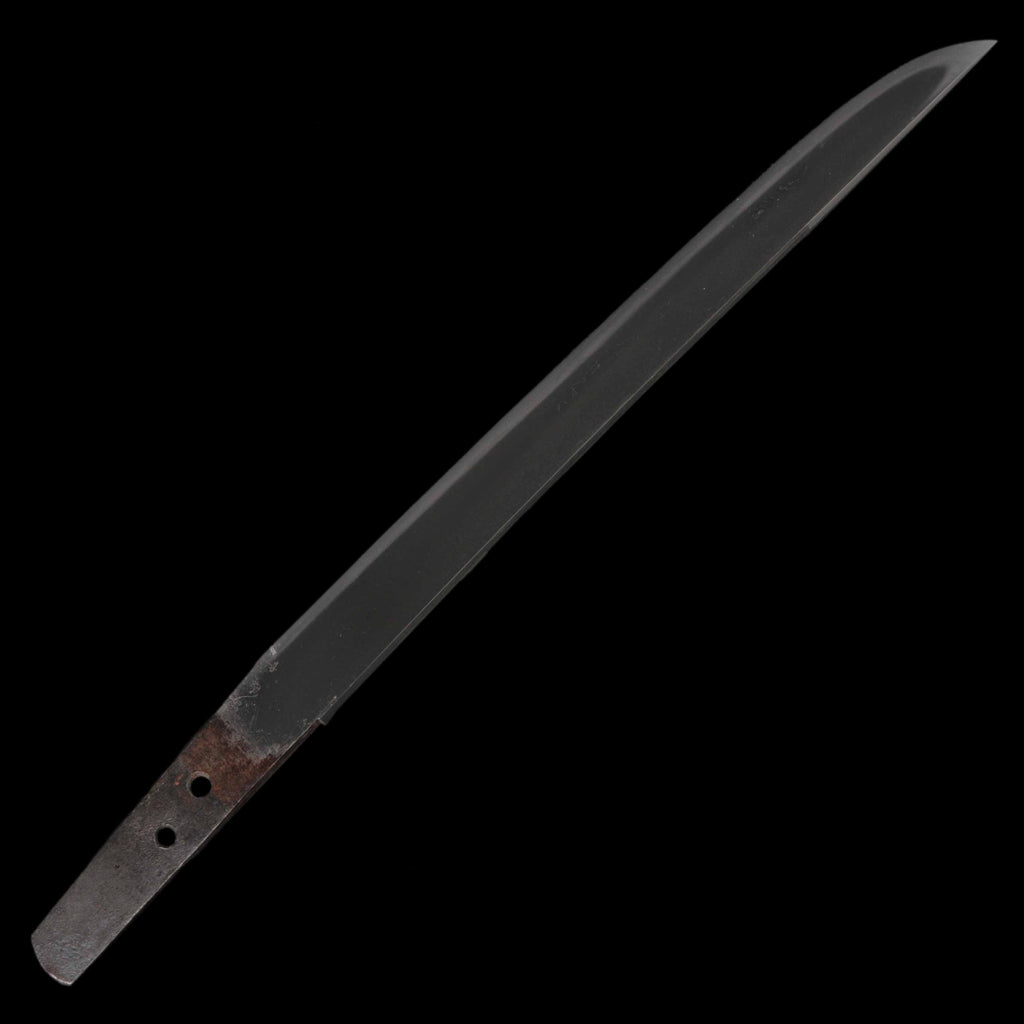 The entire blade is sharpened, and it is in excellent condition, a sound piece with virtually no forging flaws. The jigane has a well-packed itame grain, resulting in a very beautiful surface. The hamon is a fine, elegant suguha pattern with a nioi-deki finish.
