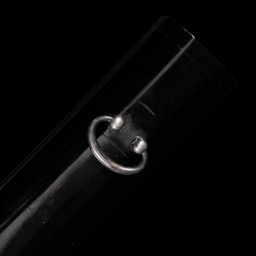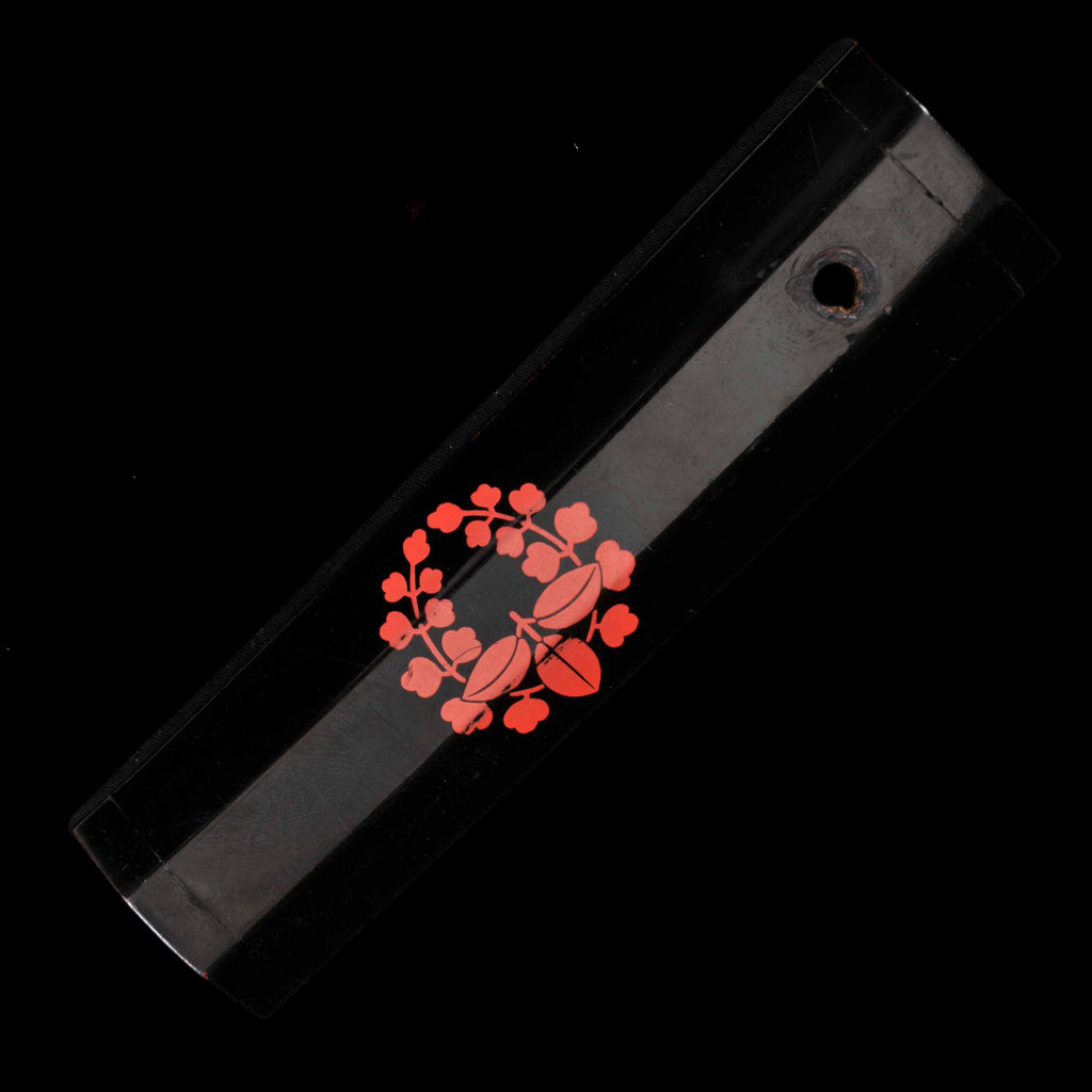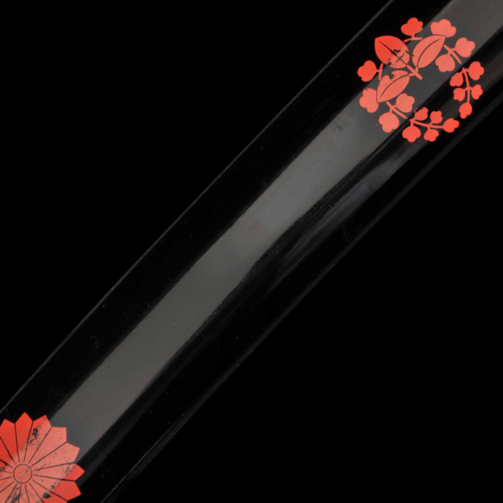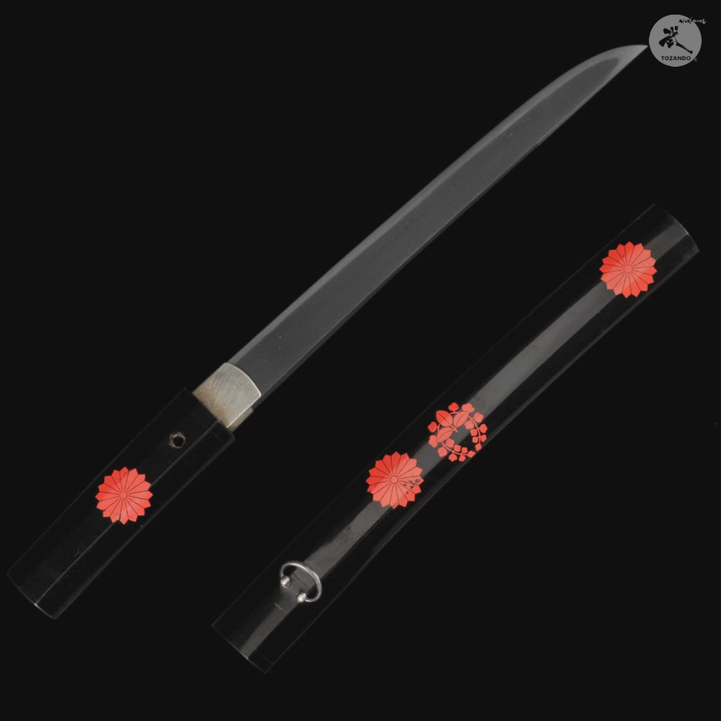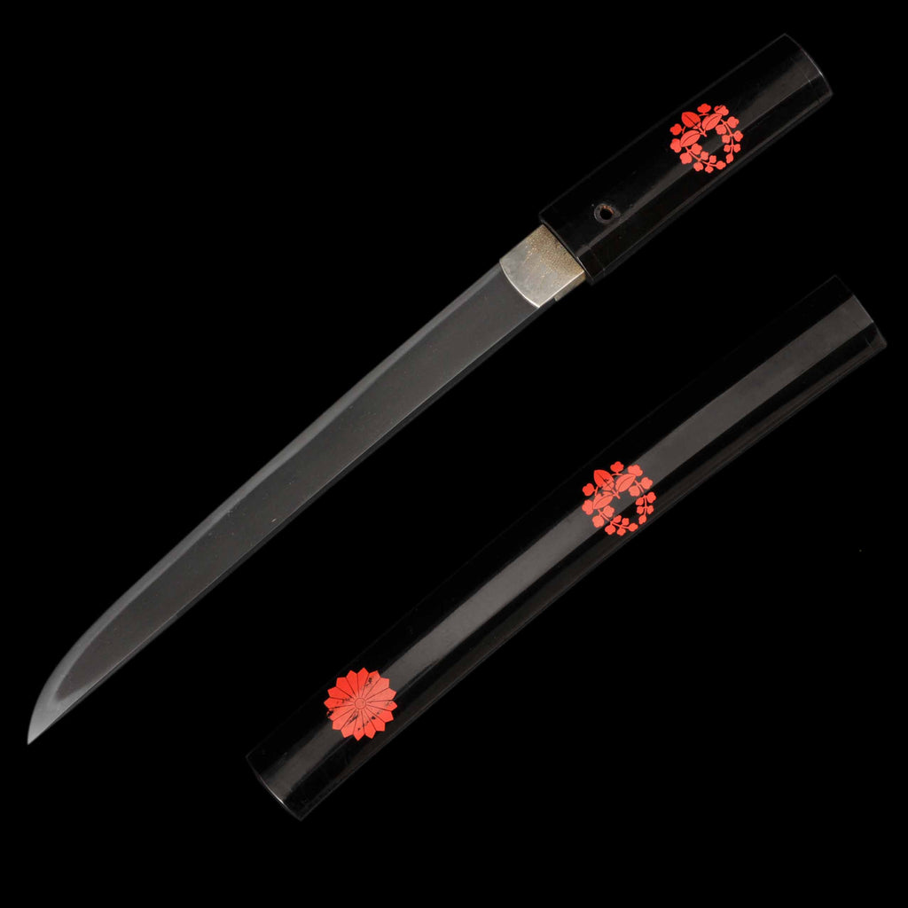 The koshirae is in the black-lacquered Aikuchi style, painted with two family crests: the sword-chrysanthemum and the cascading wisteria. It is likely this tanto was commissioned as a celebratory gift for a wedding between families bearing these respective crests.