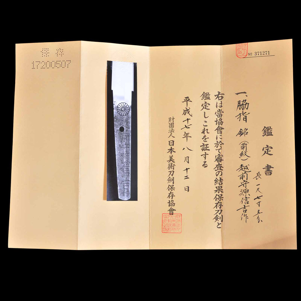 - Signature: [Chrysanthemum Crest] Echizen no Kami Minamoto no Nobuyoshi Saku(front)